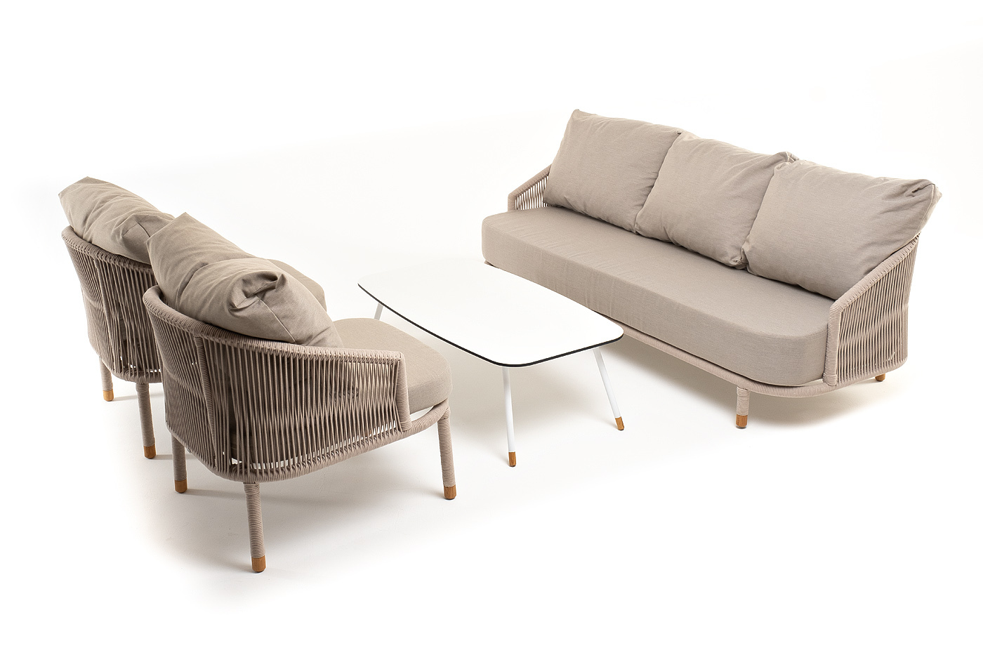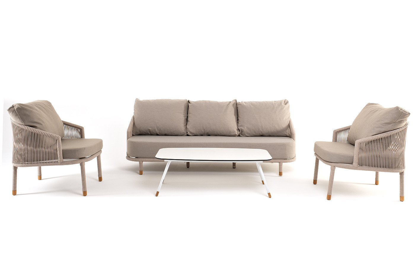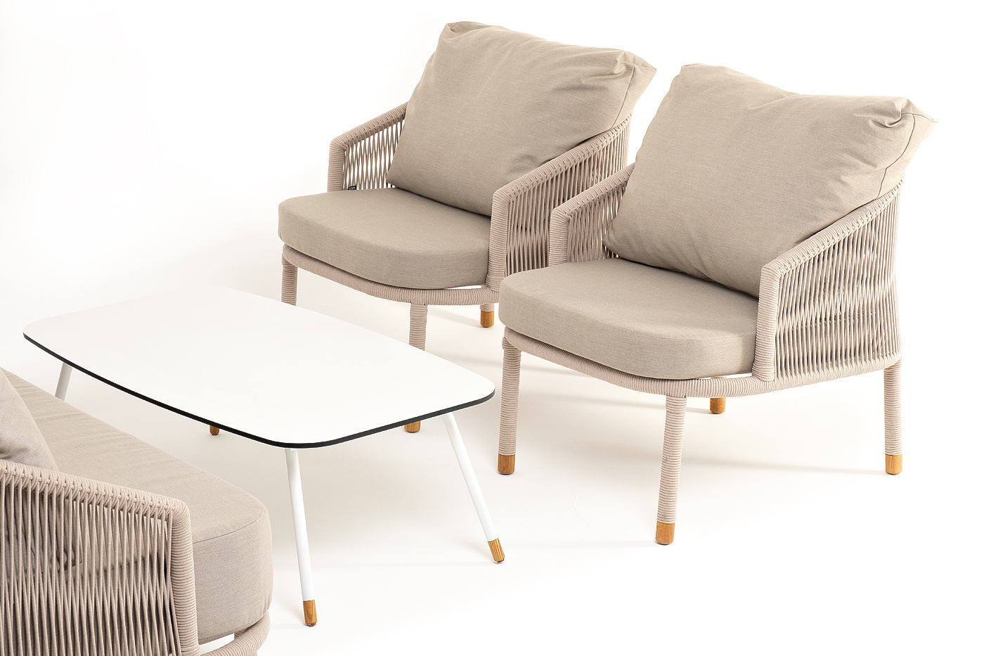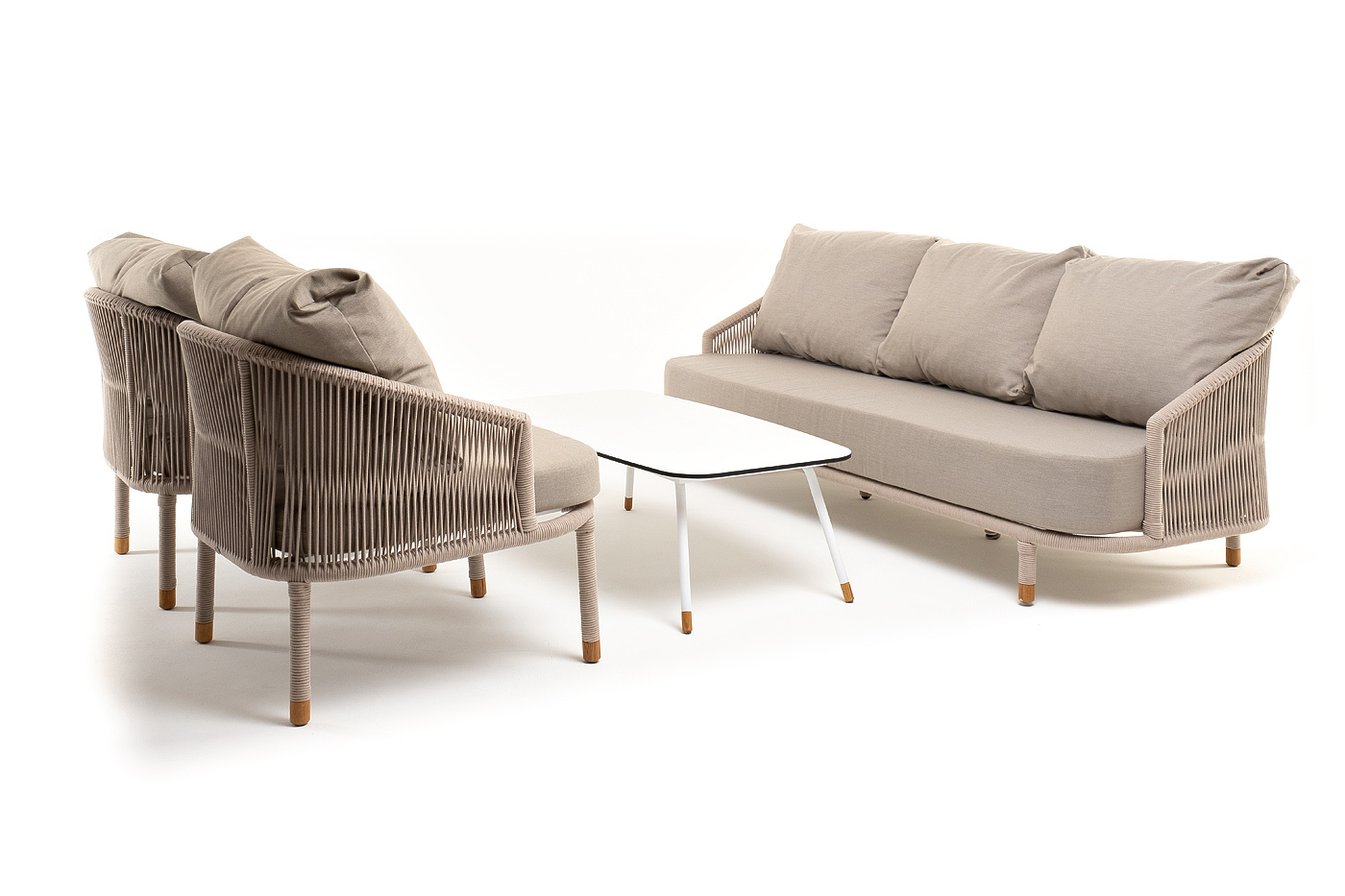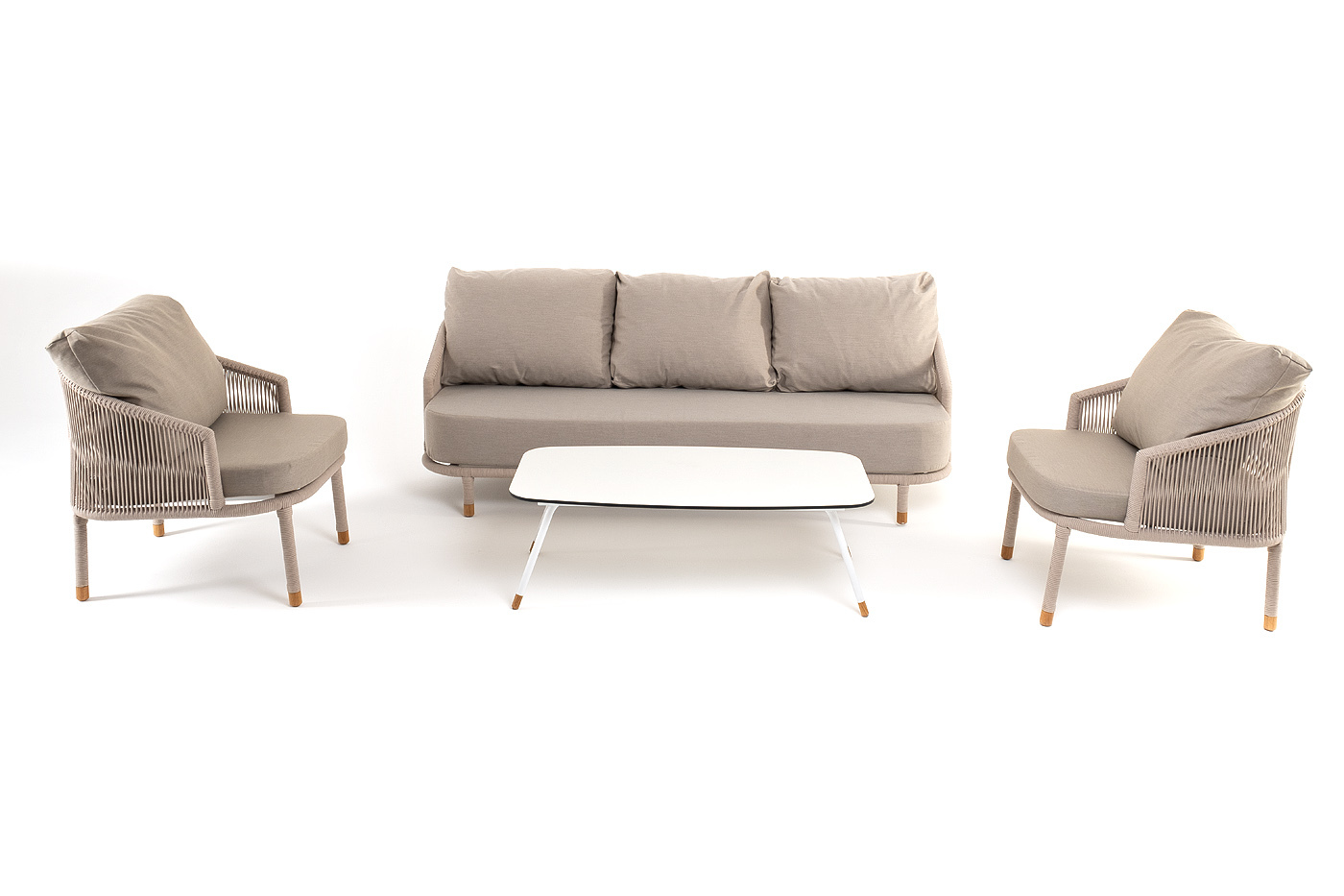 Каркас дивана и кресел из алюминия с белым муаровым покрытием, оплетен вручную бежевым роупом. Подушки из полиэстера. Столик «Диего» с алюминиевым каркасом и столешницей из HPL «молочный».