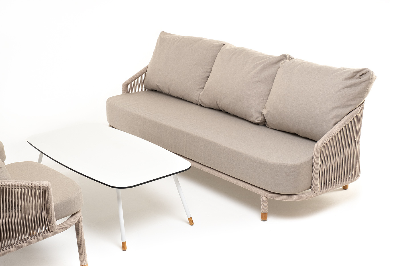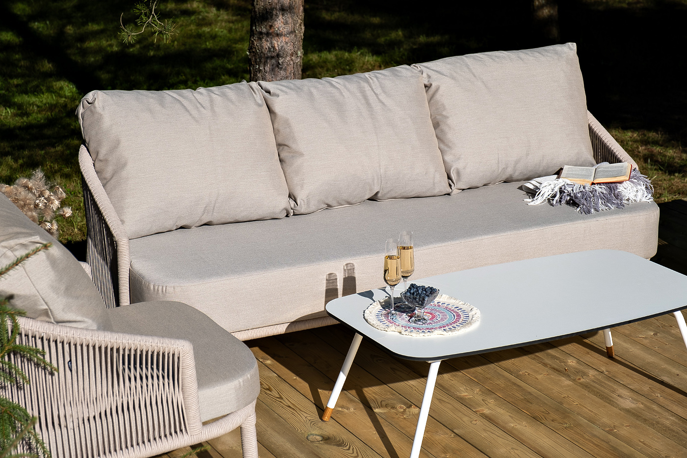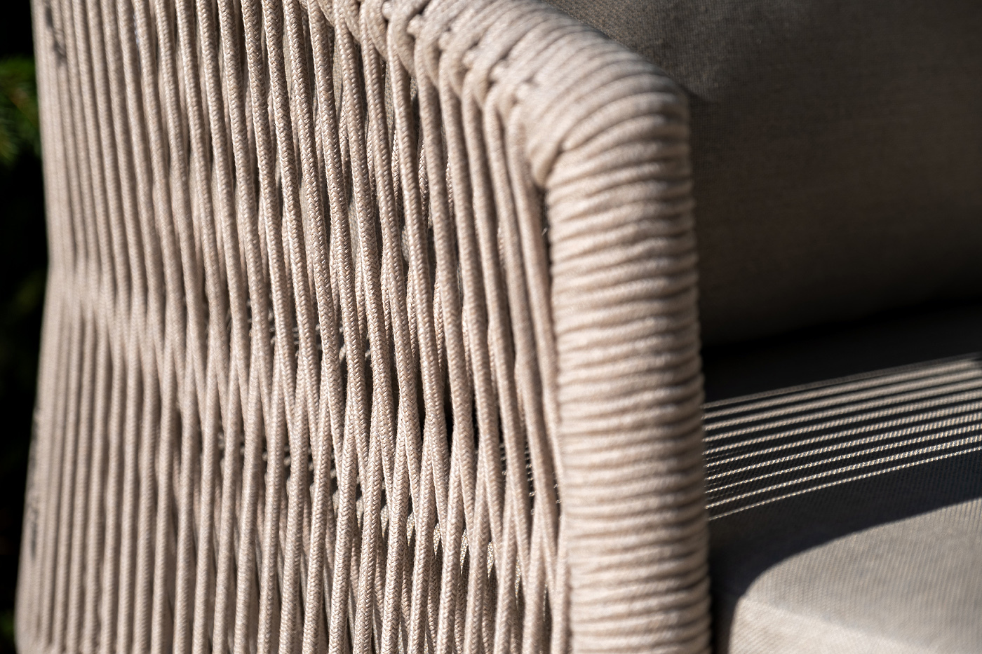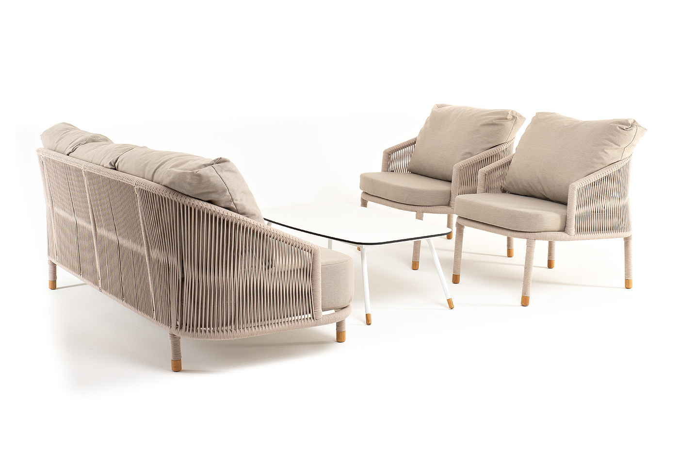Каркас дивана и кресел из алюминия с белым муаровым покрытием, оплетен вручную бежевым роупом. Подушки из полиэстера. Столик «Диего» с алюминиевым каркасом и столешницей из HPL «молочный».