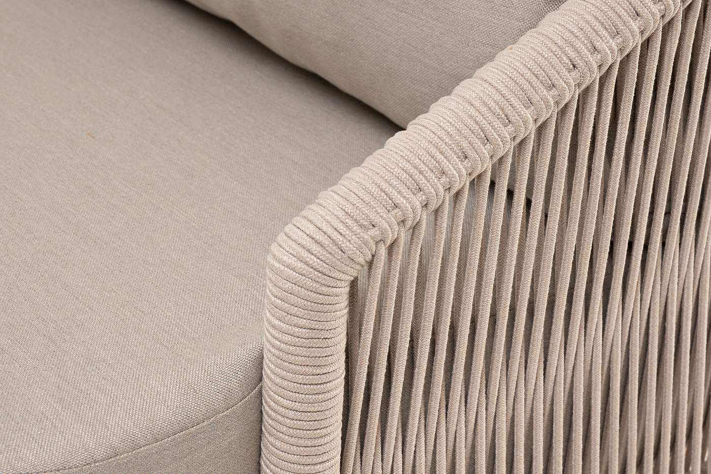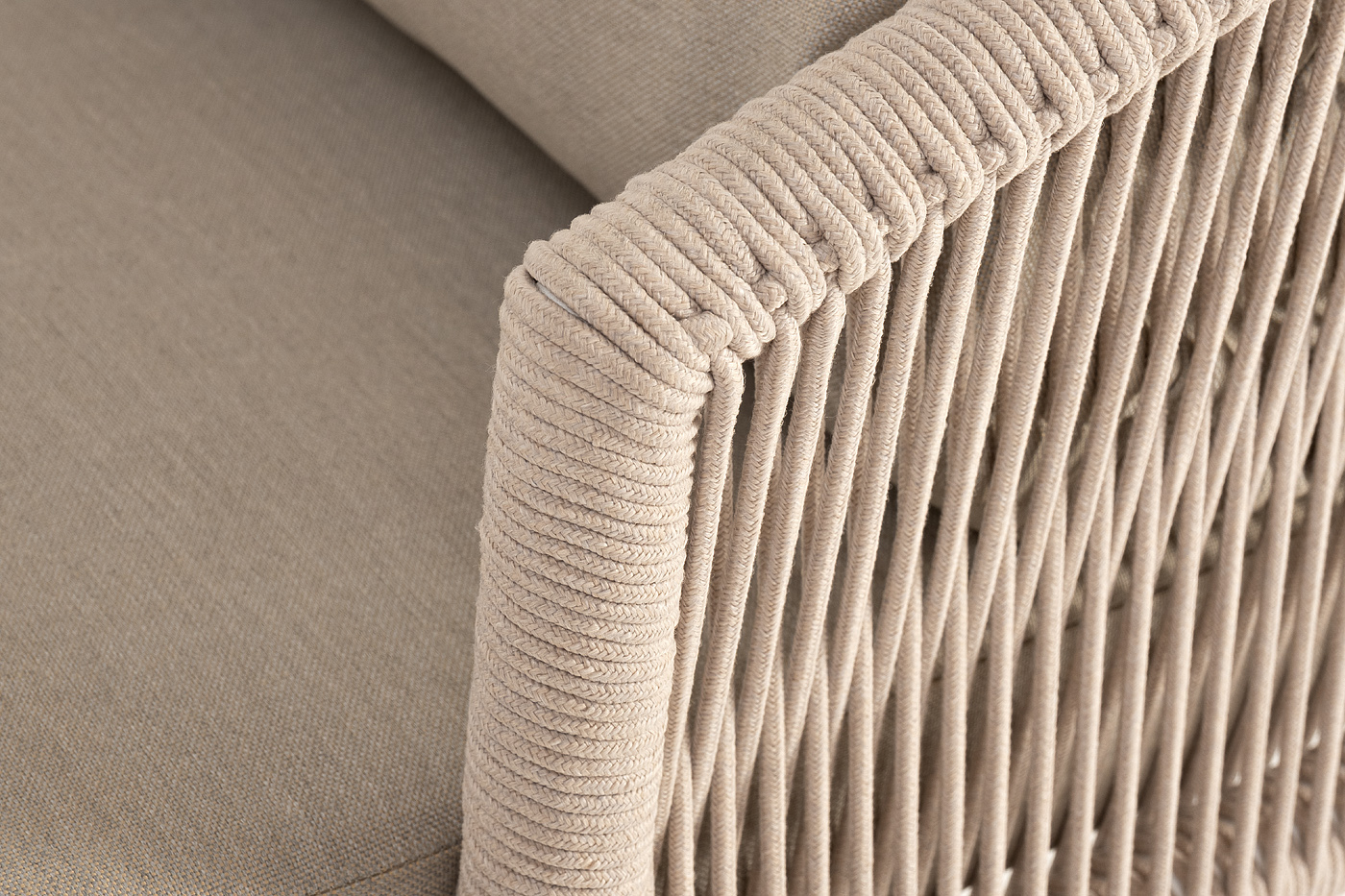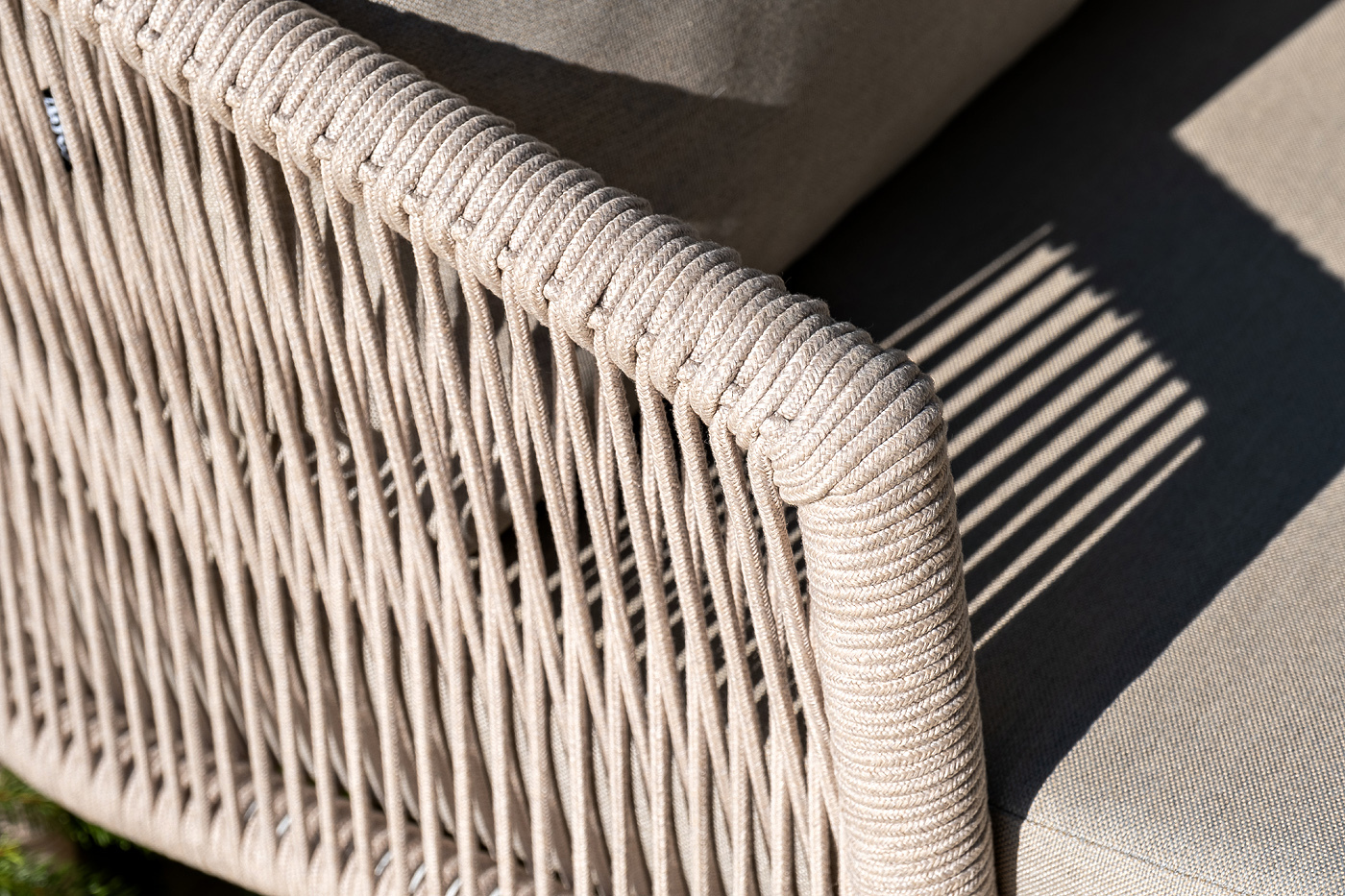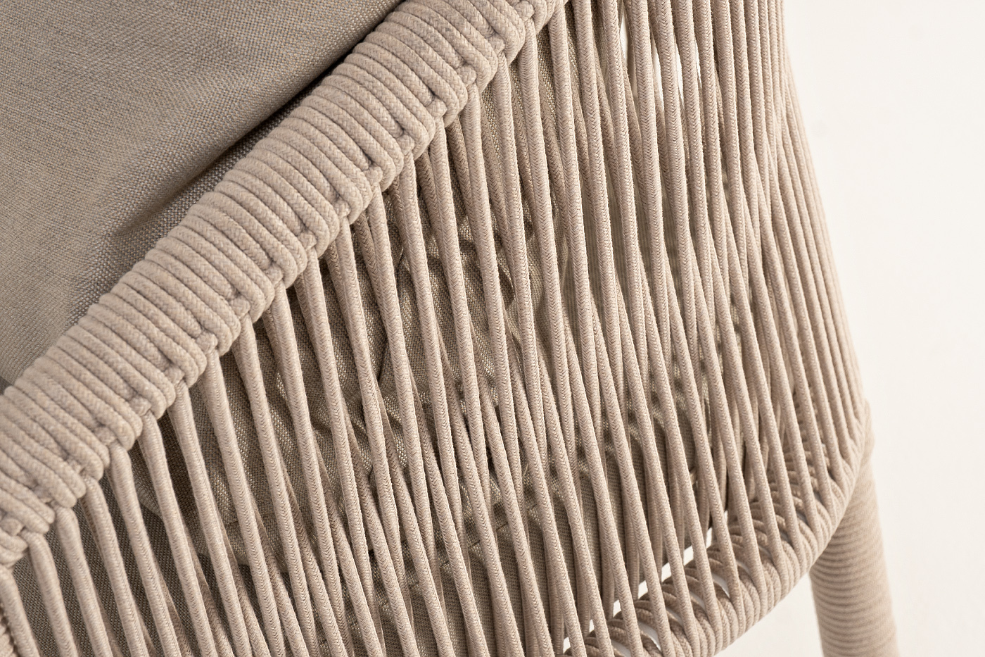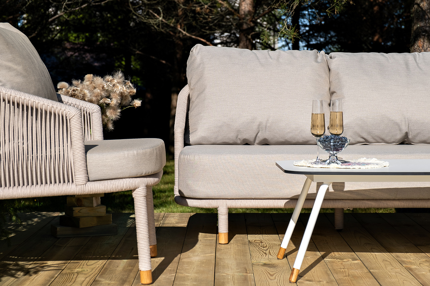 Каркас дивана и кресел из алюминия с белым муаровым покрытием, оплетен вручную бежевым роупом. Подушки из полиэстера. Столик «Диего» с алюминиевым каркасом и столешницей из HPL «молочный».
