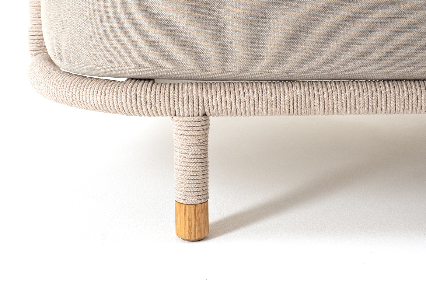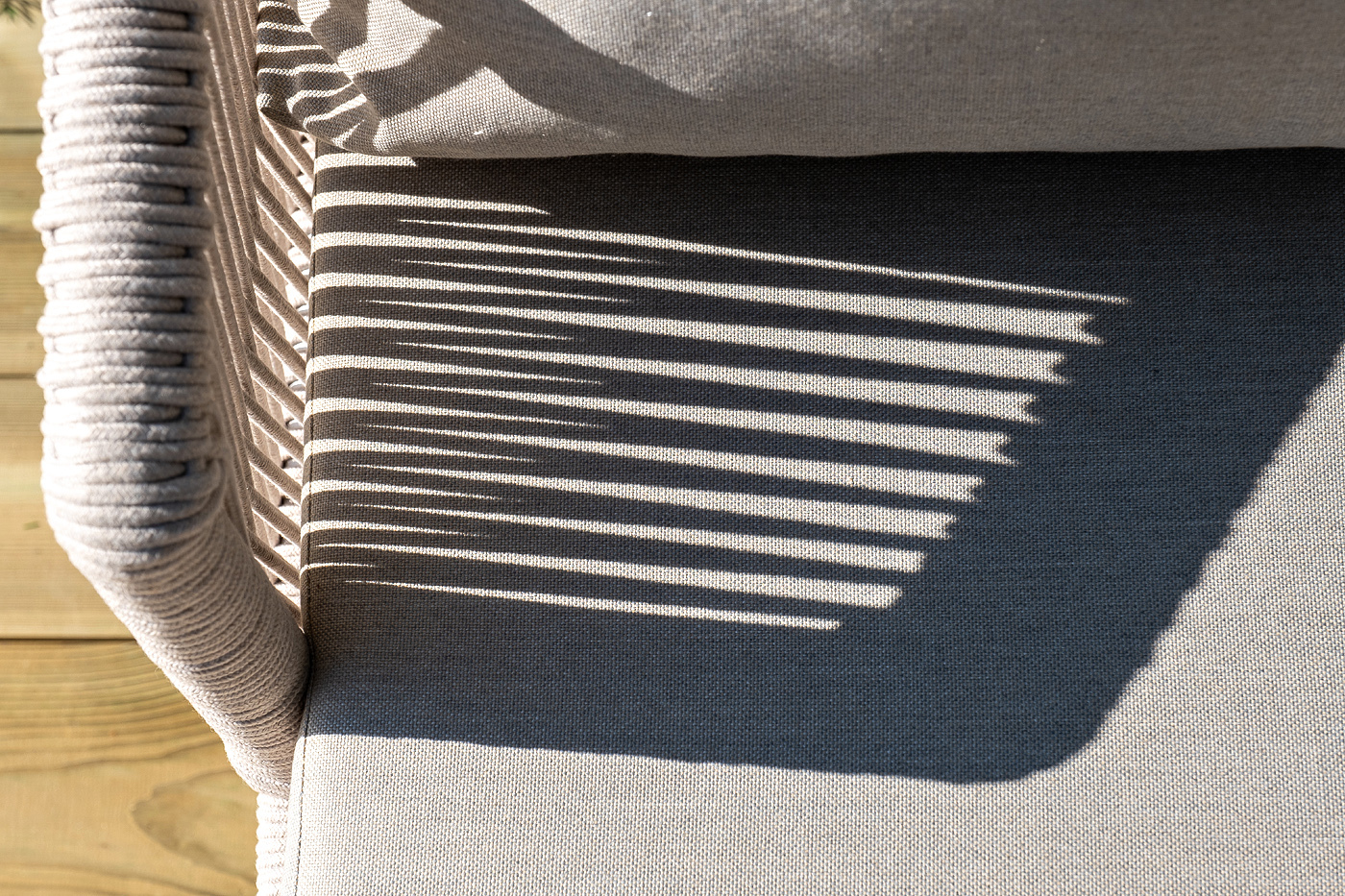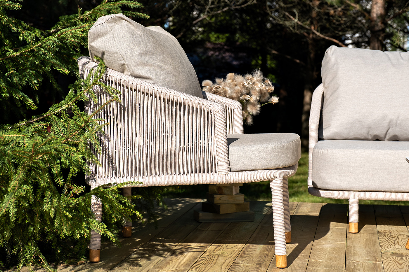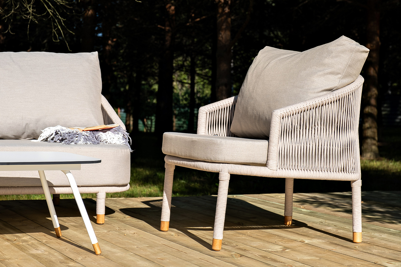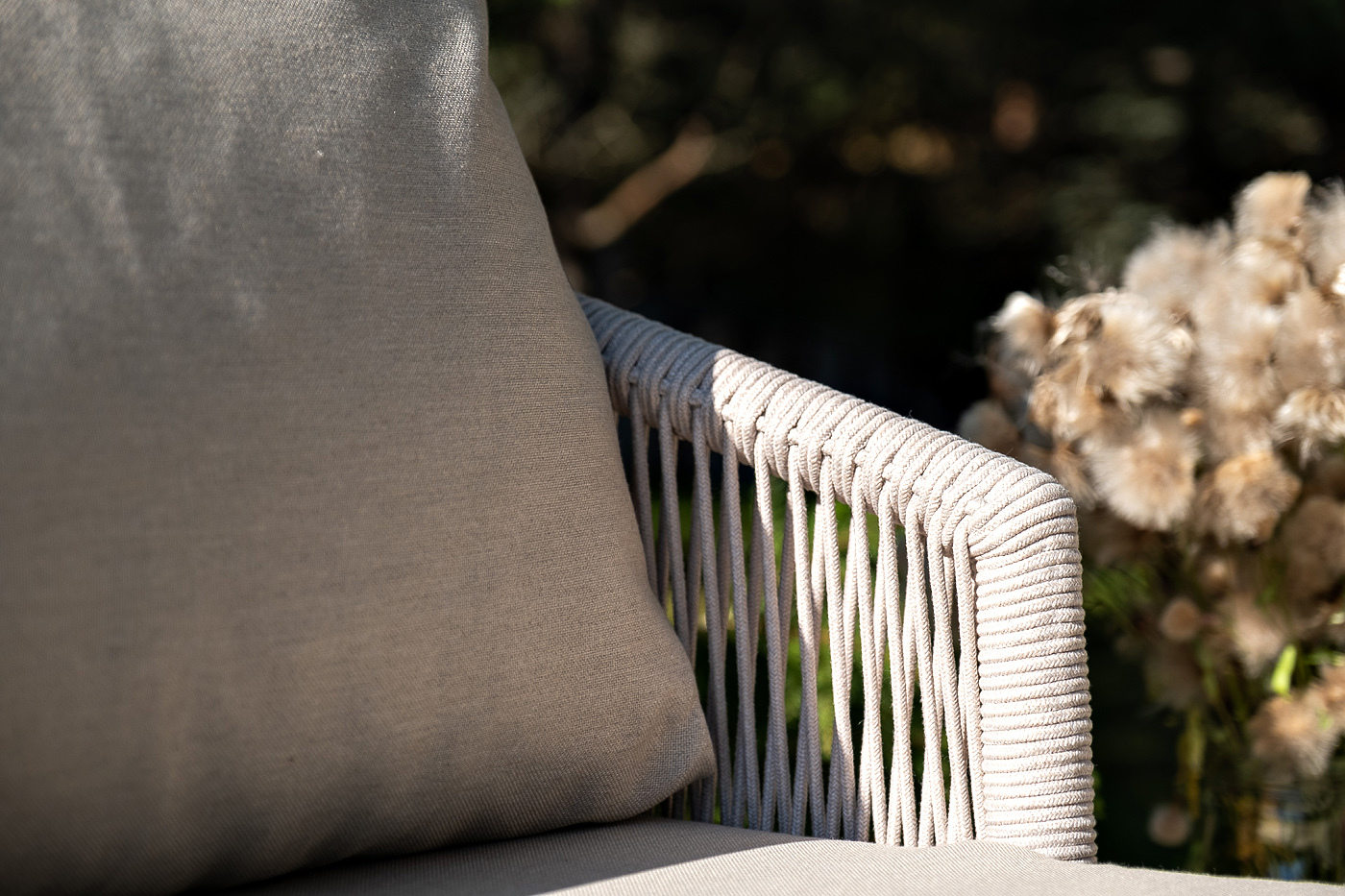 Каркас дивана и кресел из алюминия с белым муаровым покрытием, оплетен вручную бежевым роупом. Подушки из полиэстера. Столик «Диего» с алюминиевым каркасом и столешницей из HPL «молочный».