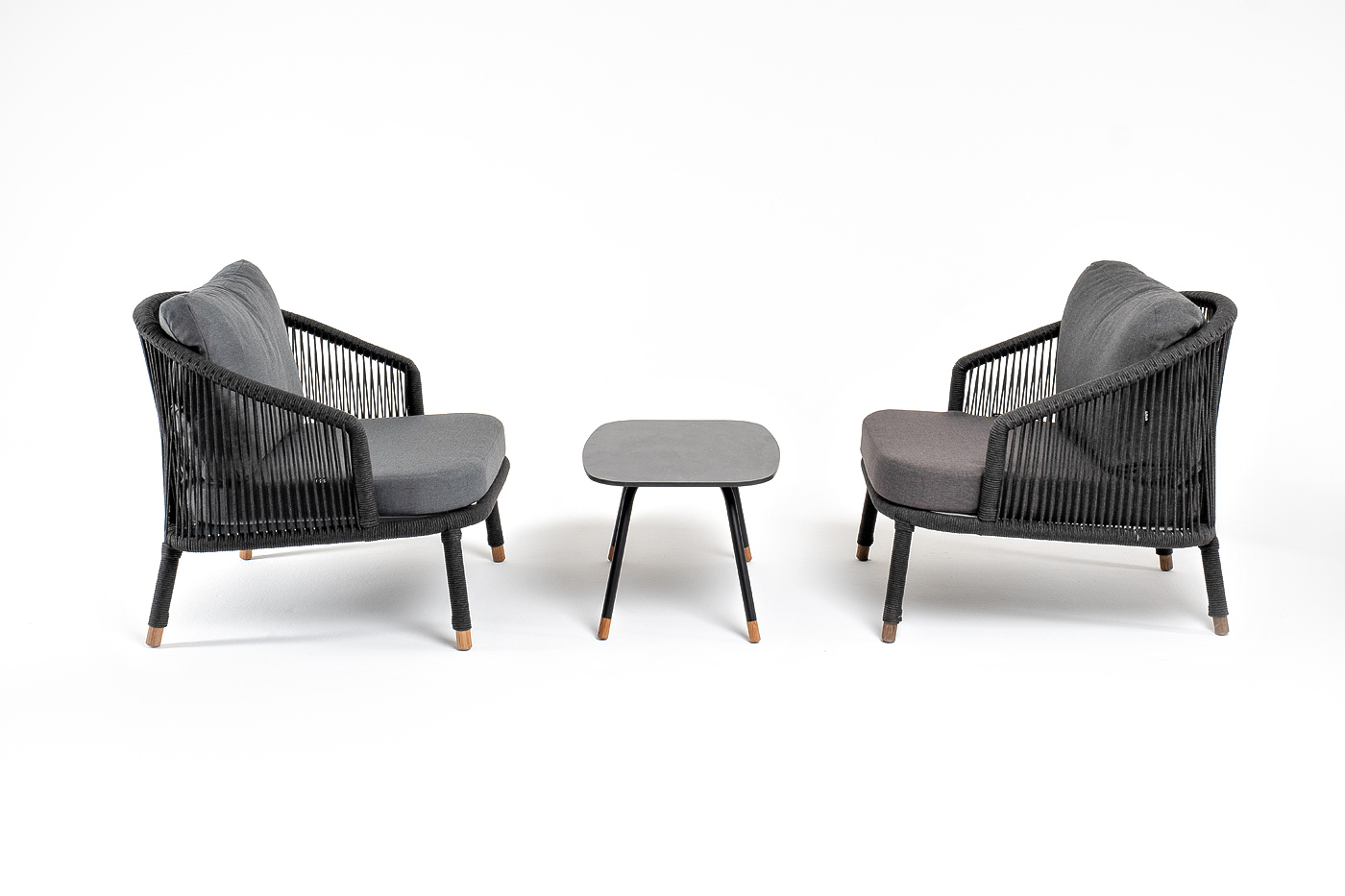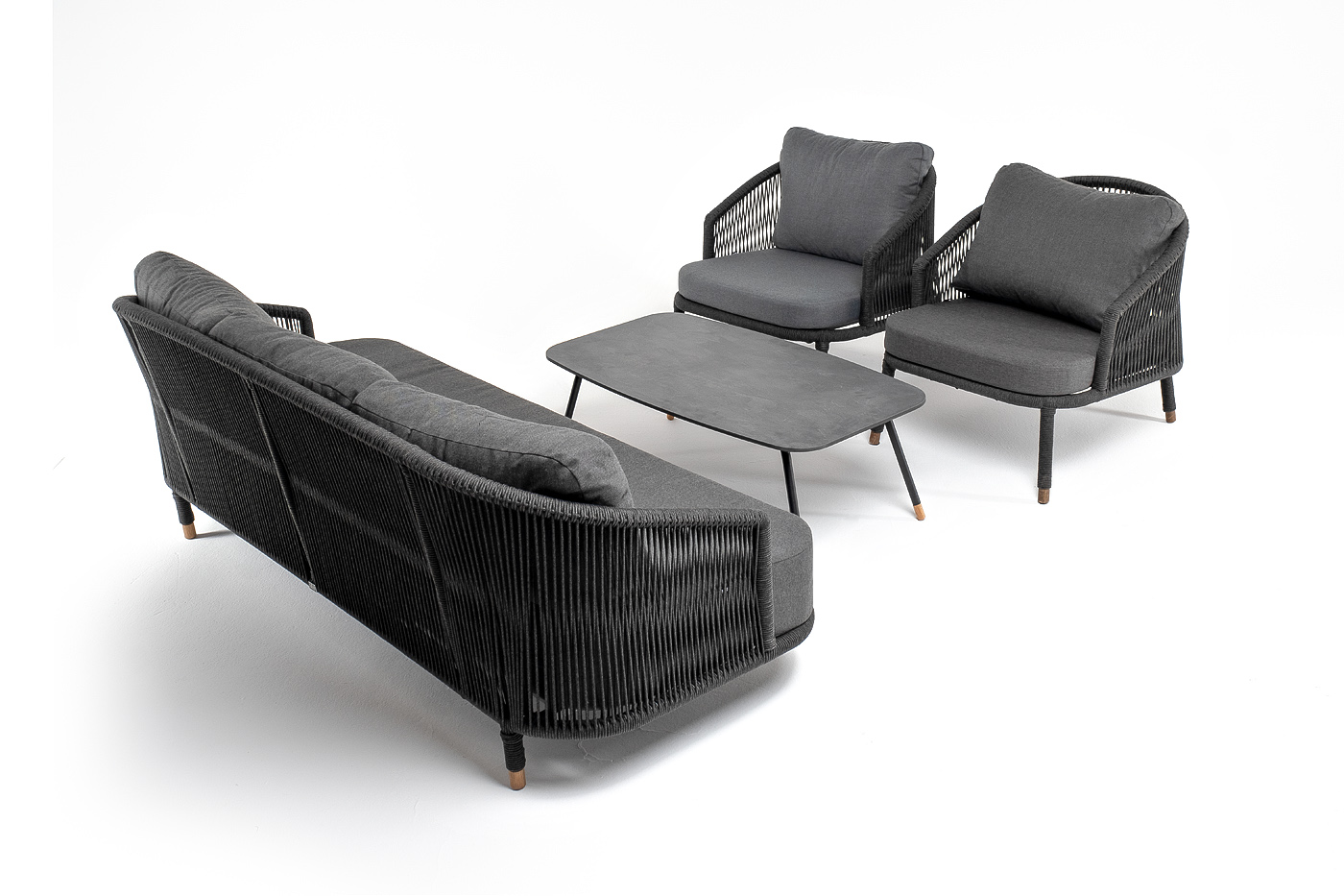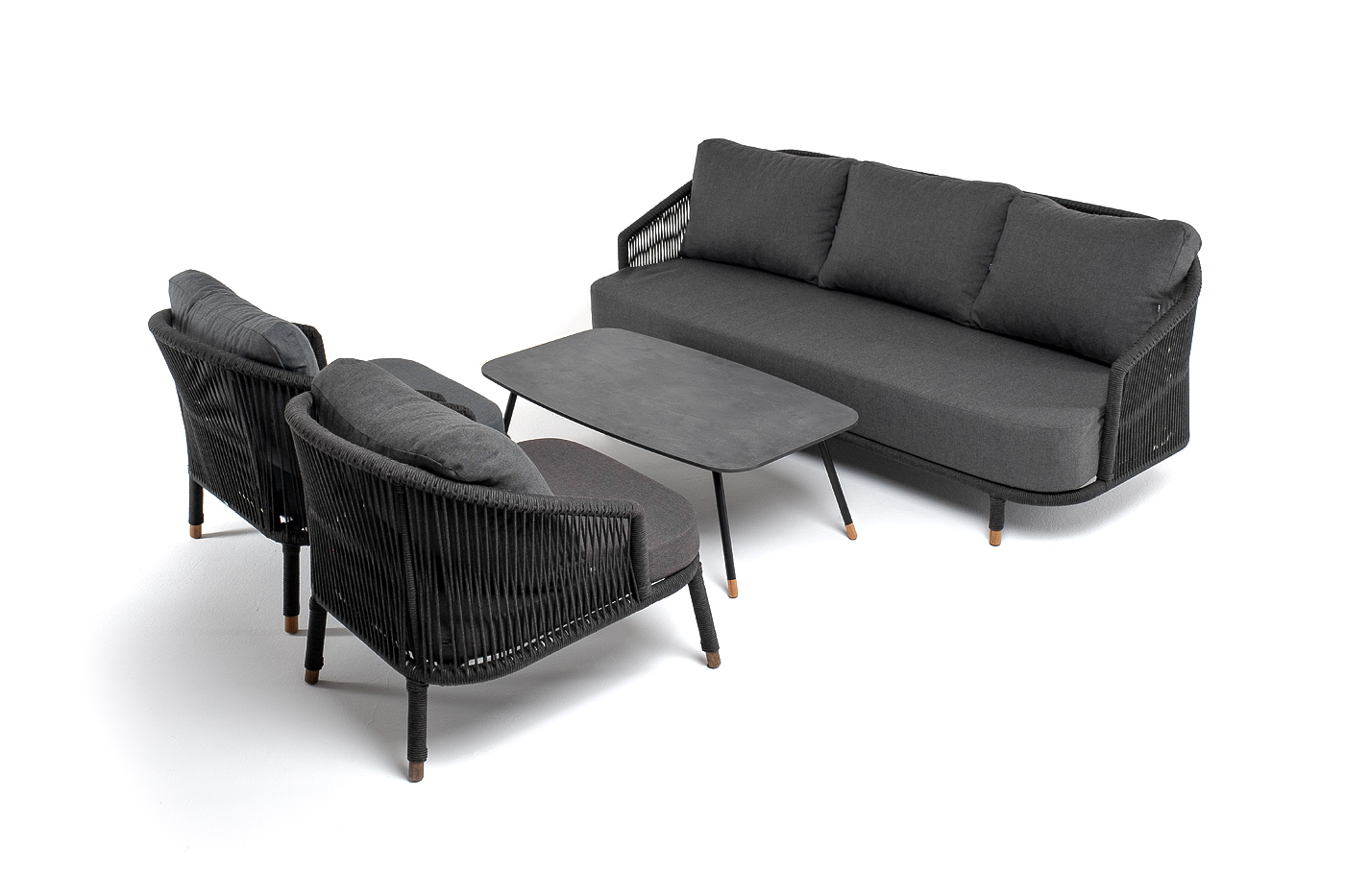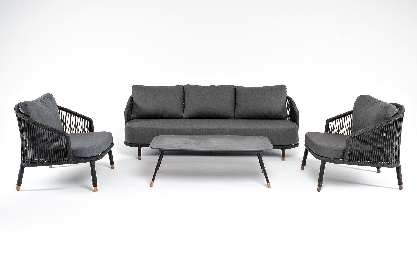 Каркас дивана и кресел из алюминия с покрытием темно-серый муар (RAL7024), оплетен вручную темно-серым роупом. Подушки из полиэстера темно-серого цвета (027). Столик с черным каркасом и столешницей из HPL «серый гранит». На ножках — дубовые наконечники.