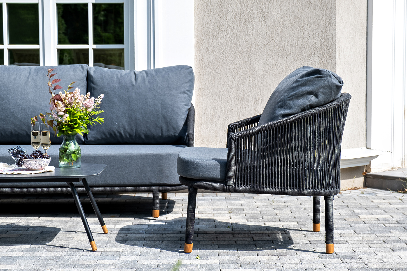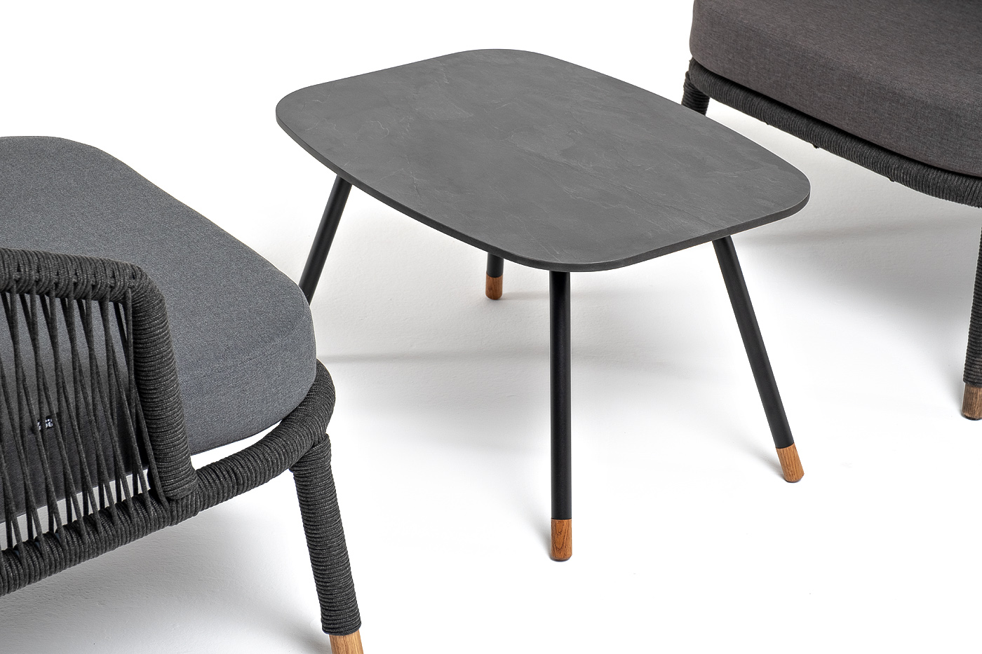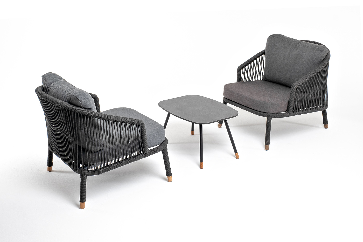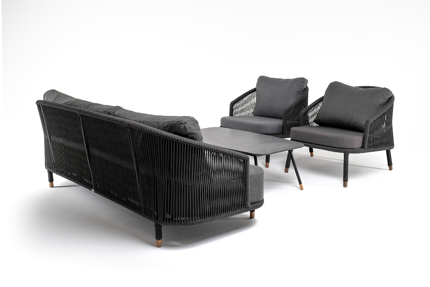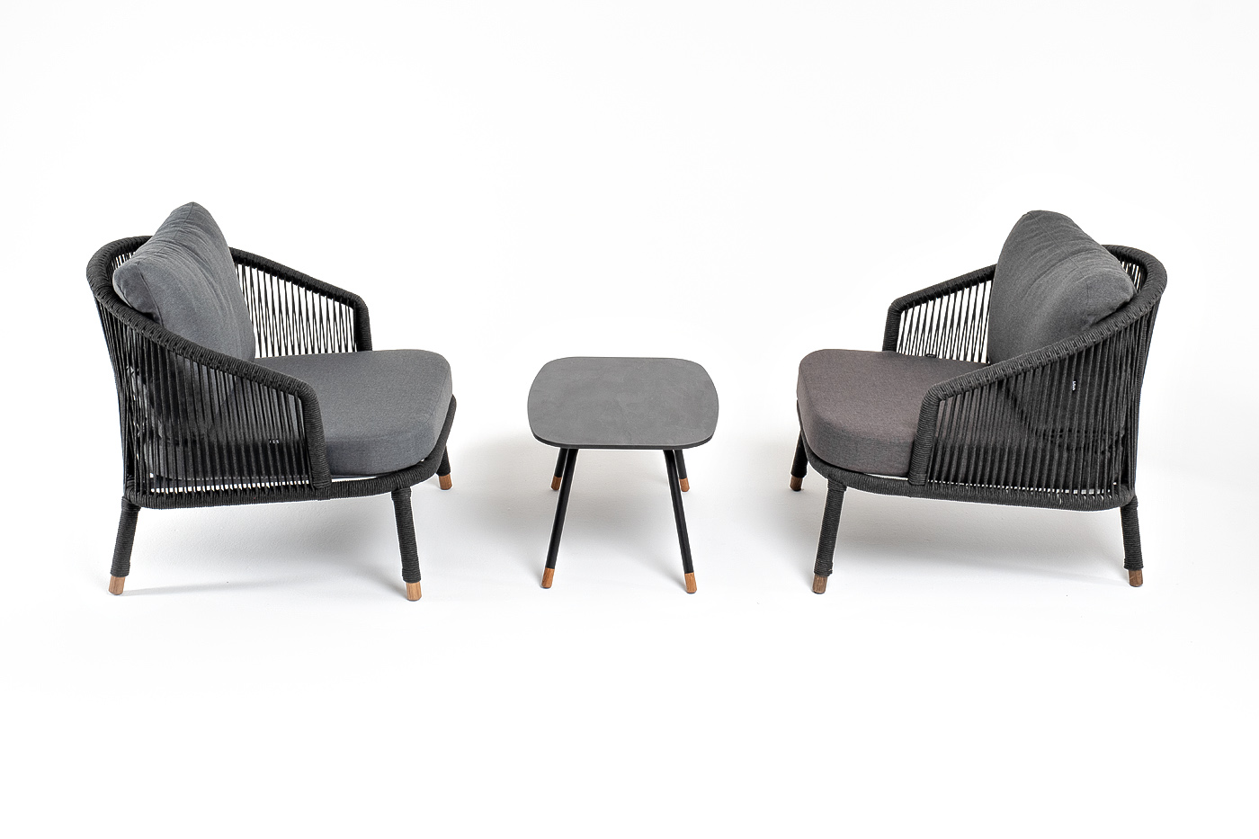 Каркас дивана и кресел из алюминия с покрытием темно-серый муар (RAL7024), оплетен вручную темно-серым роупом. Подушки из полиэстера темно-серого цвета (027). Столик с черным каркасом и столешницей из HPL «серый гранит». На ножках — дубовые наконечники.