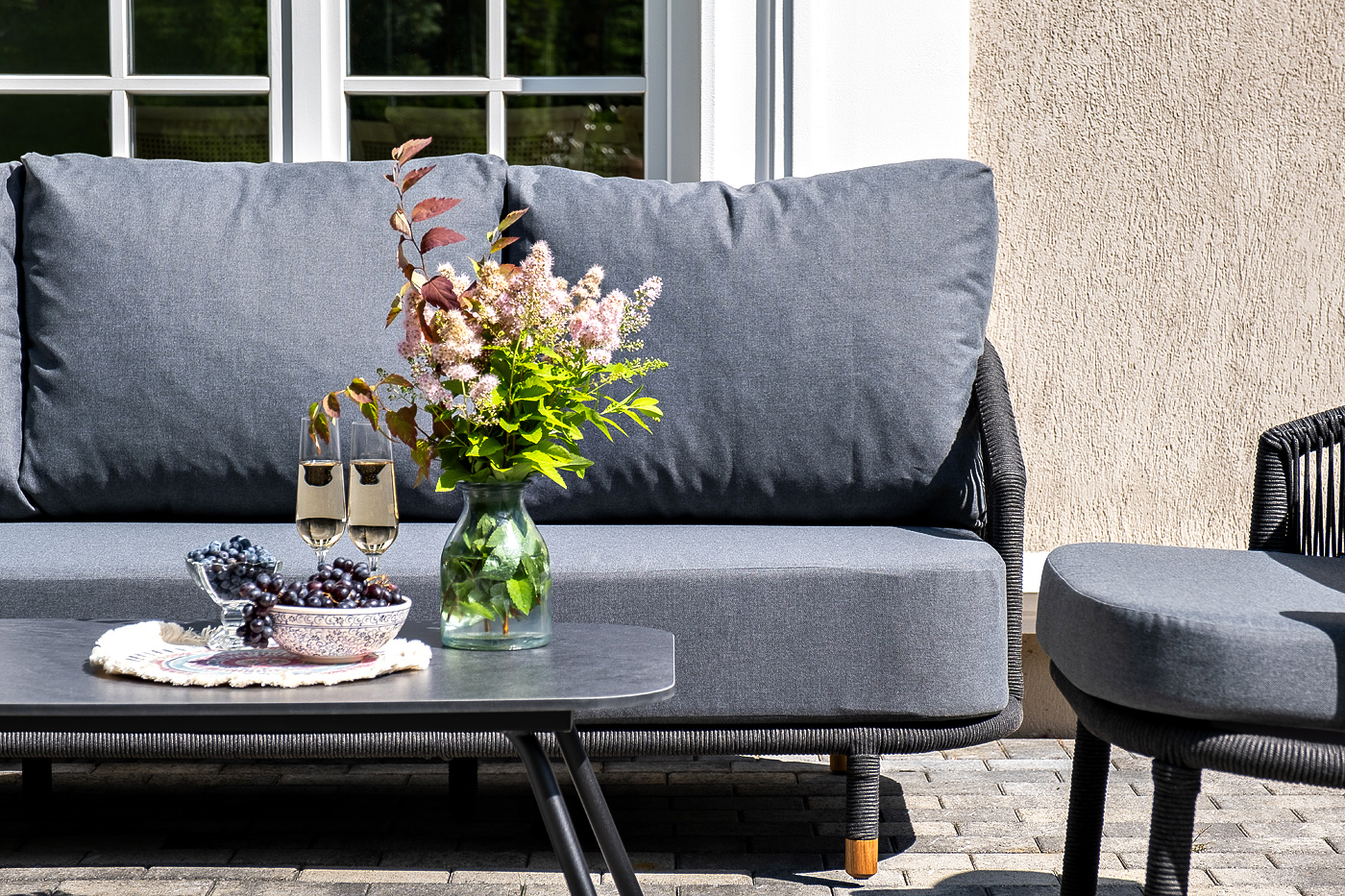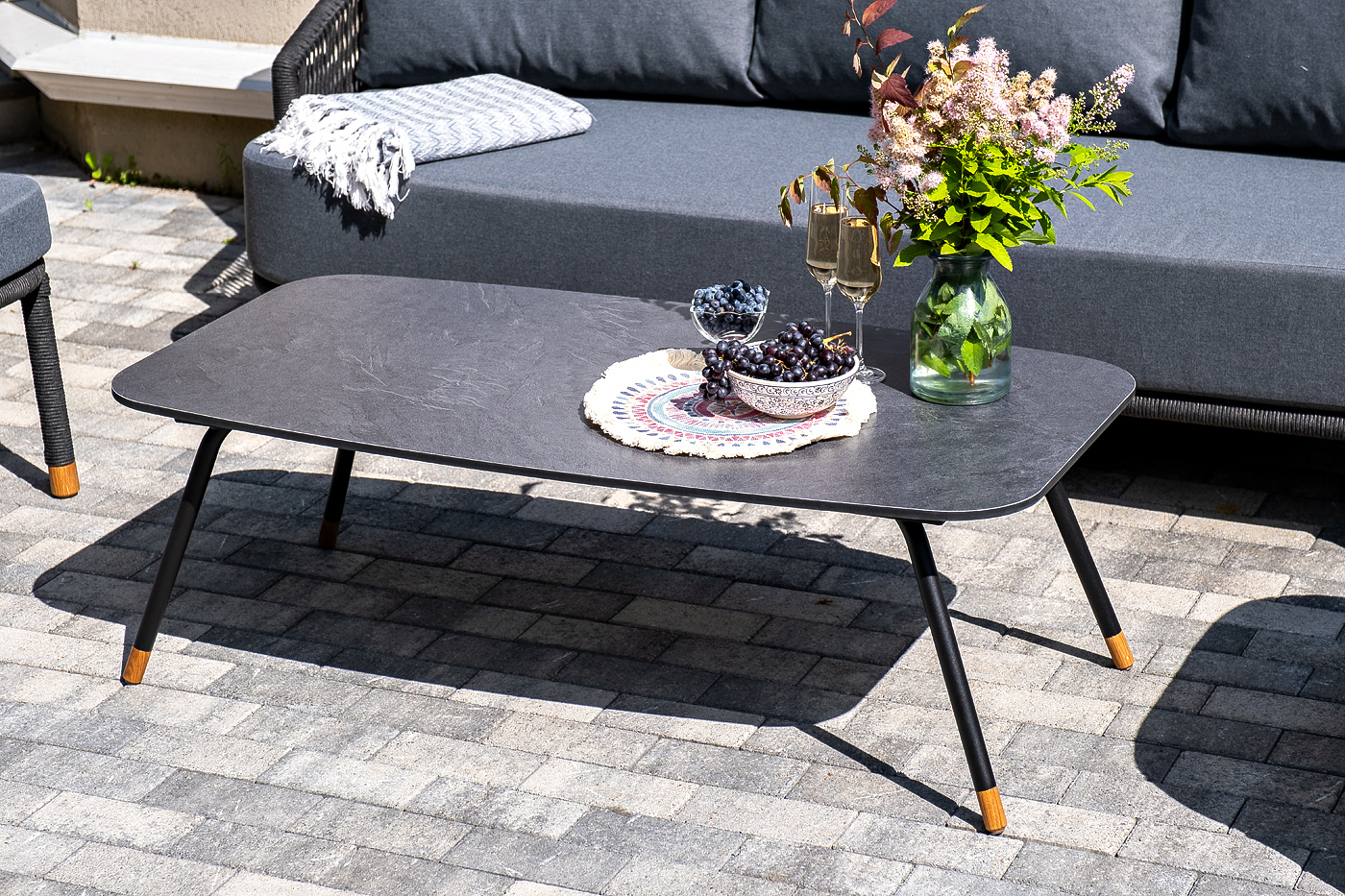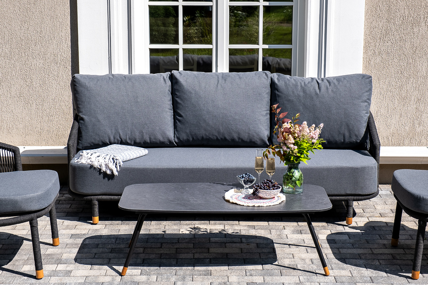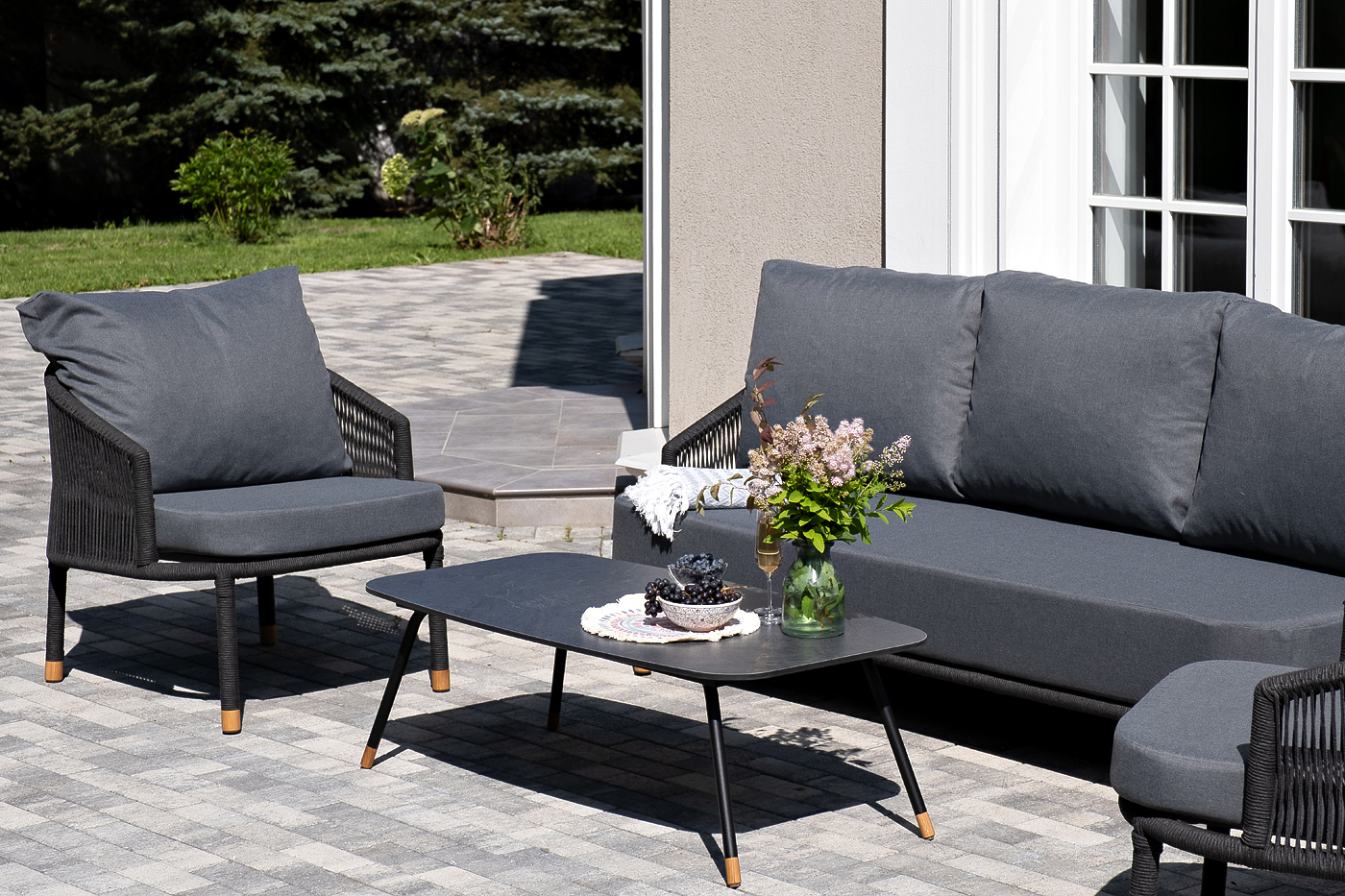 Каркас дивана и кресел из алюминия с покрытием темно-серый муар (RAL7024), оплетен вручную темно-серым роупом. Подушки из полиэстера темно-серого цвета (027). Столик с черным каркасом и столешницей из HPL «серый гранит». На ножках — дубовые наконечники.