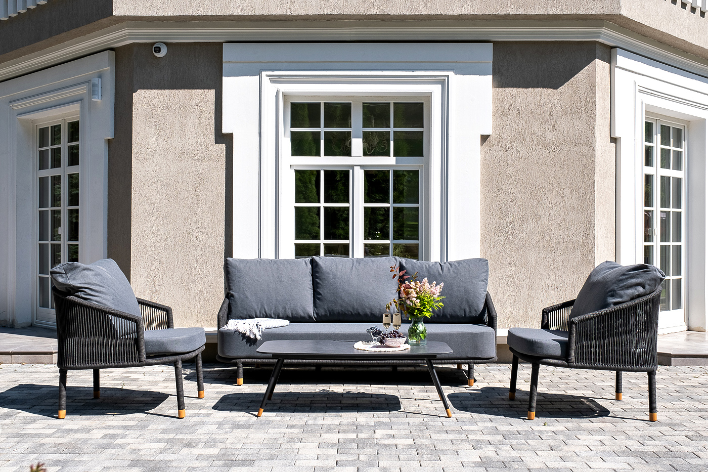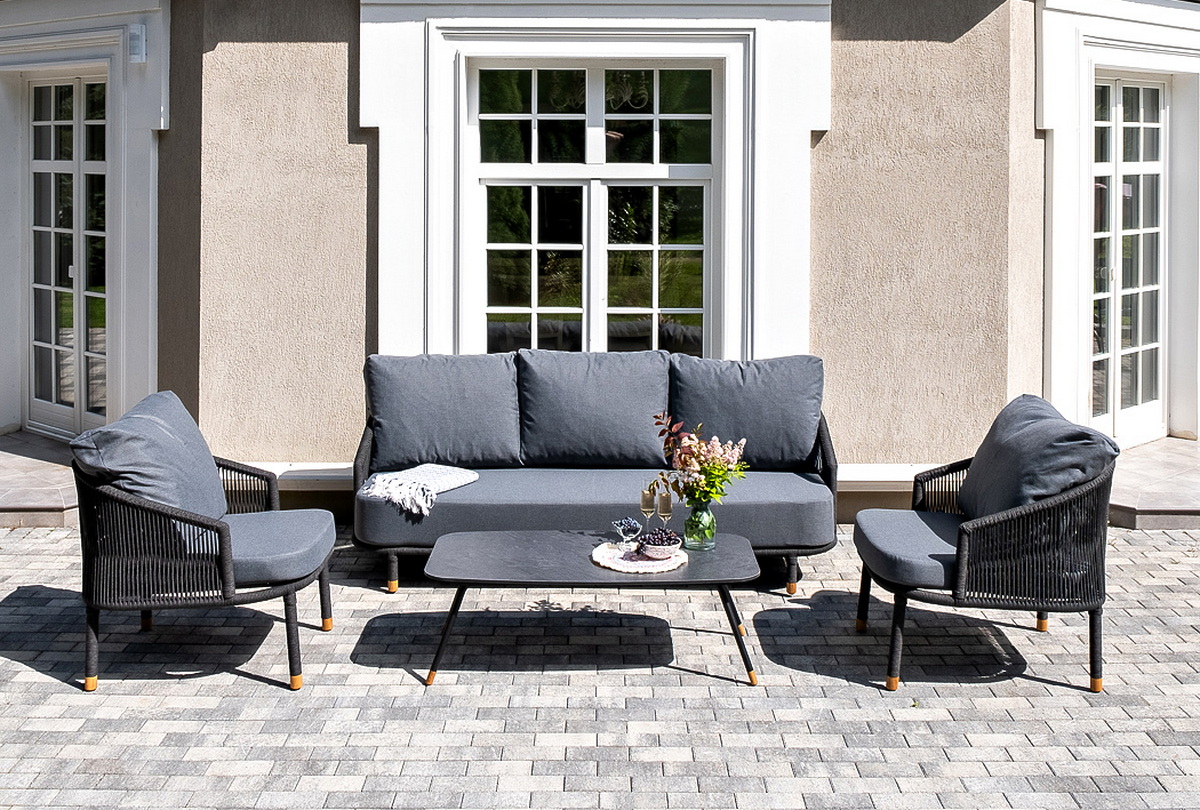 Лаунж-зона «Верона», рассчитанная на пять персон, станет центром притяжения для большой компании или семьи. Комплект включает в себя просторный трехместный диван, два удобных кресла и журнальный столик. Прочный алюминиевый каркас темно-серого цвета (RAL7024) с муаровым покрытием, оплетенный вручную темно-серым роупом, создает надежную и эстетичную конструкцию. Мягкие подушки в темно-серых чехлах дарят непревзойденный комфорт. Журнальный столик с черным каркасом и столешницей из HPL «серый гранит», дополненный дубовыми наконечниками на ножках, идеально завершает этот гармоничный ансамбль.