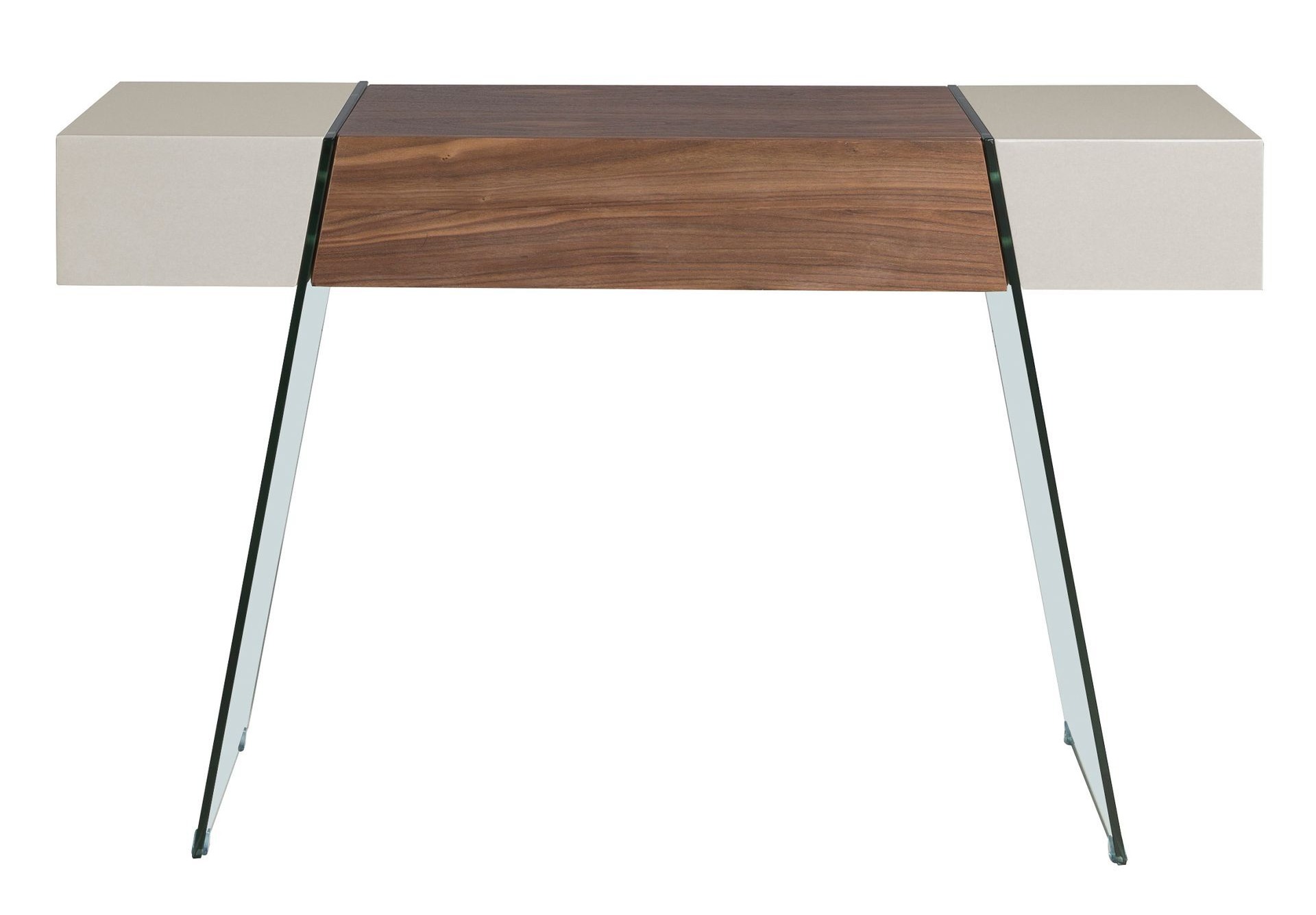 Консоль выполнена из шпонированного МДФ, центральная часть из орехового шпона, боковые с глянцевым белым покрытием, опоры из ударопрочного стекла.