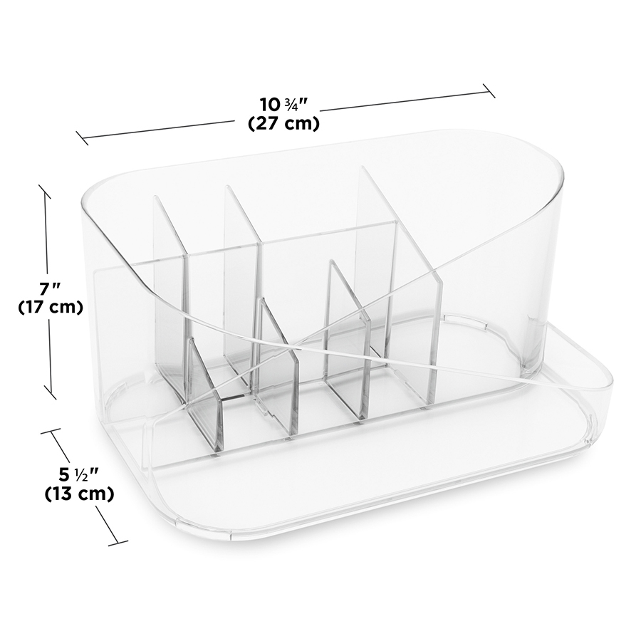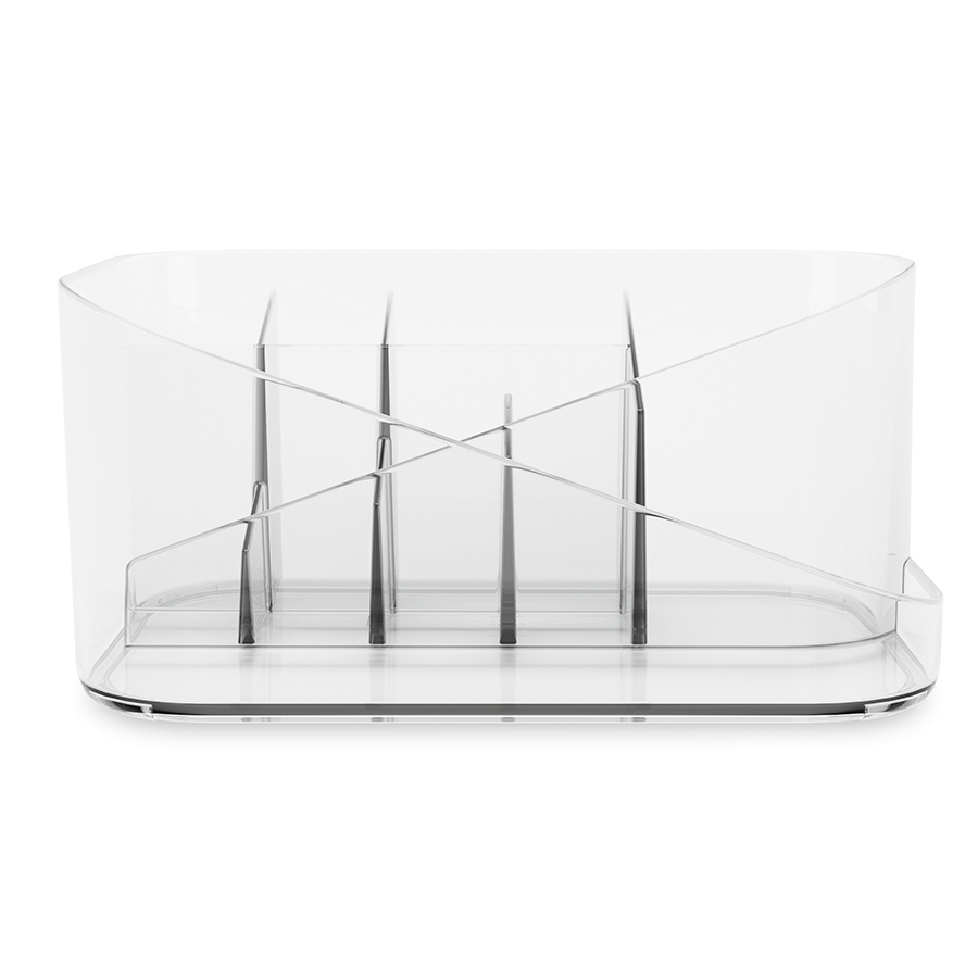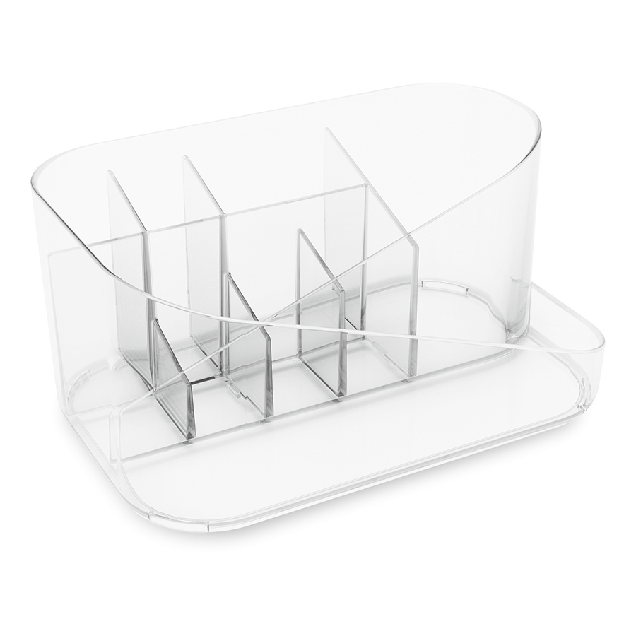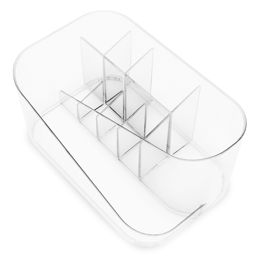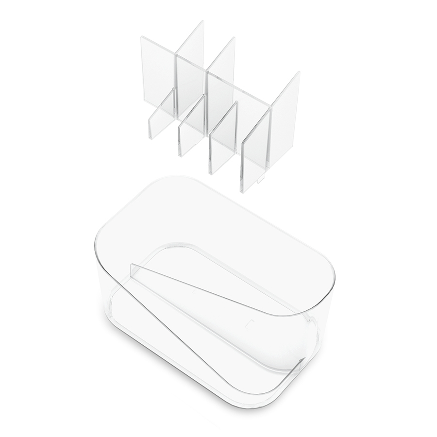 В органайзере Glam можно хранить все необходимое для повседневного макияжа благодаря отделениям разного размера и съемной вставке. Легкий, компактный и удобный в использовании, он обеспечивает быстрый доступ к необходимым средствам, не занимает много места в ванной и на туалетном столике. Материал: полистирол. Размеры: 17х27х13 см. Цвет: прозрачный. Пыль и загрязнения можно удалять при помощи мягкого влажного материала. Запрещается использование абразивов и агрессивной бытовой химии.
