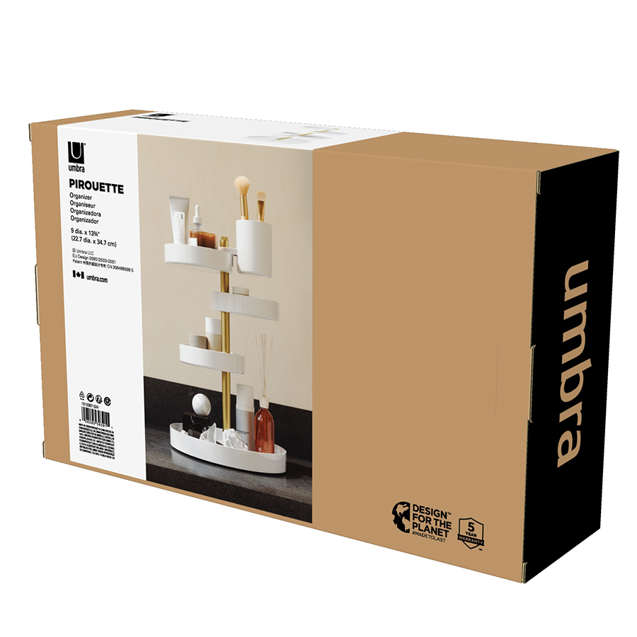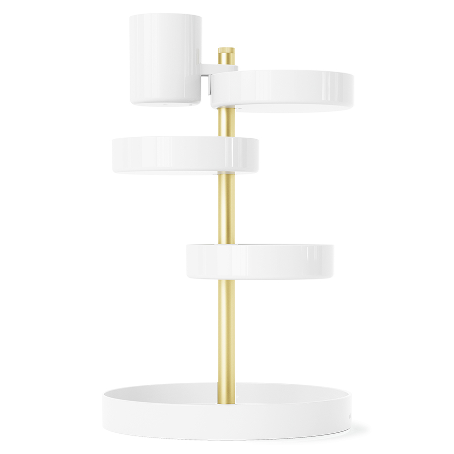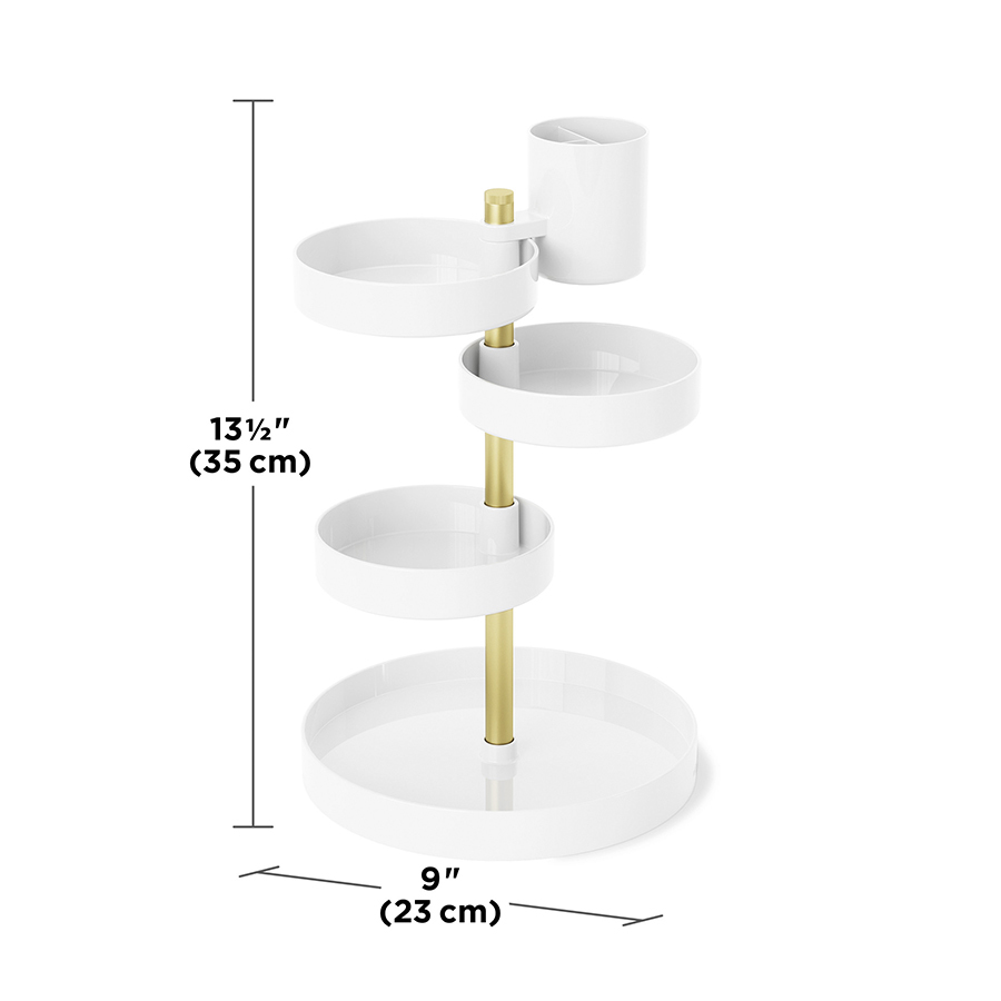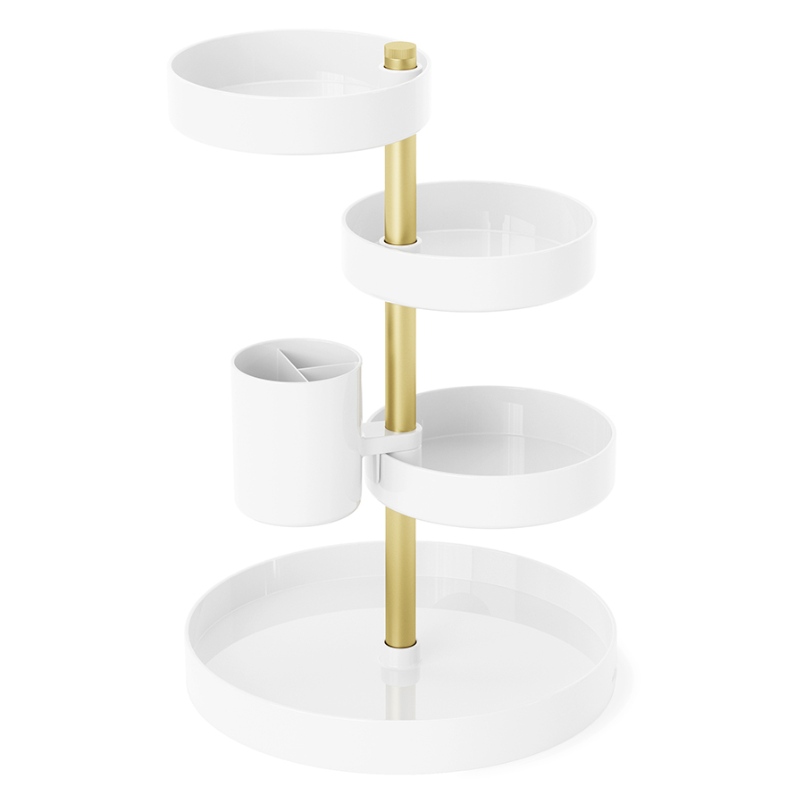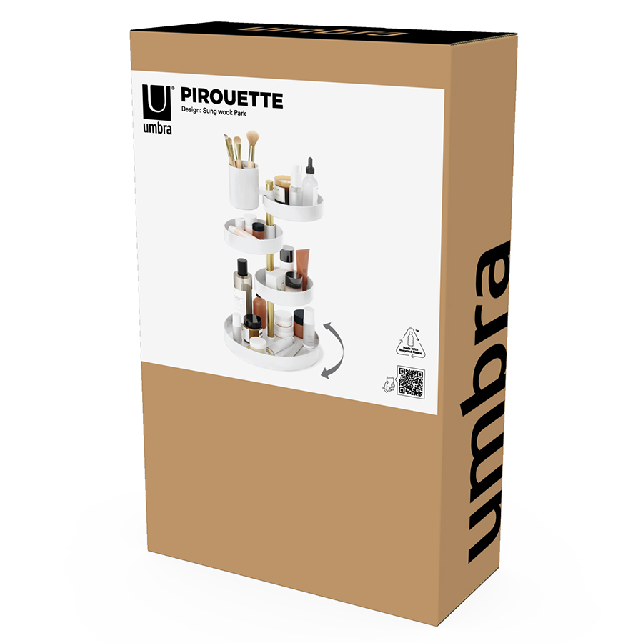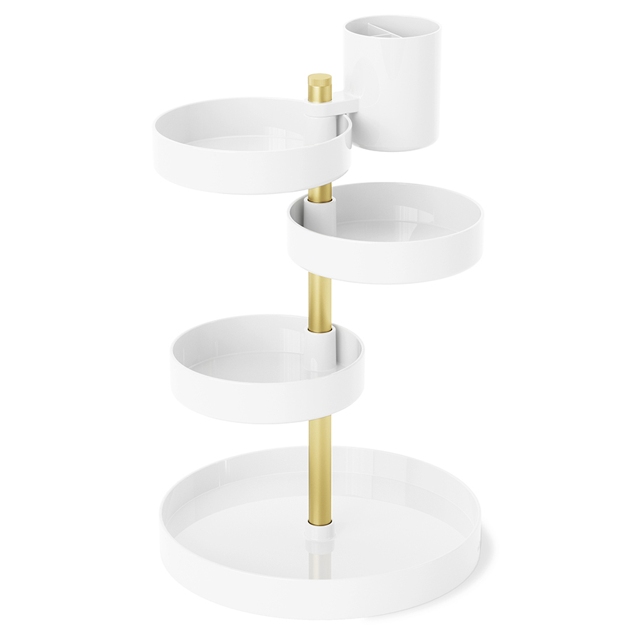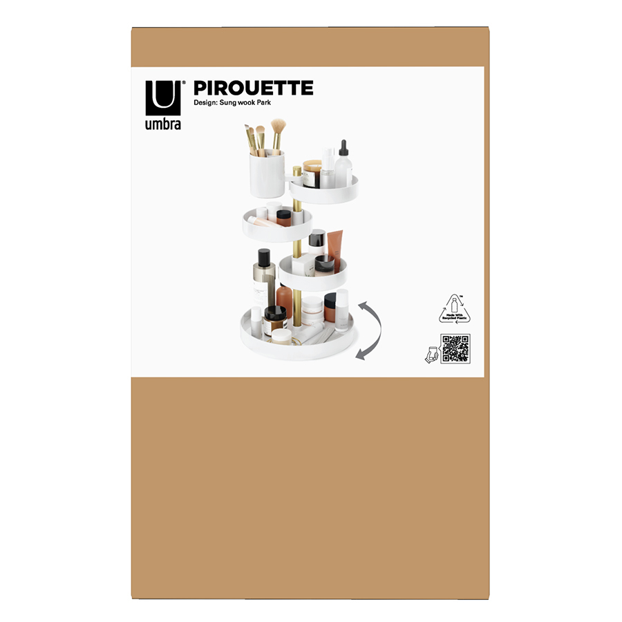Pirouette – настольный органайзер с многоуровневой конструкцией для хранения косметики и уходовых средств. Каждый лоток имеет хорошую вместительность, поворачивается на 360 градусов и фиксируется на необходимой высоте для удобного размещения продуктов различных размеров. Такой функциональный аксессуар станет прекрасным дополнением любого туалетного столика. Минималистичный дизайн сочетается с различными вариантами оформления интерьера. Материалы: полистирол, сталь, полипропилен, силикон. Размеры: 23х23х35 см. Цвет: белый/латунь. Пыль и загрязнения с поверхностей можно удалять при помощи мягкого влажного материала.