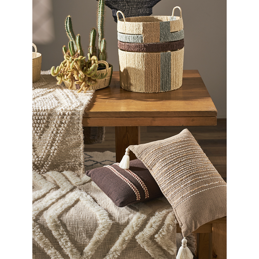 Ковер Imphal из коллекции Ethnic – простой способ создать уютную атмосферу в доме и освежить интерьер. Уникальная комбинация материалов обеспечивает напольному покрытию экологичность, износостойкость и долговечность. Новозеландская шерсть известна своей прочностью, мягкостью и естественной красотой, а также хорошими тепло- и шумоизоляционными свойствами. Такой ковер не только украшает пространство, а также обеспечивает акустический комфорт и помогает сохранять тепло в помещении. Волокна хлопка придают ковру легкость и мягкость, делая его приятным на ощупь и удобным в использовании. Размеры: 70х160 см. Плотность: 900 г/м2. Высота ворса: 20 мм. Подложка: хлопковая. ! Стирка запрещена ! Гладить запрещено ! Барабанная сушка запрещена ! Не отбеливать ! Сухая чистка запрещена ! Допускается ручная чистка пятен Рекомендуем незамедлительно удалять любые загрязнения. Для этого используйте бумажные салфетки или ткань с мыльным раствором воды. Регулярно чистите ковер пылесосом. Не применяйте турбощетку или щетку с жестким ворсом. Если появилась зацепка, не вытягивайте нити из ковра. Для их удаления воспользуйтесь ножницами. Стелите ковер на подложку, чтобы продлить срок его службы и защитить напольное покрытие. Небольшое количество ворса может выпадать – это нормально для ковров из натуральных материалов. Обращаем внимание, что острые предметы, открытый огонь, теплая поверхность и чрезмерная влажность могут испортить внешний вид и негативно повлиять на качественные характеристики изделия. Небольшая разница в цвете и фактуре текстиля в разных частях ковра делает каждое изделие уникальным. У новых напольных покрытий может присутствовать естественный запах, он абсолютно безопасен и при частом проветривании быстро исчезает. После вскрытия упаковки ковер в течение некоторого времени может сохранять элементы деформации вследствие долгого нахождения в скрученном виде, но уже через 1-2 недели он полностью выпрямится. Ковер может выцветать под воздействием прямых солнечных лучей. Рекомендуем периодически менять расположение изделия, чтобы цвет менялся равномерно.