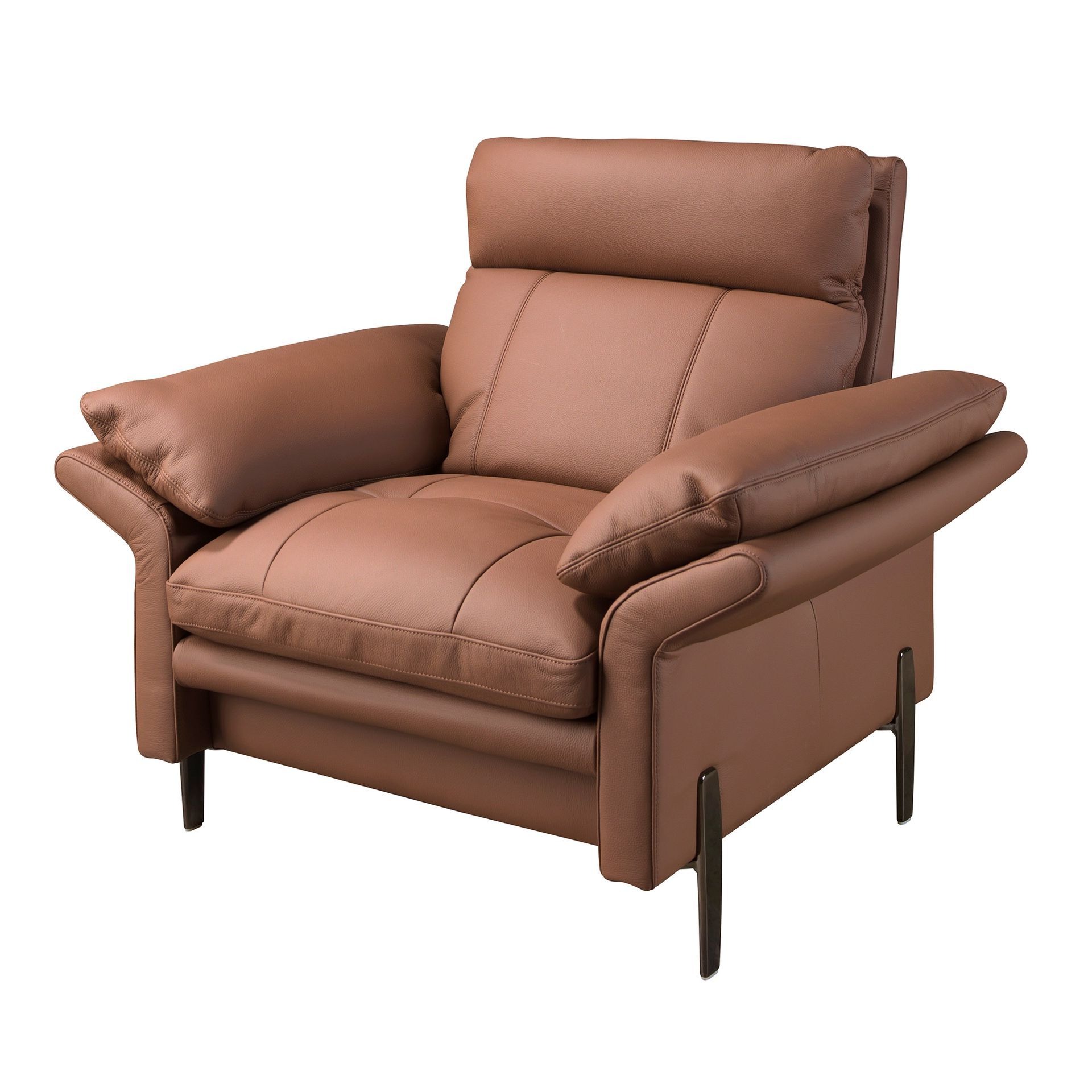 Кресло с подлокотниками современного дизайна с сиденьем и спинкой, обитыми коричневой воловьей кожей. Как по своему стилю, так и по своим темным хромированным ножкам из нержавеющей стали, это кресло представляет собой идеальное сочетание дизайна и комфорта. Это просторное и статусное кресло станет центральным элементом вашей гостиной. Благородная кожа и элегантные хромированные ножки создают образ солидный и современный. Модель 5173 — для тех, кто ценит комфорт и безупречный стиль.