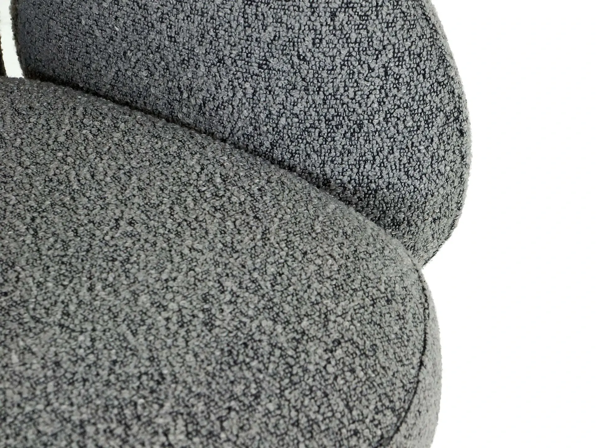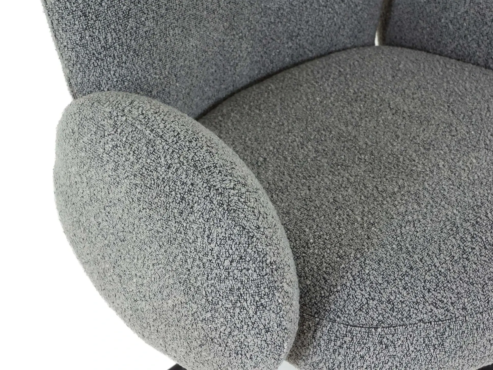 Материал обивки - букле, материал ножек - металл черного матового цвета. На ножках предусмотрены специальные подпятники, которые предотвращают скольжение и повреждения напольного покрытия.