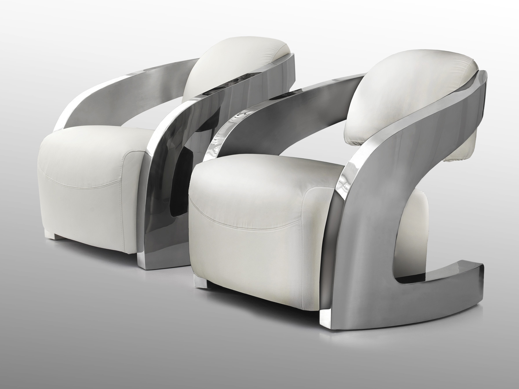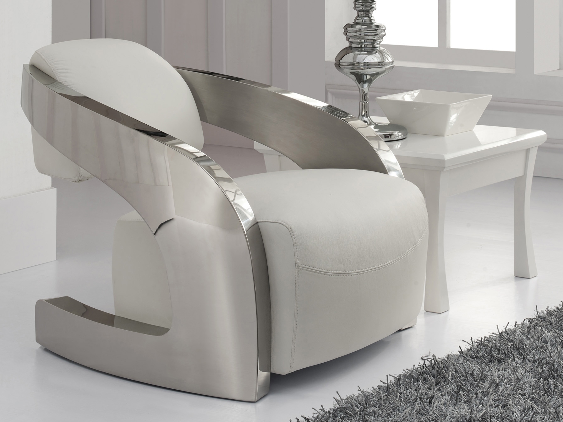 Кресло с обивкой из итальянской кожи белого цвета, отстроченной нитью белого цвета, каркас из полированной нержавеющей стали, проверенное удобство.