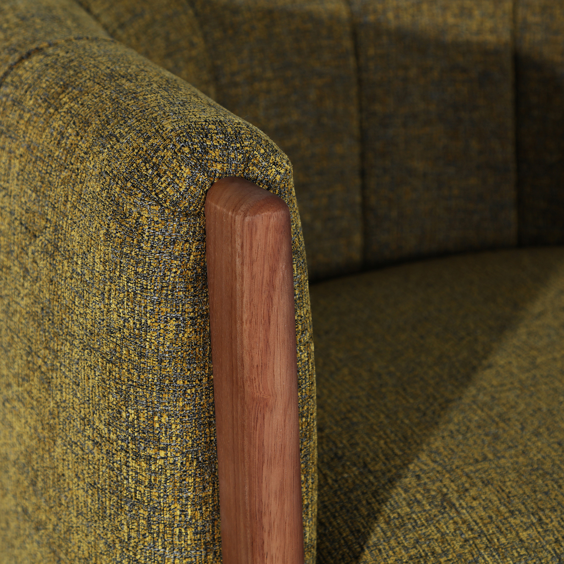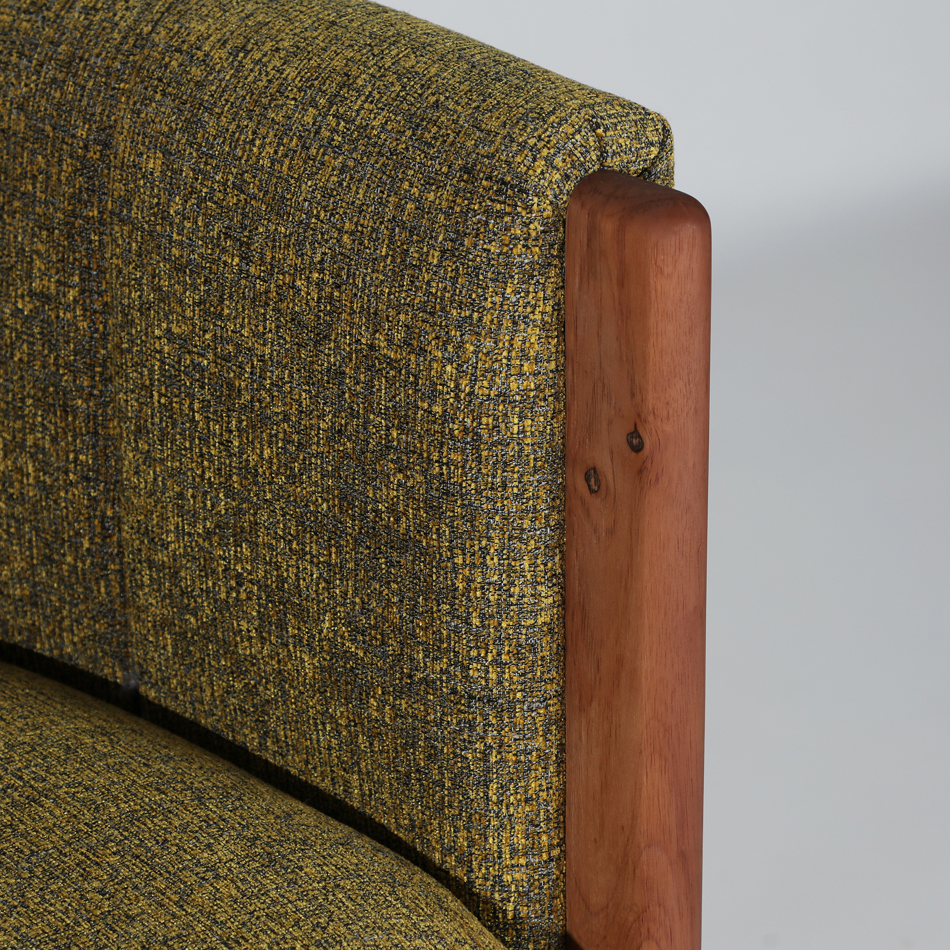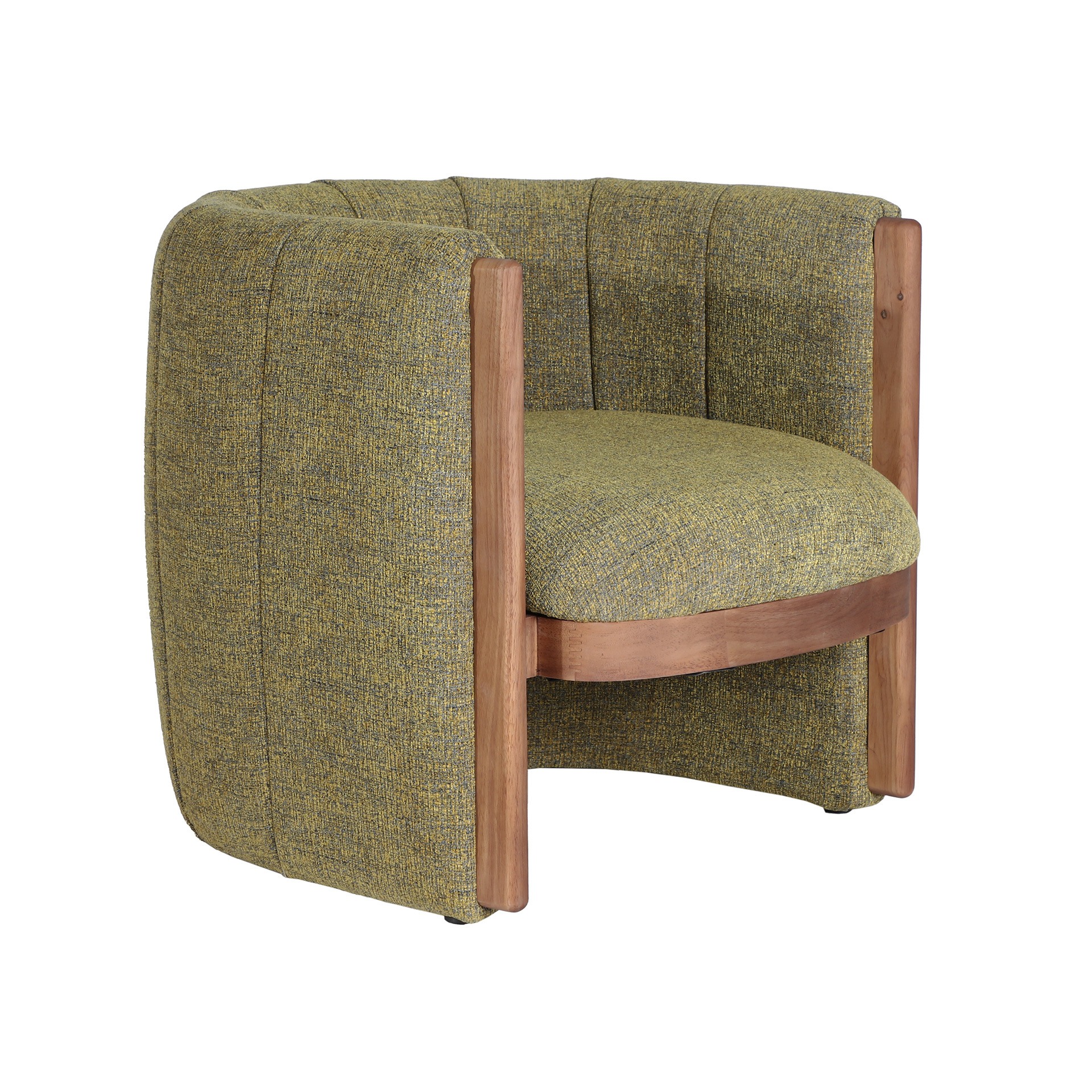 Кресло из коричневой сосны в сочетании с желтым полиэстером с пятнистой отделкой и пеной. Пятнистая обивка желтого, серого и черного цветов. Ширина: 76см, Глубина: 79см, Высота: 69см