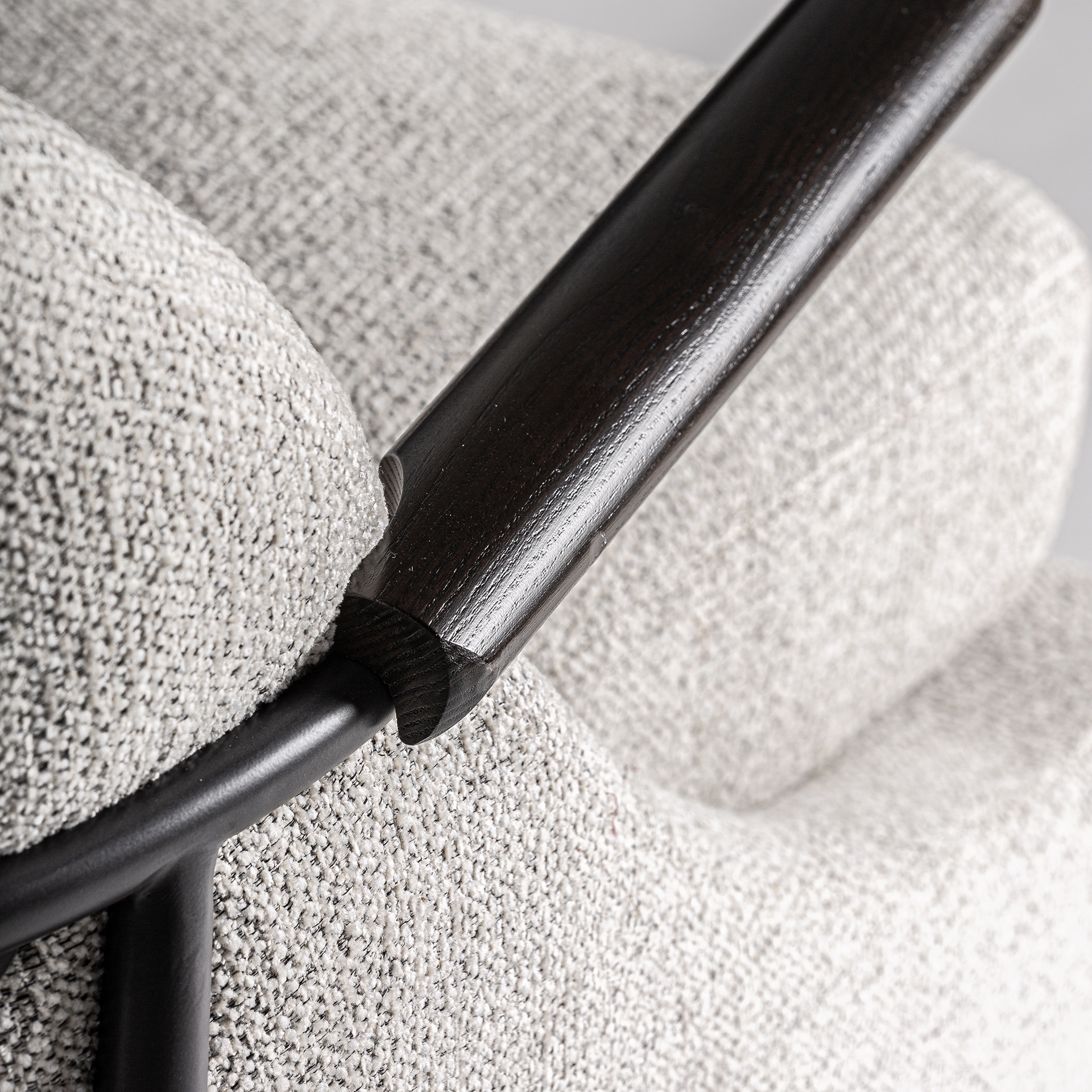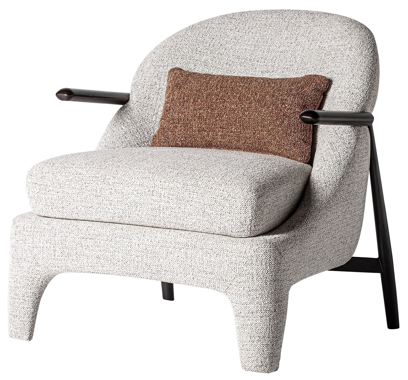 Кресло Herzele в современном стиле, изготовлено из коричневой сосны в сочетании с серым полиэстером с пятнистой отделкой и черным металлом.