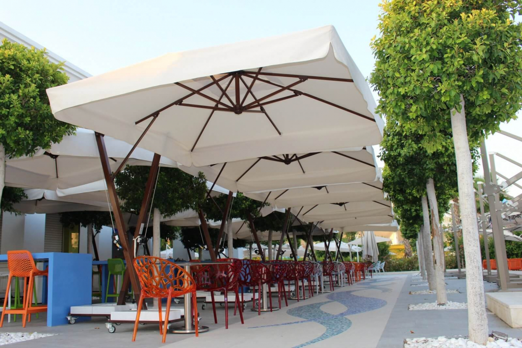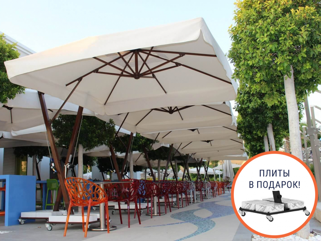 Квадратный купол идеально подходит для прямоугольных и круглых столов, создает равномерную тень. Такие зонты можно ставить в ряд, формируя сплошную затененную зону.