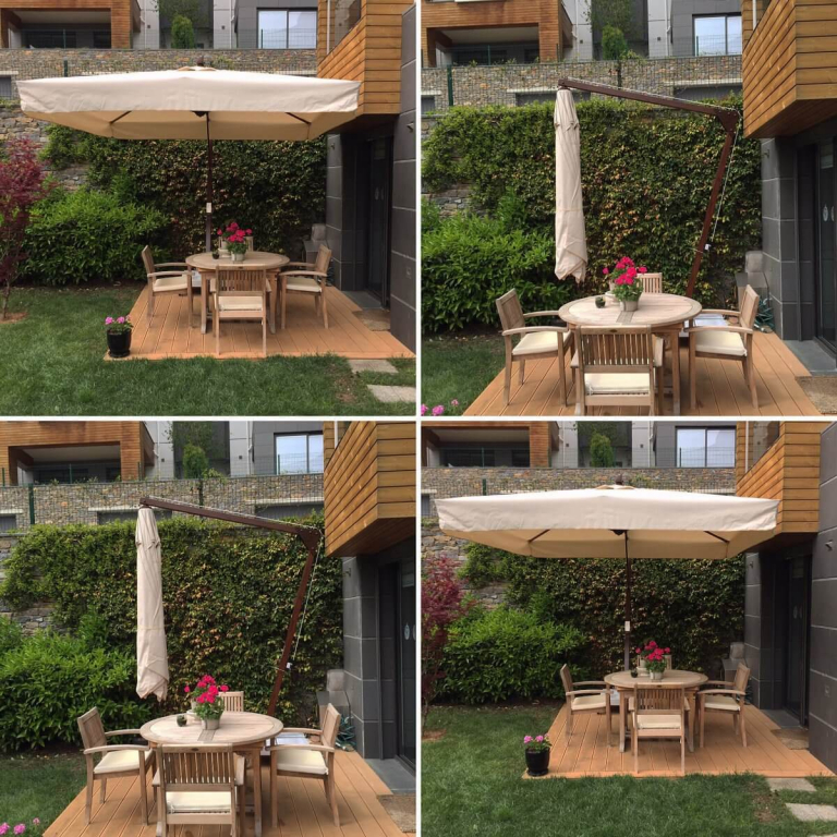 Отсутствие центральной стойки дает полную свободу в использовании затененной площади. Вы можете поставить под зонт большой обеденный стол, шезлонги или детский бассейн, не спотыкаясь о ножку. Это также удобно для заведений: официанты свободно перемещаются, а гости не стеснены.