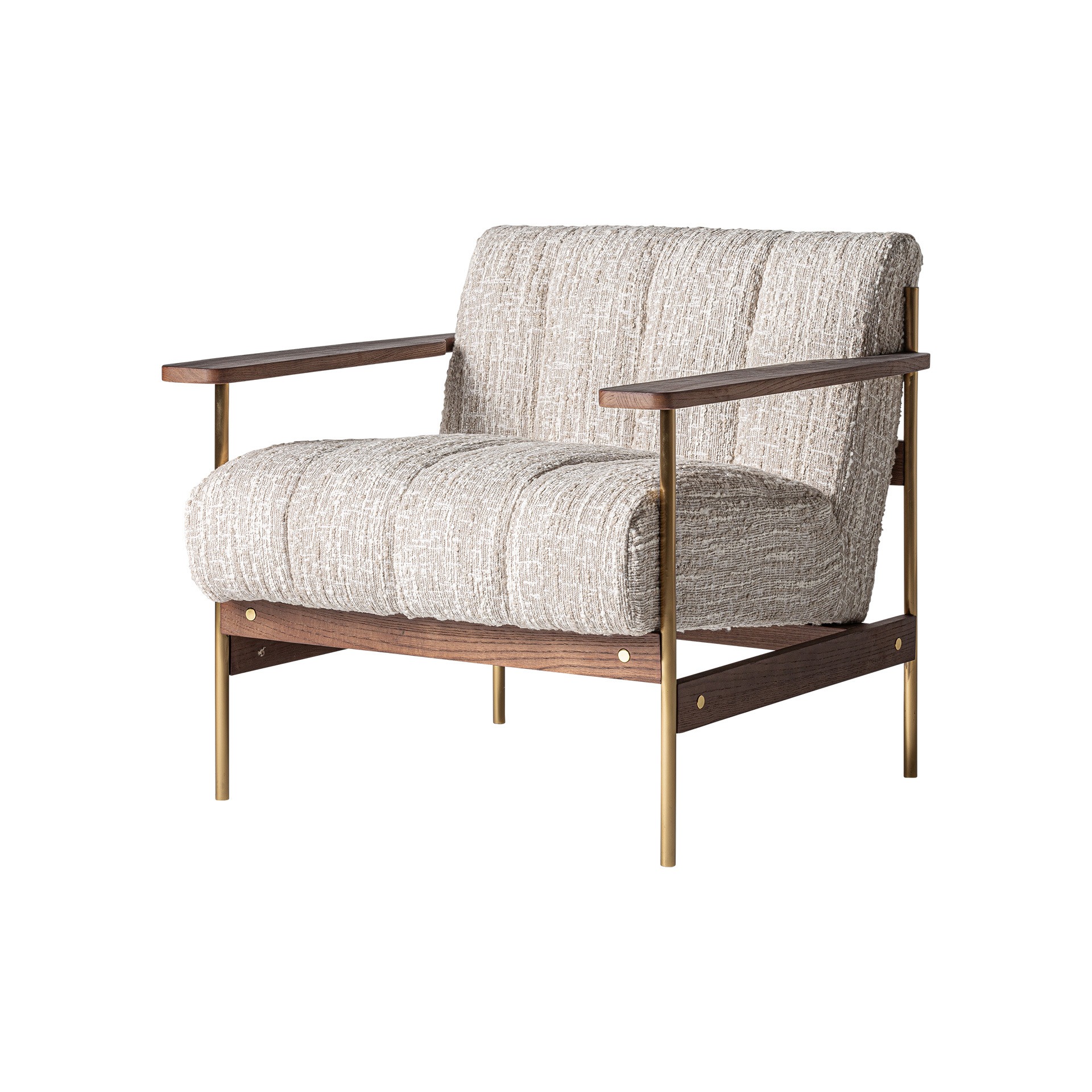 Кресло из полиэстера в бежевый тонах в сочетании с коричневой сосной и сталью золотистого цвета. Модель сочетает в себе теплоту дерева, мягкость ткани и элегантность золотистого металла. Лаконичный дизайн и универсальный бежевый цвет делают это кресло идеальным выбором для тех, кто ищет простое, удобное и функциональное решение для дома. Оно легко впишется в любой интерьер — от классического до современного.