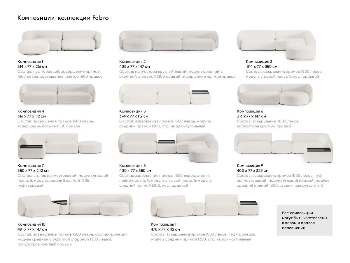 Fabro — коллекция современных диванов, дизайн которых сосредоточен на персонализации интерьера. Обтекаемая архитектура модульных блоков позволяет создать гармоничный объект для любого пространства. Из полукруглых, круглых, трапециевидных и прямоугольных элементов, которые также могут иметь встроенную столешницу, можно воплощать разные конфигурации по индивидуальным проектам. Добавляйте, расширяйте, удлиняйте — реализуйте конкретную модель, которая нужна вашему дому.
