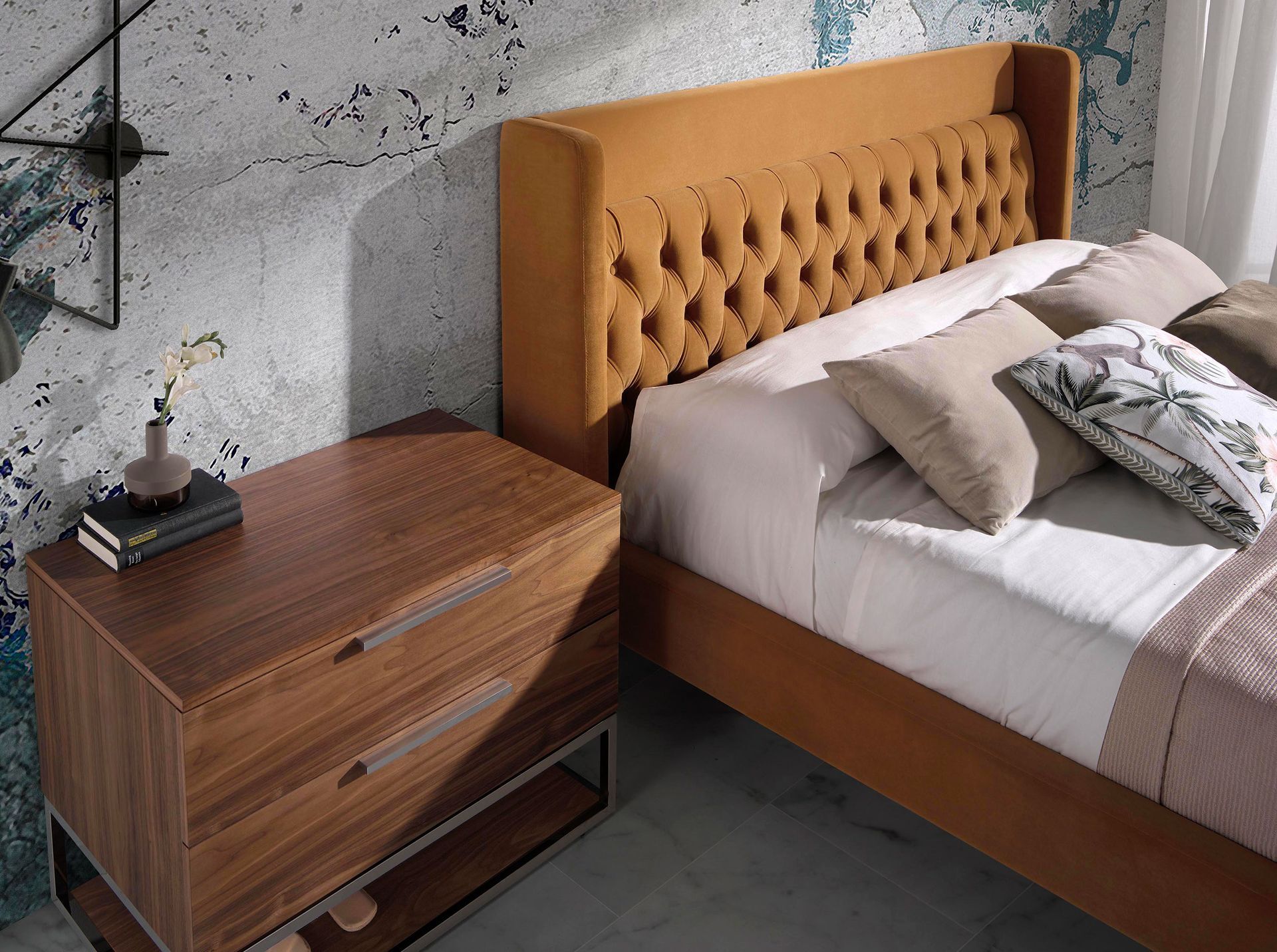 Двуспальная кровать современного дизайна с оригинальным изголовьем и каркасом из бархатистой ткани горчичного цвета, а также ножками из полированной темной нержавеющей стали. Незаменимый предмет мебели для вашей спальни, который добавит ей элегантности и уюта. В комплект входит удобное многоместное основание из сосны.