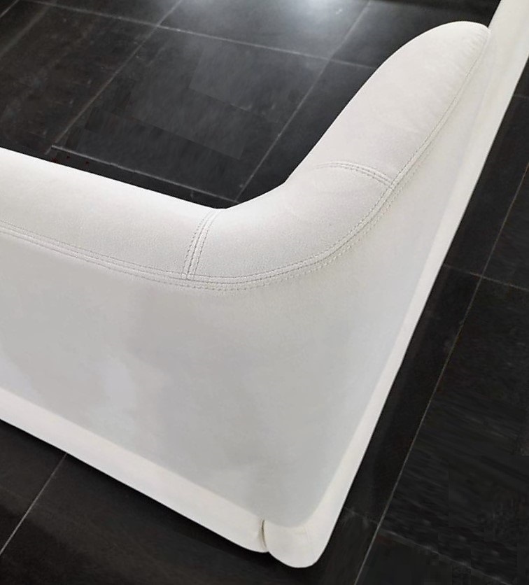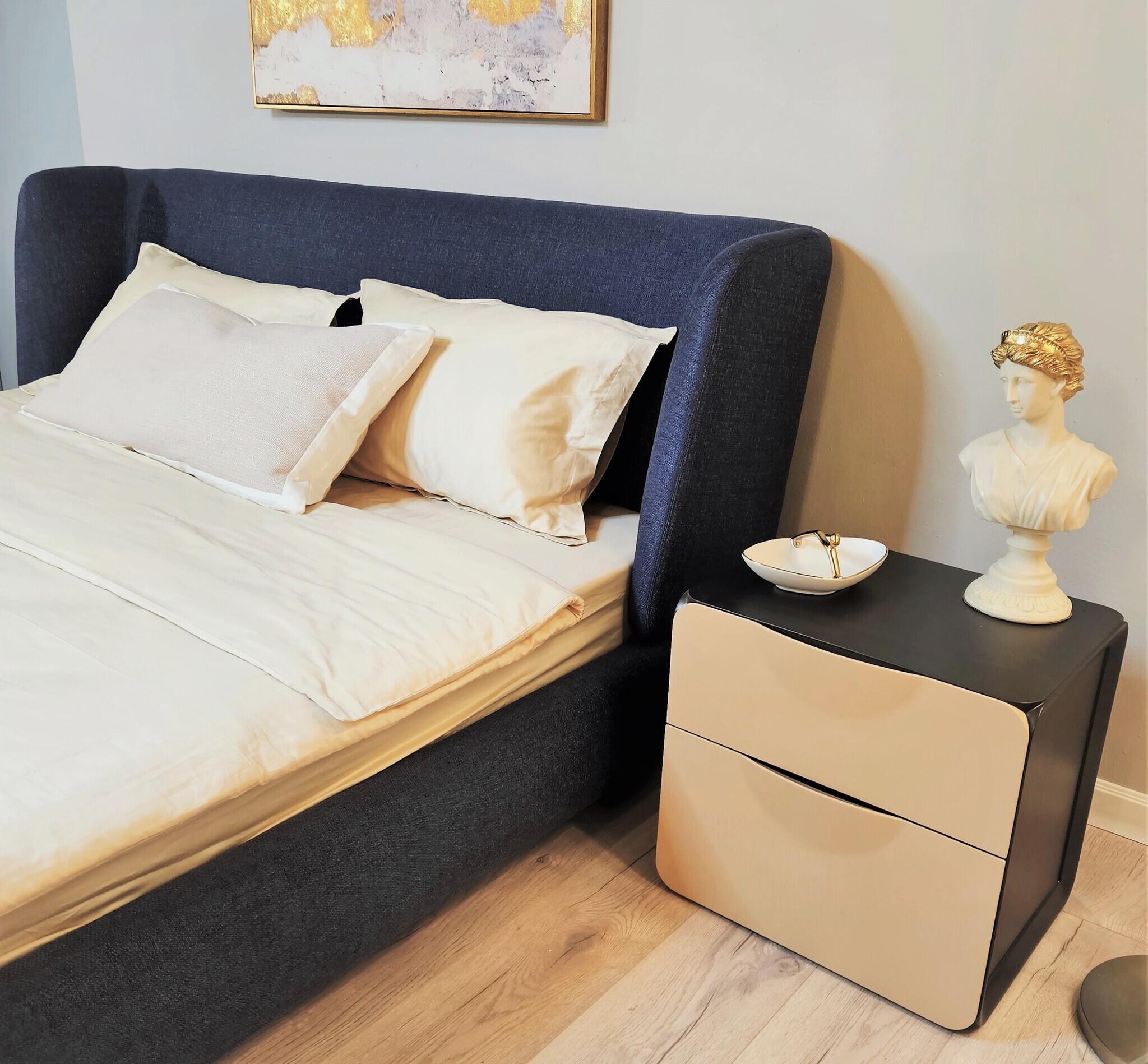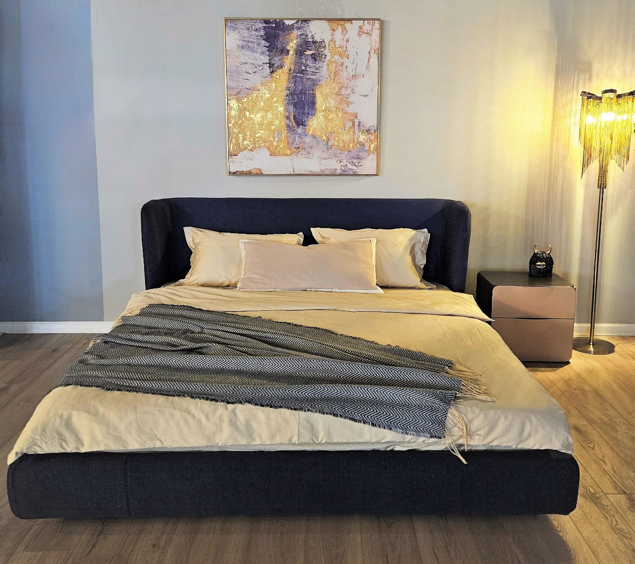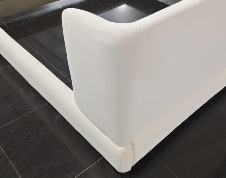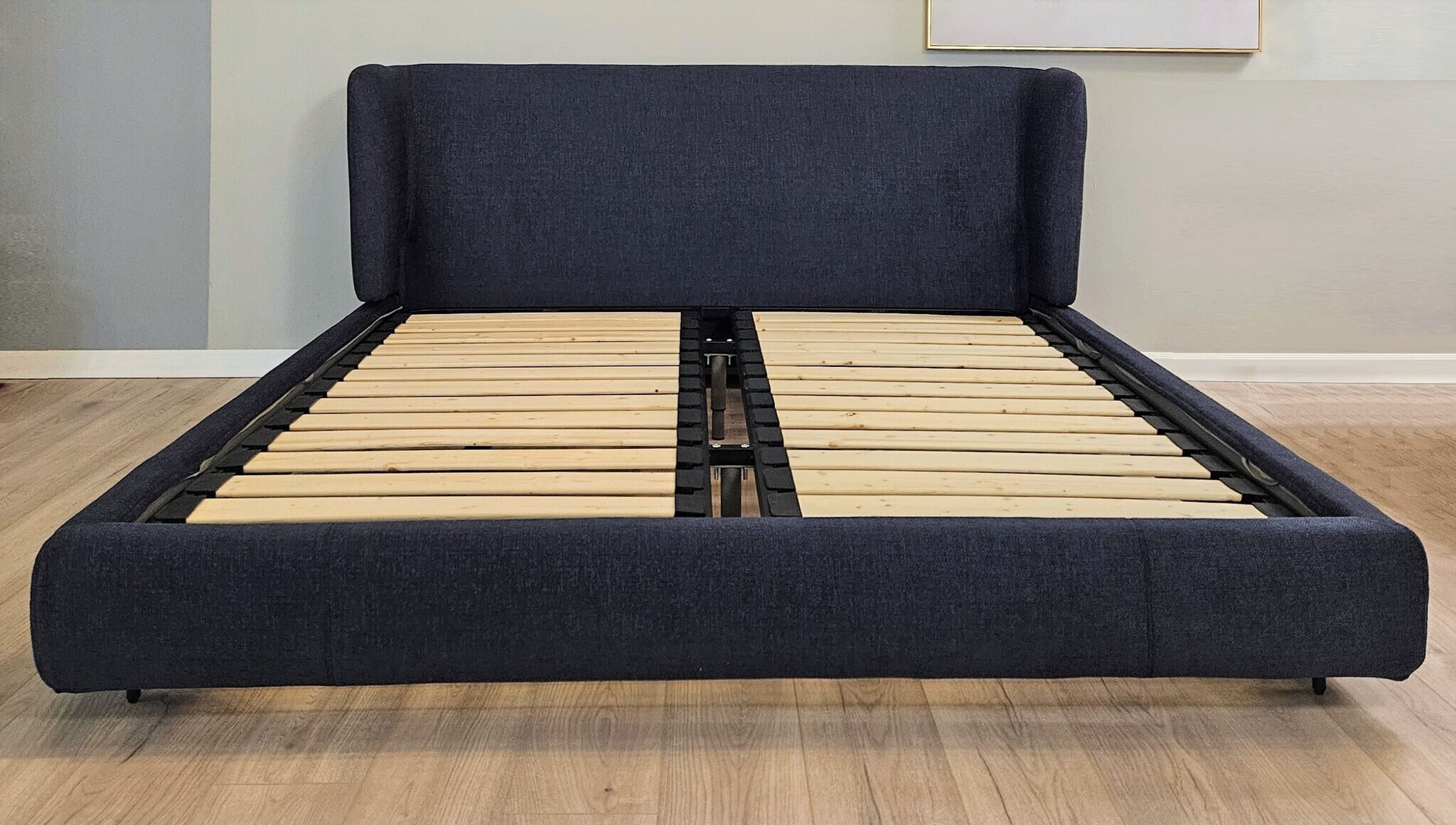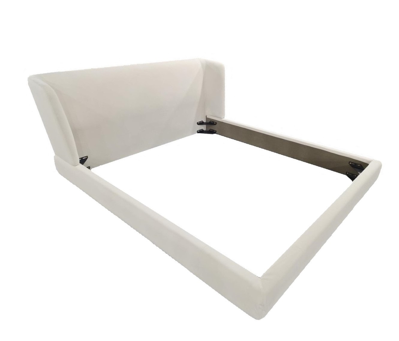 Каркас кровати выполнен из древесины. Реечное основание с деревянными ламелями. Наполнитель из пенополиуретана. Кровать представлена в двух цвета: ткань рогожка с шенилловой нитью цвета классический синий деним; ткань велюр цвета античный белый. Возможны различные варианты ткани в доступных цветах.