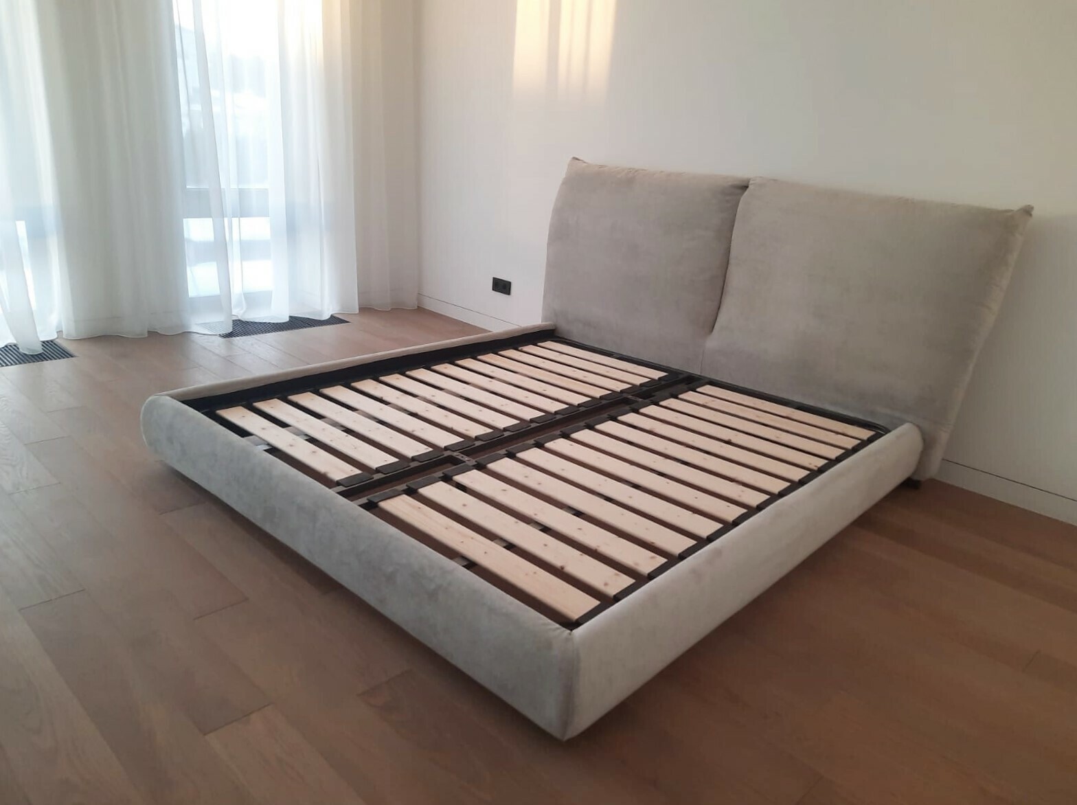Каркас кровати выполнен из древесины. Реечное основание с деревянными ламелями. Наполнитель – эластичный пенополиуретан. Специальный механизм позволяет поднимать или опускать подушку. Кровать представлена в ткани Шенилл цвета Французский серый. Кровать может быть установлена у стены или в центре комнаты. Возможны различные варианты ткани в доступных цветах.
