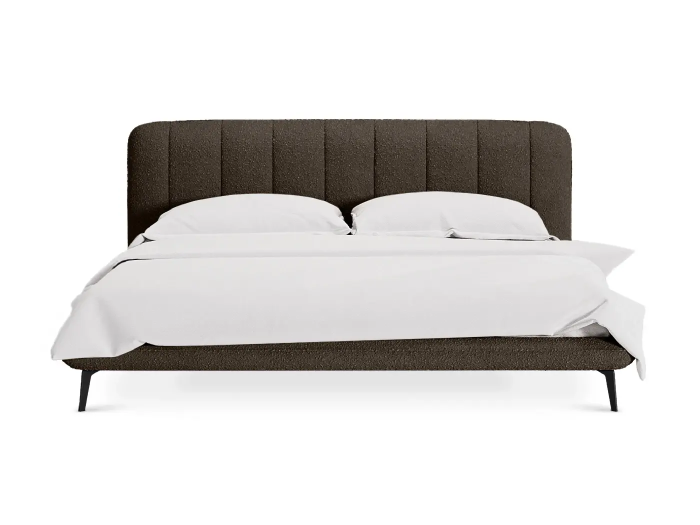 Прочные ножки из металла незаметно приподнимают корпус над полом. Поэтому кровать смотрится воздушно. Также это упрощает уборку. Мягкие изящные царги плавно перетекают в изголовье, единство с которым подчеркивается рельефным кантом.