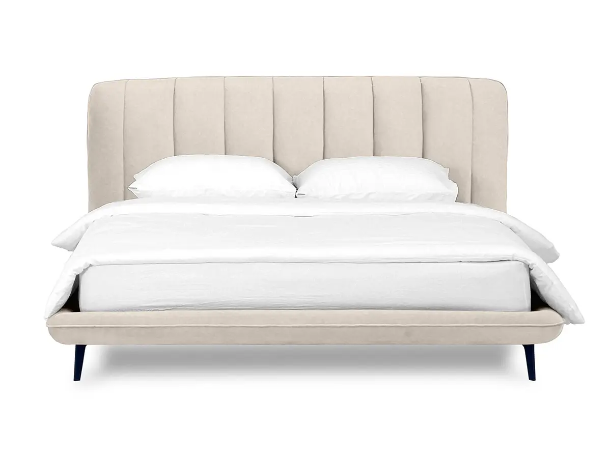 Прочные ножки из металла незаметно приподнимают корпус над полом. Поэтому кровать смотрится воздушно. Также это упрощает уборку. Мягкие изящные царги плавно перетекают в изголовье, единство с которым подчеркивается рельефным кантом.