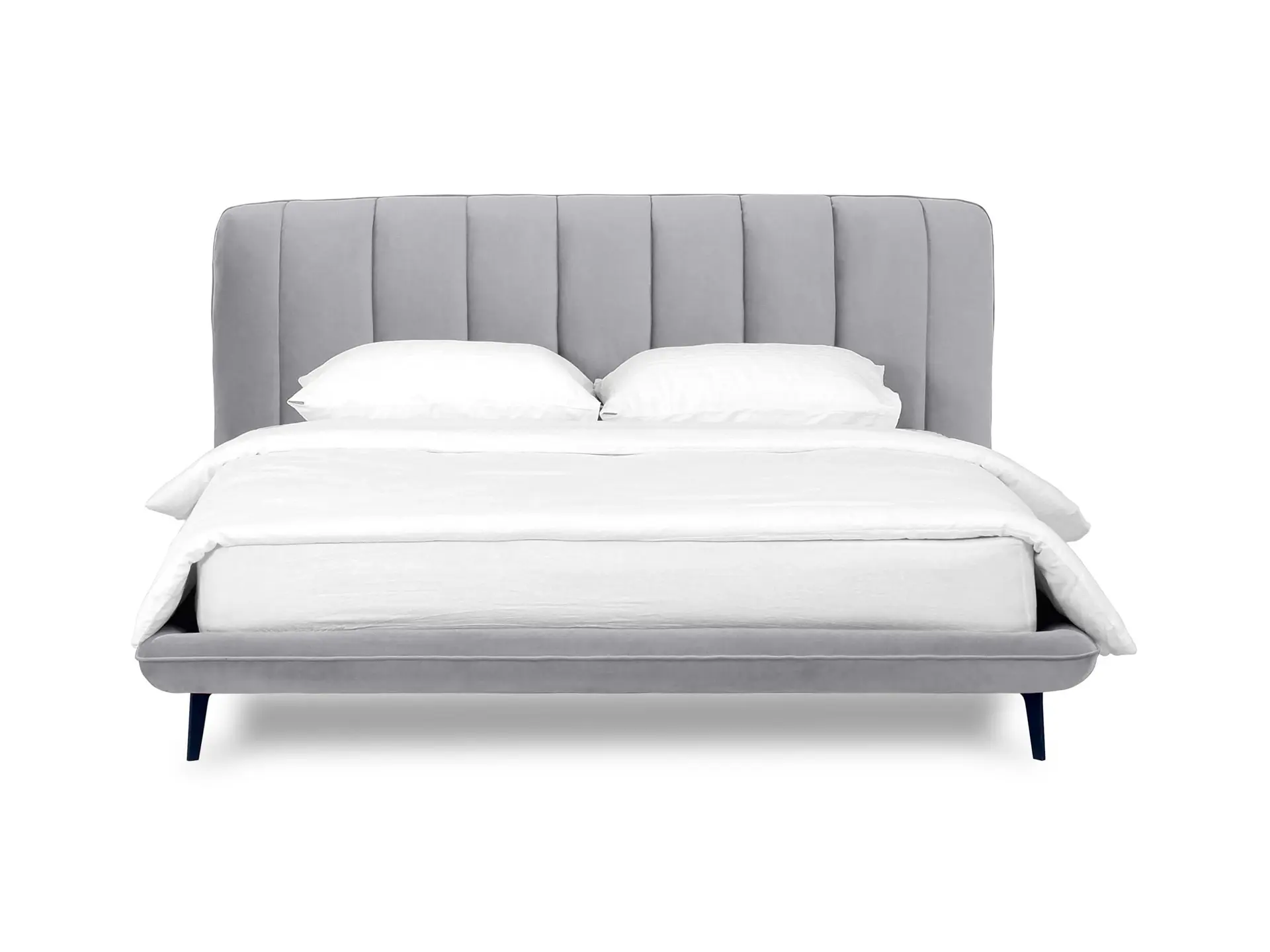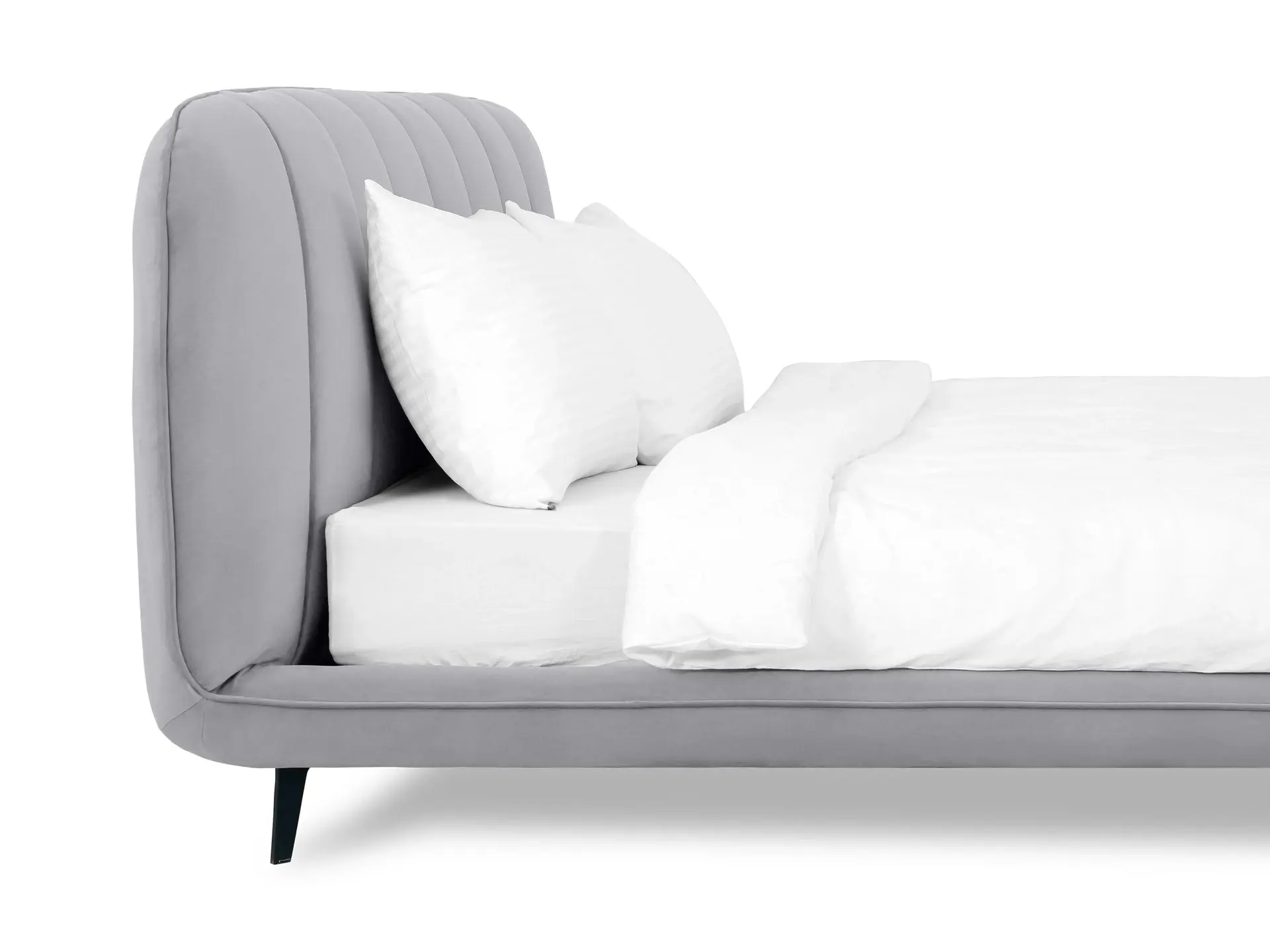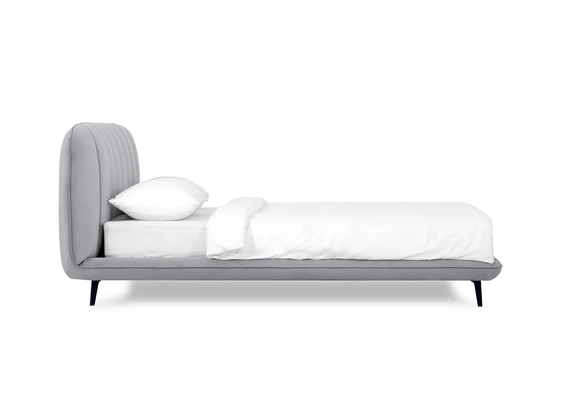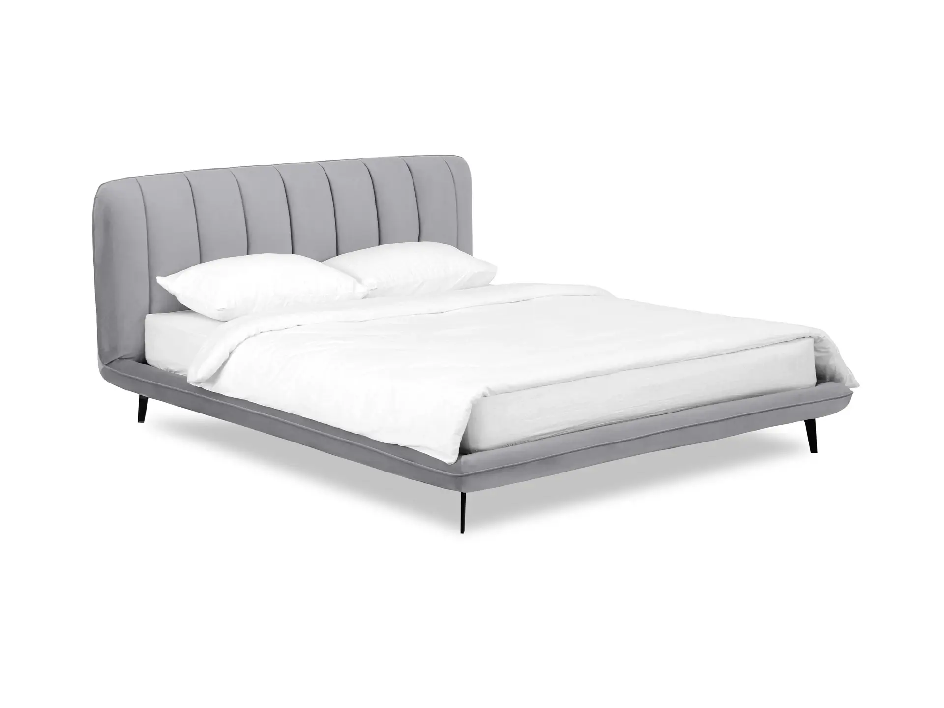 Прочные ножки из металла незаметно приподнимают корпус над полом. Поэтому кровать смотрится воздушно. Также это упрощает уборку. Мягкие изящные царги плавно перетекают в изголовье, единство с которым подчеркивается рельефным кантом.