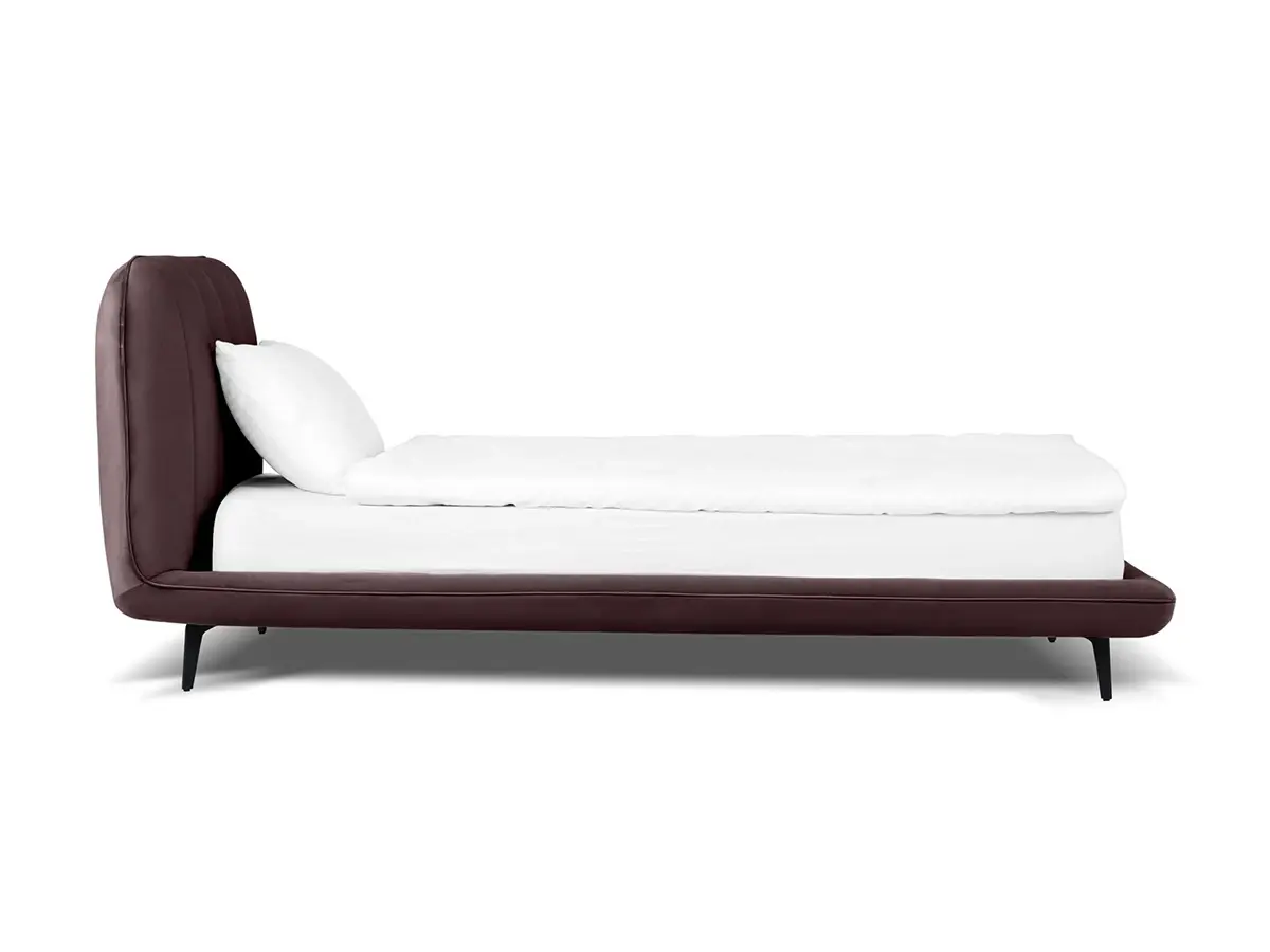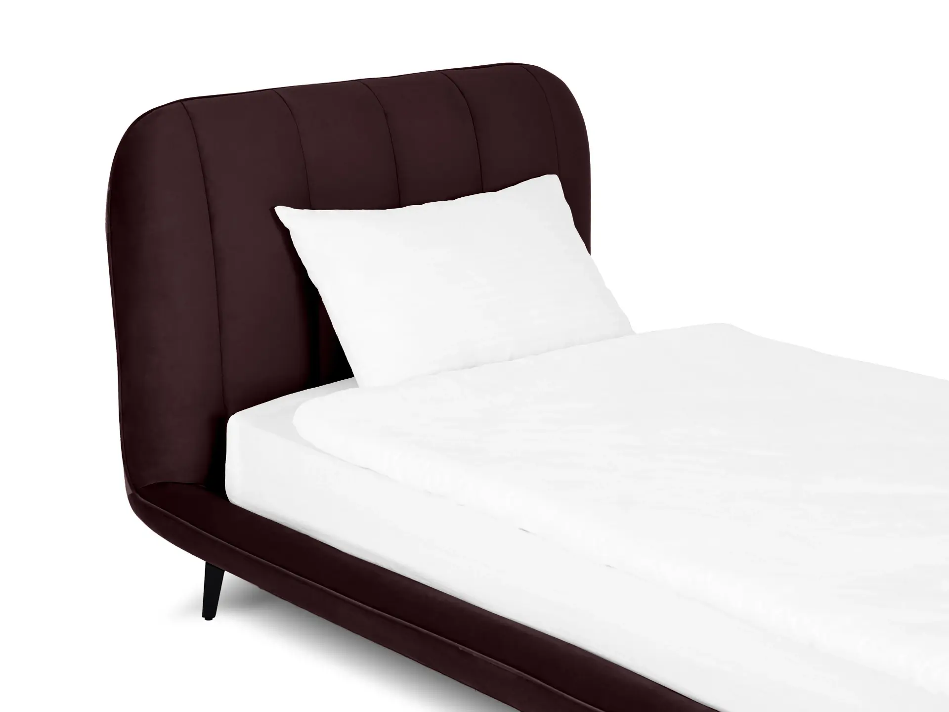Прочные ножки из металла незаметно приподнимают корпус над полом. Поэтому кровать смотрится воздушно. Также это упрощает уборку. Мягкие изящные царги плавно перетекают в изголовье, единство с которым подчеркивается рельефным кантом.