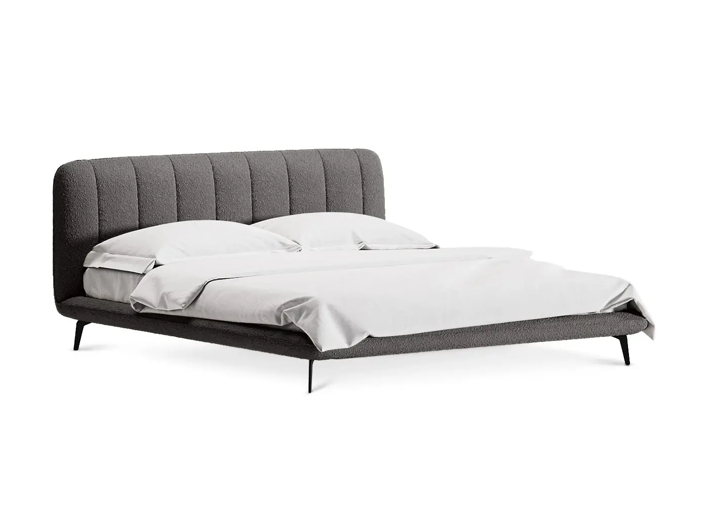 Прочные ножки из металла незаметно приподнимают корпус над полом. Поэтому кровать смотрится воздушно. Также это упрощает уборку. Мягкие изящные царги плавно перетекают в изголовье, единство с которым подчеркивается рельефным кантом.