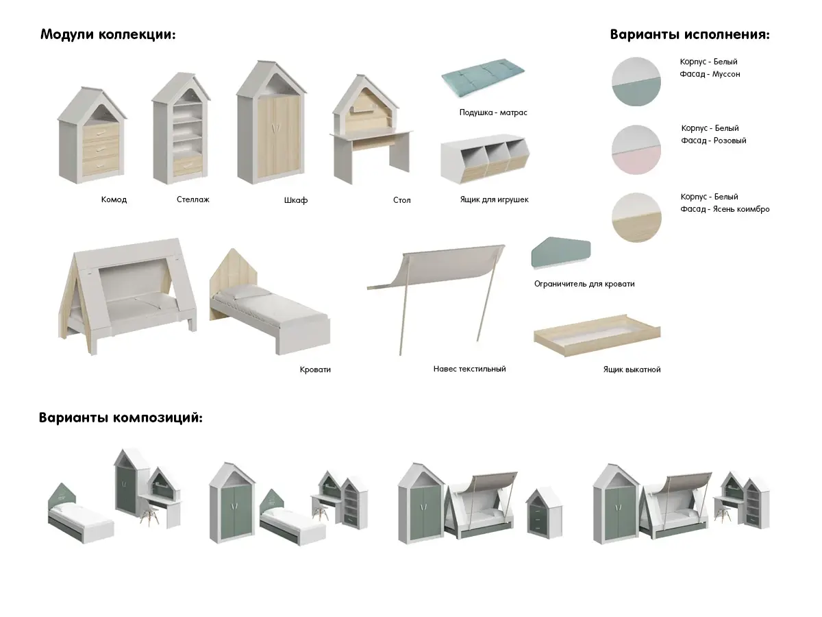 Тук-тук! Кто в домике живёт? Коллекция Campi превратит детскую в сказку! Есть уютные «гнёздышки» для вещей и игрушек: комод, шкаф, стеллаж. Для учёбы – функциональный столик. Нежные цвета, эргономичный дизайн. Для комфорта и рационального использования площади. А ещё детская Campi – бескрайнее поле для творчества. 1000 игр обеспечено! Кто откажется посетить пещеру тролля или отдохнуть в лесном шалаше? Можно воплотить любую тематическую задумку. И создать для малыша «свой мир», в котором он будет хозяином. Где он почувствует себя спокойно и расслабленно. Только представьте все улыбки, радости и шалости, трогательные эмоции. Подарите ребёнку безграничное счастье. С вашей любовью и детской мечты!