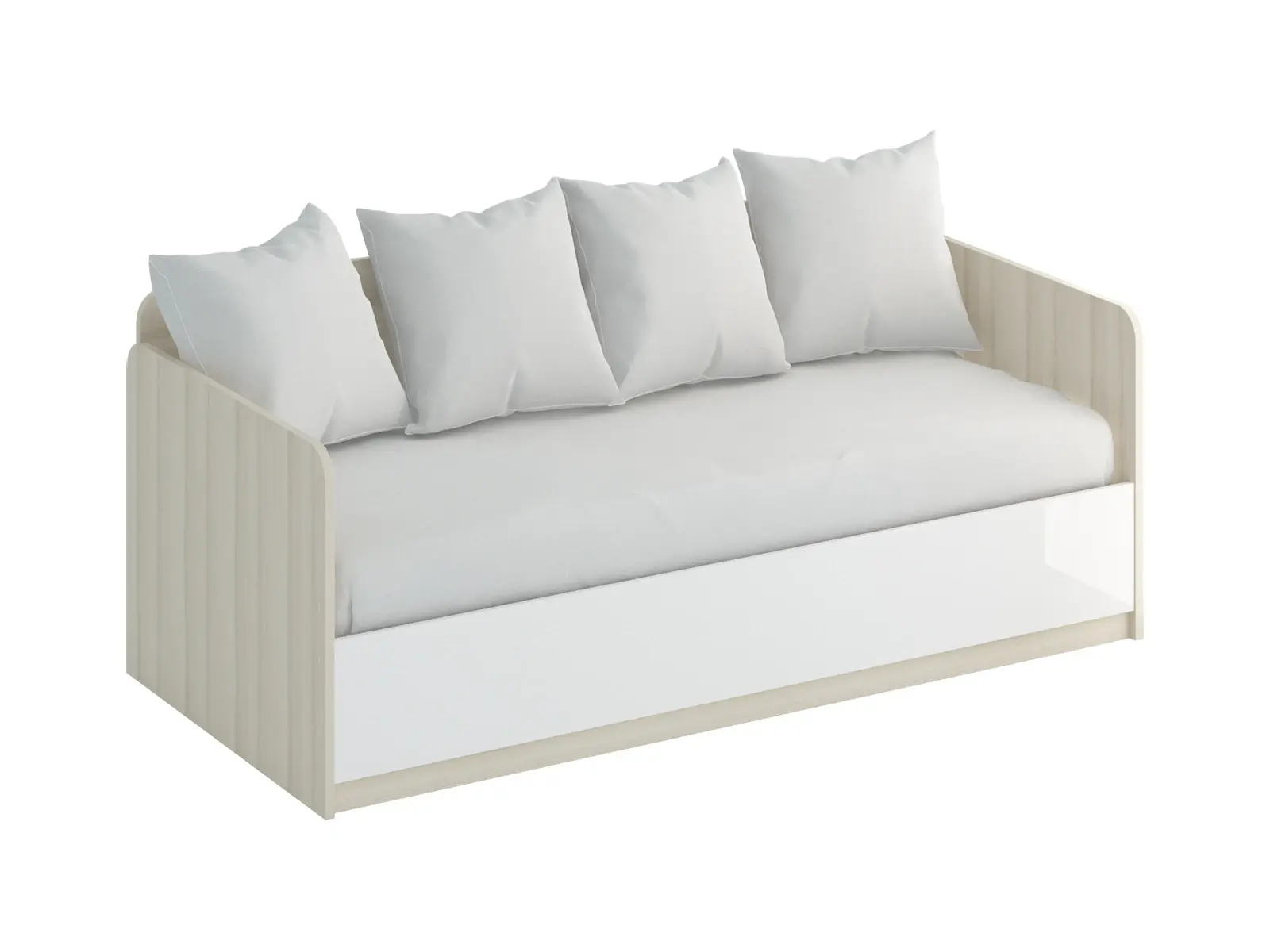 Кровать односпальная с подъёмным механизмом. Под спальным местом располагается ящик для хранения. Ящик разделён перегородкой на два отделения. Размер спального места – 900x2000 мм. Корректная работа подъёмного механизма пневматического типа обеспечивается при весе матраса от 25 до 40 кг. Декоративные подушки в комплект не входят.