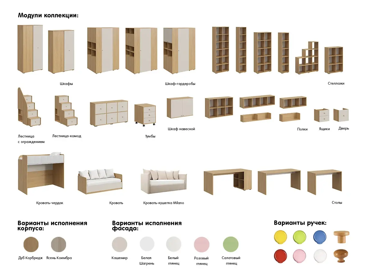 Play — коллекция модульной мебели для детской в спокойных оттенках светлого дерева с локальным добавлением ярких элементов. Естественные формы и цвета подружатся с любой стилевой темой. Подойдет как для дошкольников, так и для подростков. Изделия отвечают главным критериям детской мебели: безопасны, устойчивы, надёжны и эстетичны. Соблюдены экологические показатели, использована ЛДСП класса эмиссии Е1 и Е0,5 — для детской мебели с герметично закрытыми кромками. Из большого количества модулей вы можете спроектировать индивидуальное решение, исходя из потребностей и площади помещения.
