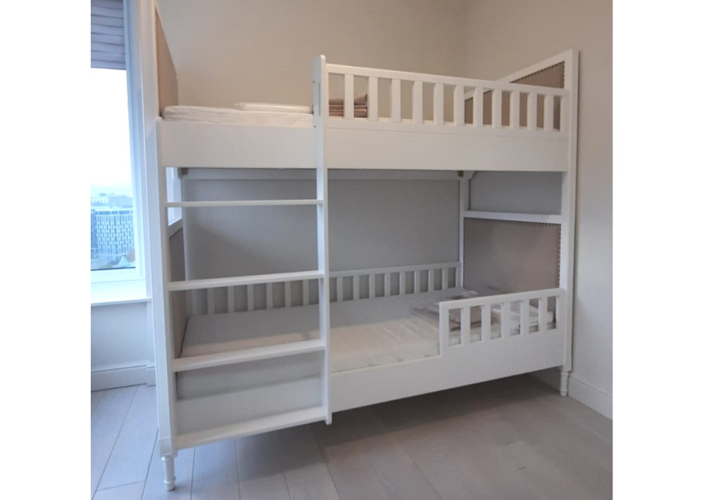 Двухъярусная кровать Elit в современном классическом стиле Имеет просторное спальное место 90*200 см Удобная лестница позволяет без труда забраться на второй этаж Дополнительно на нижний ярус кровати можно установить защитный бортик Материал: массив бука Обивка: ткань микрошенилл