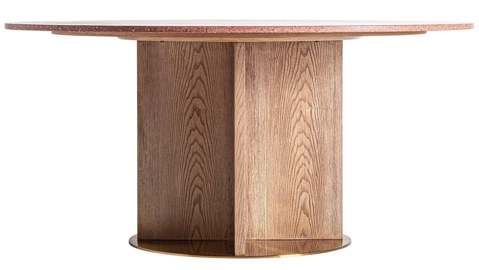 Обеденный стол Alferce в красно-золотом цвете, стиль арт-деко. Изготовлен из терраццо в сочетании со сталью и еловым деревом. Съемное изделие.
