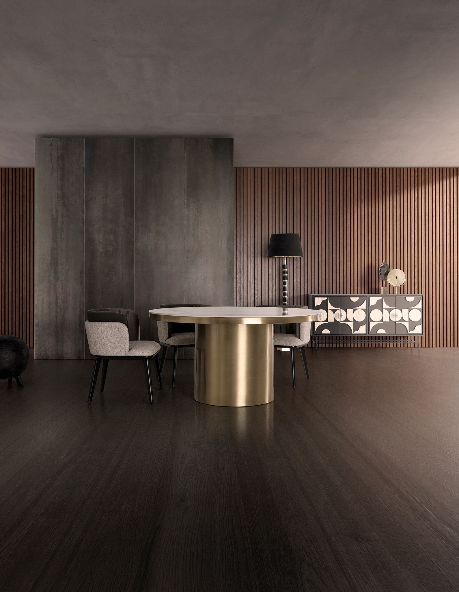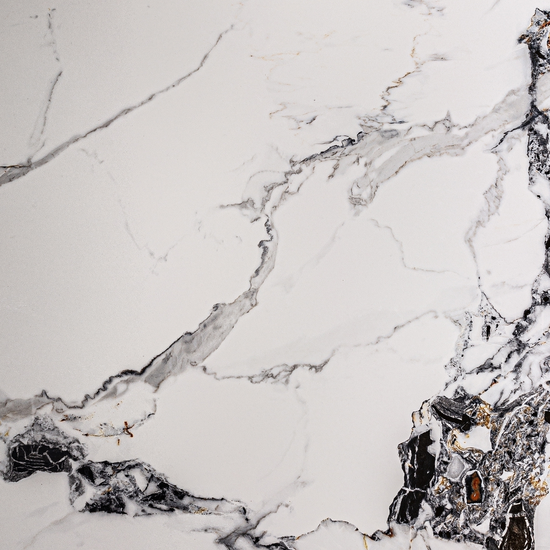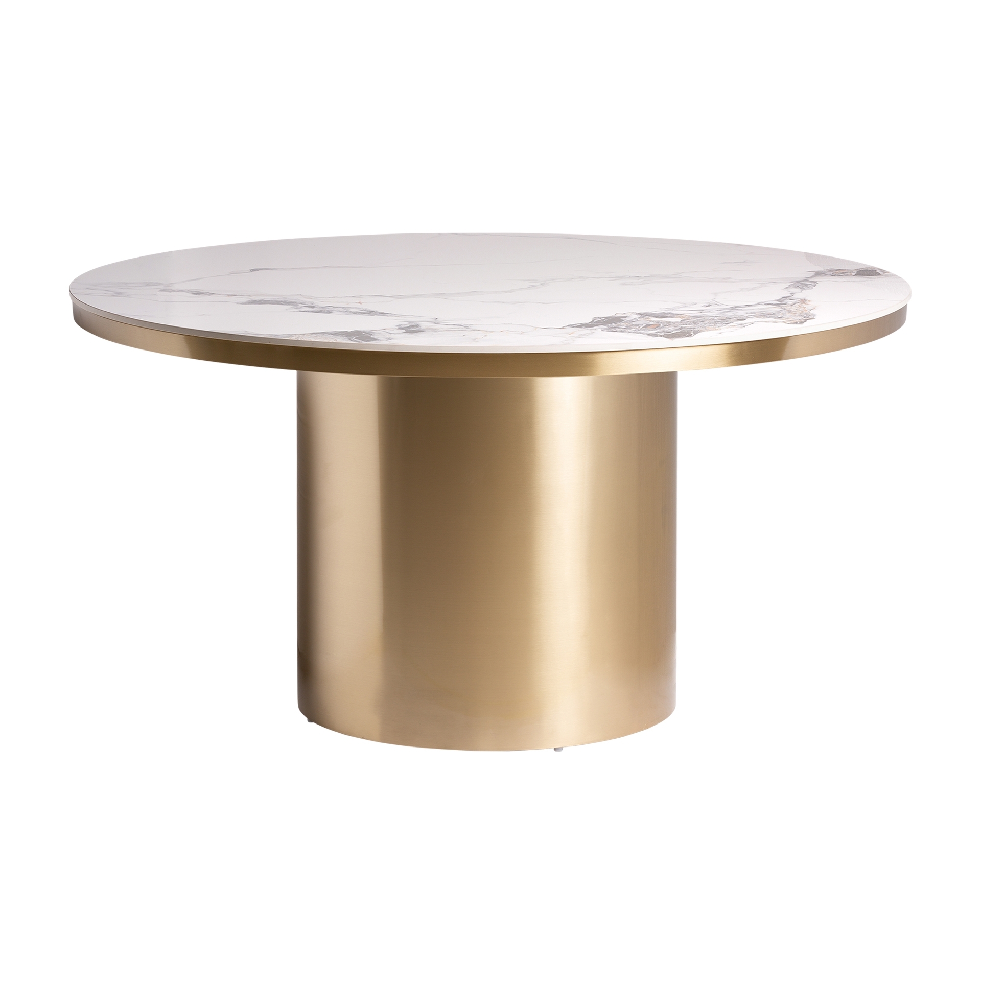 Стол обеденный Astach, цвет бело-золотой, стиль арт-деко. Изготовлен из керамогранита в сочетании со сталью. Съемное изделие.