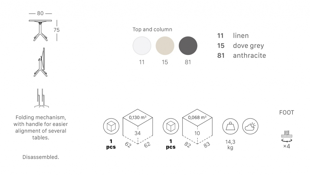 Дизайн:Roberto Semprini. Квадратный складной стол Eco Foldingстанет украшением любого интерьера и обеспечит комфортный прием пищи. Прочность Eco заключается в егоуниверсальной и надежной конструкции, которая вписывается в любую обстановку. Центральная алюминиевая колонна обеспечивает максимальную устойчивость и легкость, а столешница и основание из технополимера демонстрируют свою практичность. Особенности: Квадратная колонна со скошенными углами выполнена из алюминия. Основание подстолья выполнено их технополимера. Столешница выполнена из технополимера. 4 регулируемые ножки. Складной механизмс ручкой позволяет складывать столы в вертикальное положение и экономить место. Данная модель предназначенадля использования на летних площадках, террасах, фудкортах, а также во внутреннем интерьере кафе, ресторанов. Варианты цветаможно выбрать из палитры. Поставляется в разобранном виде. Открыть технические характеристики. Для уточнения всех возможных вариантов материала ицвета данного изделия обращайтесь к нашимменеджерам!
