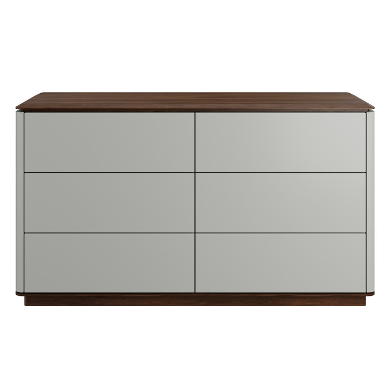 Стильный габаритный комод с шестью ящиками из модной коллекции Altea от бренда MOD Interiors. Комод выполнен из высококачественного МДФ высокой прочности. Отделка корпуса и фасадов - матовый лак приятного светло-серого оттенка. Отделка столешницы и базы - натуральный шпон ореха. Ящики дополнены системой легкого открывания push-to-open (открывание нажатием без ручек). Фасады гладкие, без узора.