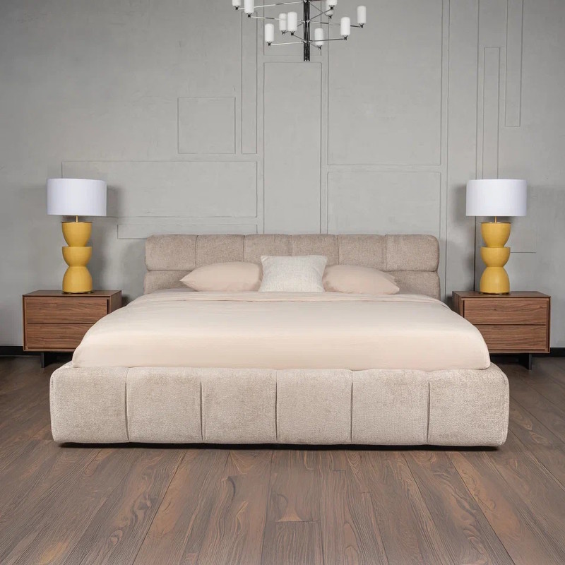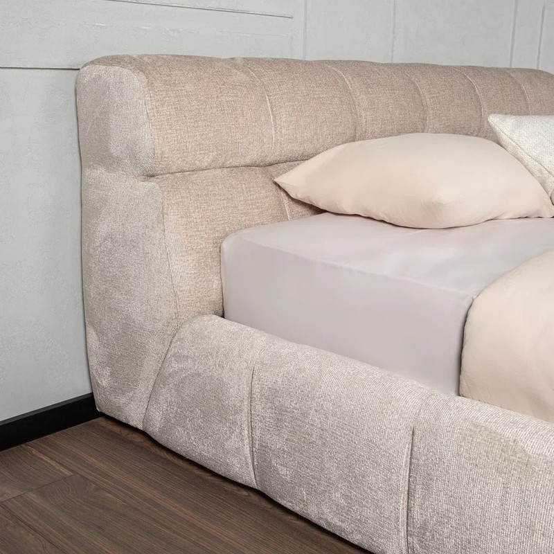 Уникальная кровать Wanda от бренда MOD Interiors. Имеет необычный дизайн изголовья и каркаса в текстиле с вертикальной дизайнерской стяжкой. Отлично подойдет для интерьера спальни в таких стилях, как современный, скандинавский, ваби-саби, джапанди. Размер спального места 180*200 см. Ткань обивки коллекции Genesis - данный обивочный материал имеет отличные показатели по износоустойчивости и плотности. Мягкая меланжевая нить придает натуральность. Объемный ворс делает ткань приятной на ощупь. Безопасный состав для людей с аллергией, болеющих астмой и другими заболеваниями верхних дыхательных путей. Тип ткани – шенилл. Устойчивость к истиранию: >100 000 циклов. Состав ткани: Полиэстер 100 %. Уход за тканью: сухая уборка пылесосом с мягкой щеткой; влажная уборка микрофиброй; не использовать абразивные средства и отбеливатель. Кровать прекрасно сочетается с любой корпусной мебелью фабрики MOD Interiors. Фабрика предлагает более 100 образцов обивки на выбор (микровелюр, шенилл, рогожка). Каркас изготовлен из высококачественной МДФ высокой плотности и березовой фанеры (Россия), многослойного материала, изготавливаемого путём склеивания специально подготовленного шпона. Для повышения прочности фанеры слои шпона накладываются так, чтобы волокна древесины каждого листа были перпендикулярны соседним, поэтому, чтобы направления внешних слоёв совпадали, количество слоёв шпона обычно нечётное: три и более. Ламели решетки изготовлены из 100% массива березы. Задняя часть изголовья обита основной тканью, что позволяет расположить кровать в любой части спальни. Наполнитель: Экологичный пенополиуретан (Россия). Размер спального места 180*200 см. Кровать поставляется без матраса и постельных принадлежностей.