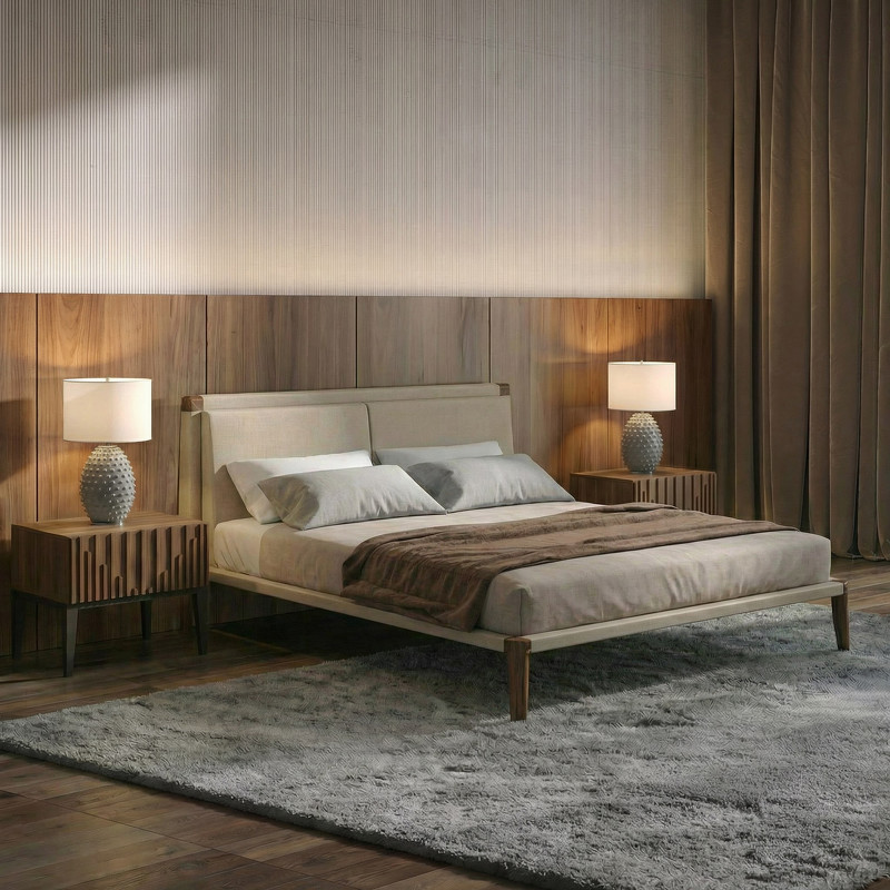 Ответ: Дизайнерский силуэт, декоративные ножки, эффектное изголовье. Натуральный шпон грецкого ореха из Северной Америки, каркас из новозеландского МДФ.