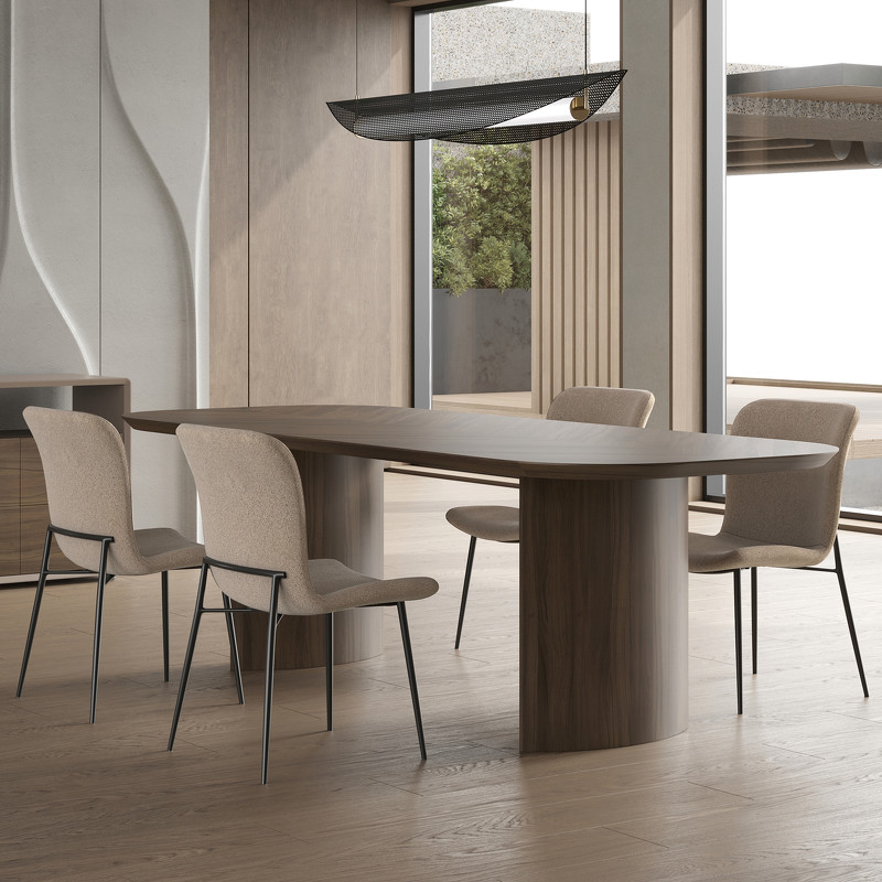 Большой обеденный стол от бренда MOD Interiors в современном стиле является центром столовой. Акцентная выкладка шпона узором Chevron на столешнице делают эту модель уникальной. Рисунок натурального шпона всегда индивидуален. Форма столешницы - мягкий квадрат делает стол максимально эргономичным и безопасным. Ноги в форме лодки придают столу еще более плавных форм. Столешница и ноги стола выполнены из высококачественного, сертифицированного МДФ высокой плотности. Отделка – натуральный шпон северо-американского ореха. Стол фиксированный, не раскладной. За столом комфортно разместится 10-12 человек.