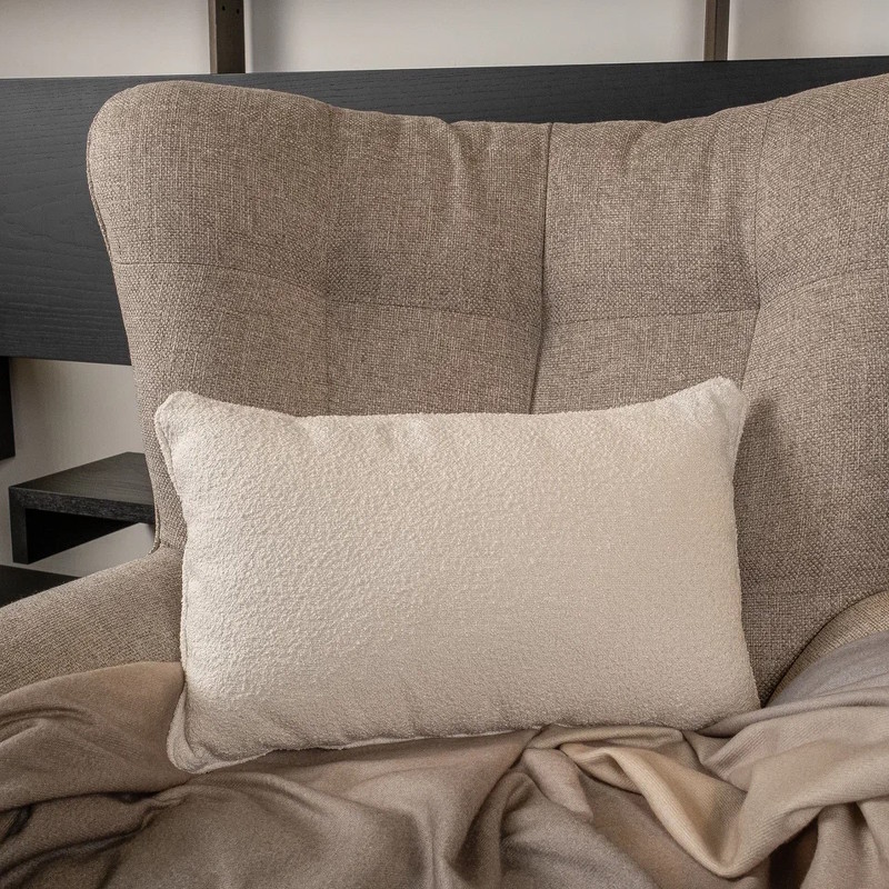 Декоративная прямоугольная подушка в ткани букле белого тона. Наполнитель подушек материалом типа "холофайбер", скатанным в шарики, и, дополнительно, обернуты "холотеком" плотностью 200 г/м2. Ткань из коллекции Loop фактурная, отлично ложится на любые формы мебели. Данный обивочный материал имеет отличные показатели по износоустойчивости и плотности. Узелковая рыхлая структура букле отдаленно напоминает каракуль. Многочисленные завитки на полотне создают неповторимый узор. Приятная и мягкая ткань на ощупь. Безопасный состав для людей с аллергией, болеющих астмой и другими заболеваниями верхних дыхательных путей. Тип ткани: Букле. Устойчивость к истиранию: >100000 циклов. Состав ткани: Полиэстер - 100%. Рекомендации по уходу: Сухая уборка пылесосом с мягкой щеткой; Влажная уборка микрофиброй; Не использовать отбеливатель и абразивные средства.