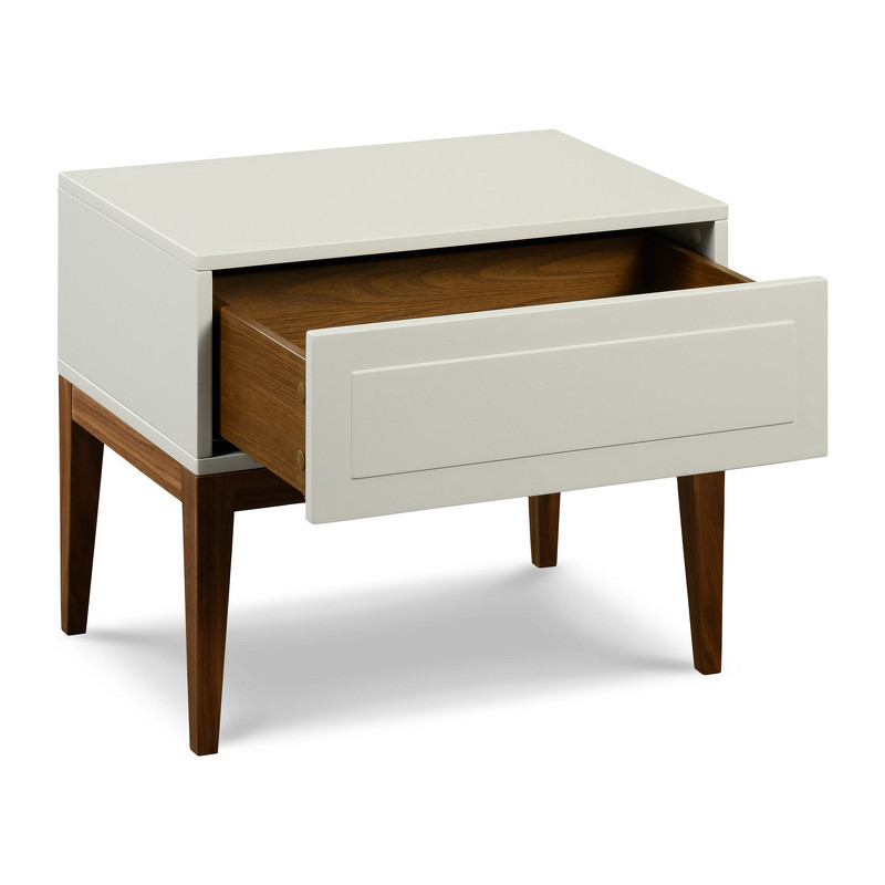 Прикроватная тумбочка с одним ящиком, в сером оттенке, на высоких стройных ножках из коллекции Marbella от известной бренда MOD Interiors. Лаконичная дизайнерская фрезеровка в актуальном стиле. Отделка фасадов — приятный серый матовый оттенок. 100% шпон ореха на высококачественной МДФ высокой плотности. Ножки из шпонированного массива березы — темно-коричневая (почти черная) древесина с натуральным рельефом. Внутри ящика система легкого открывания push-to-open.