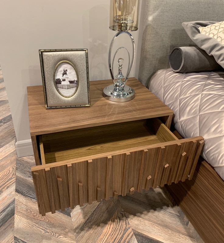 Прикроватная тумбочка от бренда Mod Interiors изготовлена из высококачественного, шпонированного МДФ высокой плотности, металлические ножки. Для производства металлических деталей используется высококачественный металл. Тумбочка оснащена выдвижным ящиком. Фасады декорированы симметричным реечным узором. Все ящики снабжены направляющими системы soft-close. Уникальная система последнего поколения добавляет невероятную плавность открывания/закрывания и высокую динамическую нагрузку.