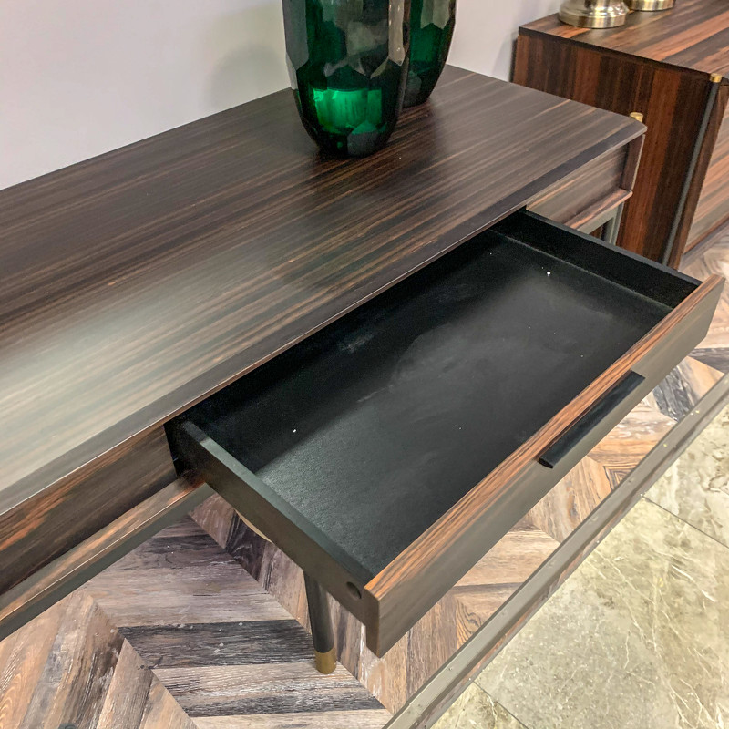 Туалетный столик на высоких ножках от бренда Mod Interiors изготовлен из высококачественного шпонированного МДФ высокой плотности. Ножки изготовлены из металла. Латунные колпачки на ножках и металлические ручки подчеркивают изысканность модели. Столик оснащен выдвижным ящиком. Все ящики снабжены направляющими системы soft-close. Уникальная система последнего поколения добавляет невероятную плавность открывания/закрывания и высокую динамическую нагрузку.