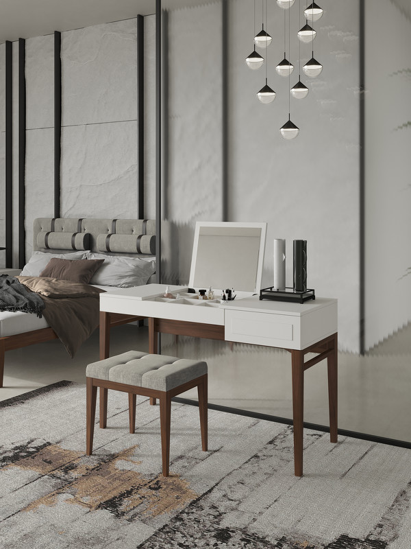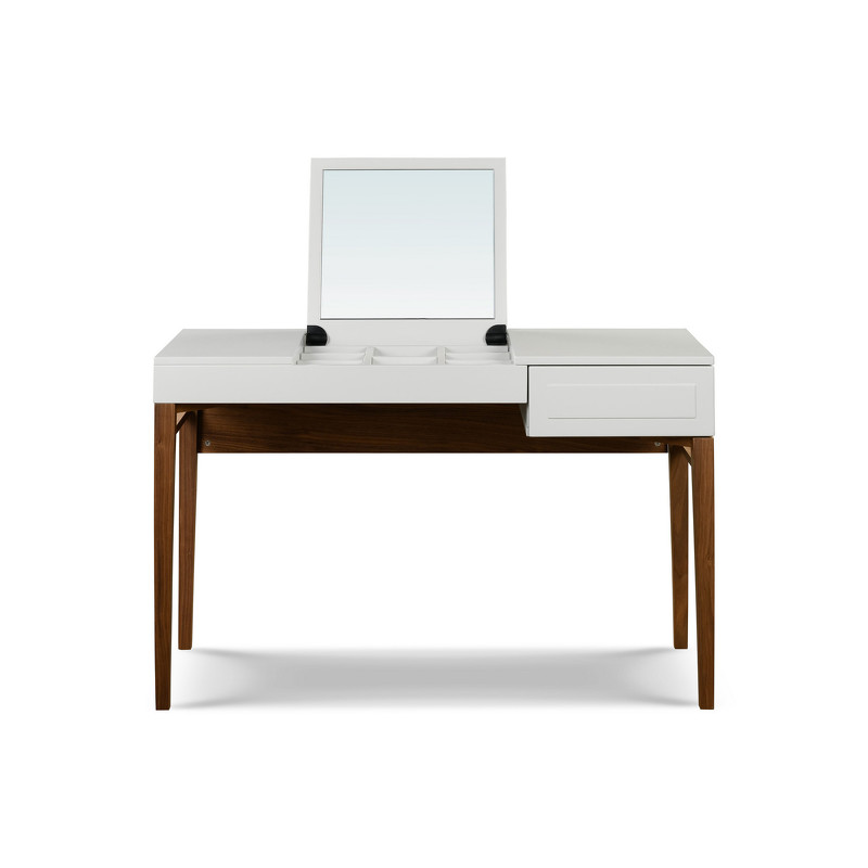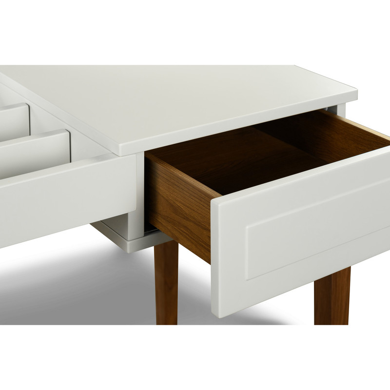 Изящный туалетный столик на высоких стройных ножках из коллекции Marbella от бренда MOD Interiors. Модель дополнена ящиком и откидной крышкой. На внутренней стороне крышки удобное зеркало. Под крышкой расположен место для хранения косметики и украшений. Дизайнерская фрезеровка в лаконичном стиле выглядит очень стильно. Отделка корпуса — матовый лак приятного светло-серого оттенка. корпус изготовлен из высококачественного МДФ класса Е1. База столика из массива дерева в натуральном шпоне ореха. Внутри ящики оснащены системой легкого открывания push-to-open.