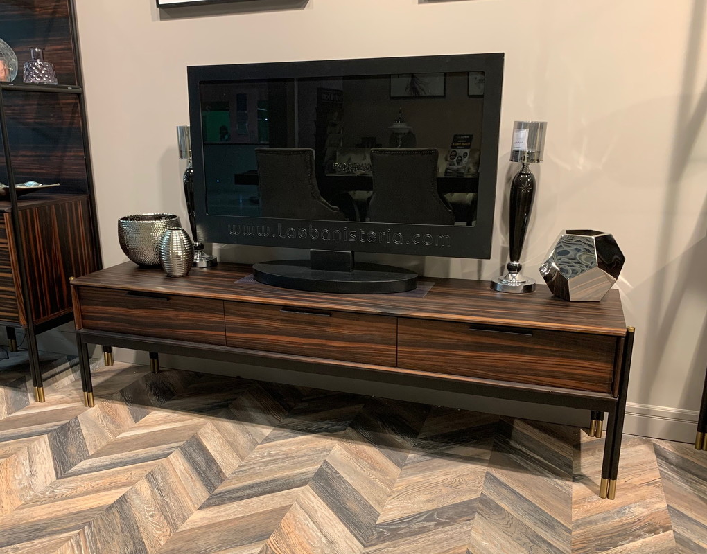 Тумба под TV на высоких ножках от бренда Mod Interiors изготовлена из высококачественного шпонированного МДФ высокой плотности. Металлические ножки с латунными колпачками и металлические ручки подчеркивают изысканность модели. Тумба оснащена тремя выдвижными ящиками. Все ящики снабжены направляющими системы soft-close. Уникальная система последнего поколения добавляет невероятную плавность открывания/закрывания и высокую динамическую нагрузку.