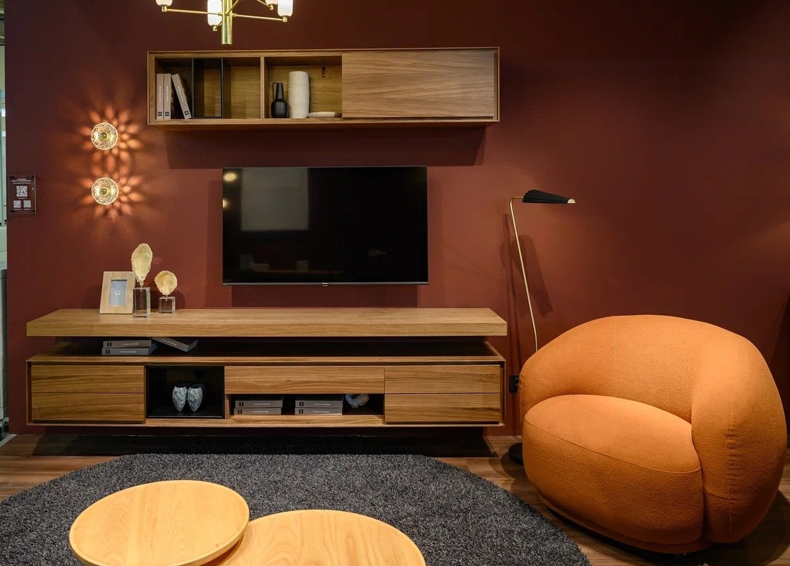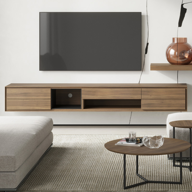Подвесная ТВ тумба Miramar в современном стиле. Рисунок натурального шпона всегда индивидуален, что делает эту модель неповторимой. На фасадах сделан ручной подбор рисунка шпона, что значительно повышает уровень продукта. ТВ тумба выполнена из высококачественного, сертифицированного МДФ высокой плотности. Отделка - натуральный шпон северо-американского ореха. Вставка в открытой полке выполнена из метала и окрашена в черный матовый цвет. ТВ тумба оснащена пятью выдвижными ящиками с механизмом открывания push pull (открывание нажатием). В большой открытой нише на задней стенке есть отверстие для проводов. Необходимо крепить к стене.