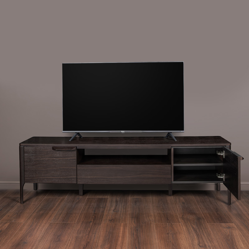 Тумба под ТВ от бренда MOD Interiors прекрасно впишется в интерьер гостиной в современном стиле. Корпус тумбы изготовлен из высококачественного МДФ высокой плотности. Ножки и ручки выполнены из массива дерева. Внутренняя поверхность тумбы и ящиков -меламин. Отделка - натуральный шпон ореха, тонированного в цвет горького шоколада. Тумба оснащена двумя дверками и 1 выдвижным ящиком. Ящик снабжен системой плавного закрывания Soft closing. Для большей устойчивости тумба оснащена двумя дополнительными ножками в углублении. От пола до открытой полки 34 см; Высота открытой полки 14 см, глубина 14 см; Длинна открытой полки 80 см. Глубина выдвижного ящика 6.5 см. От пола до проема 34 см.