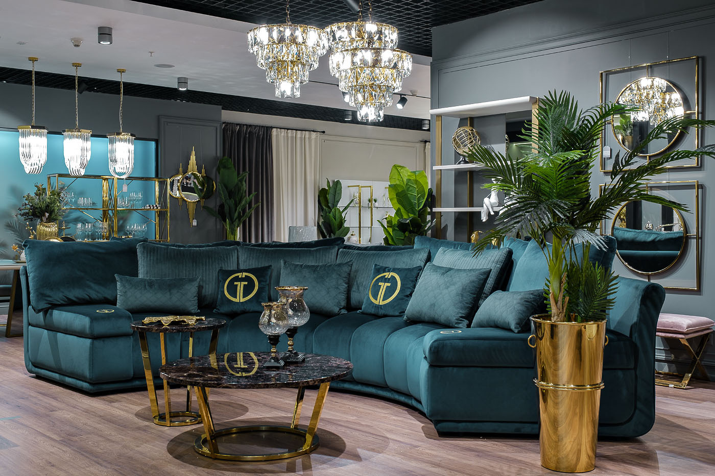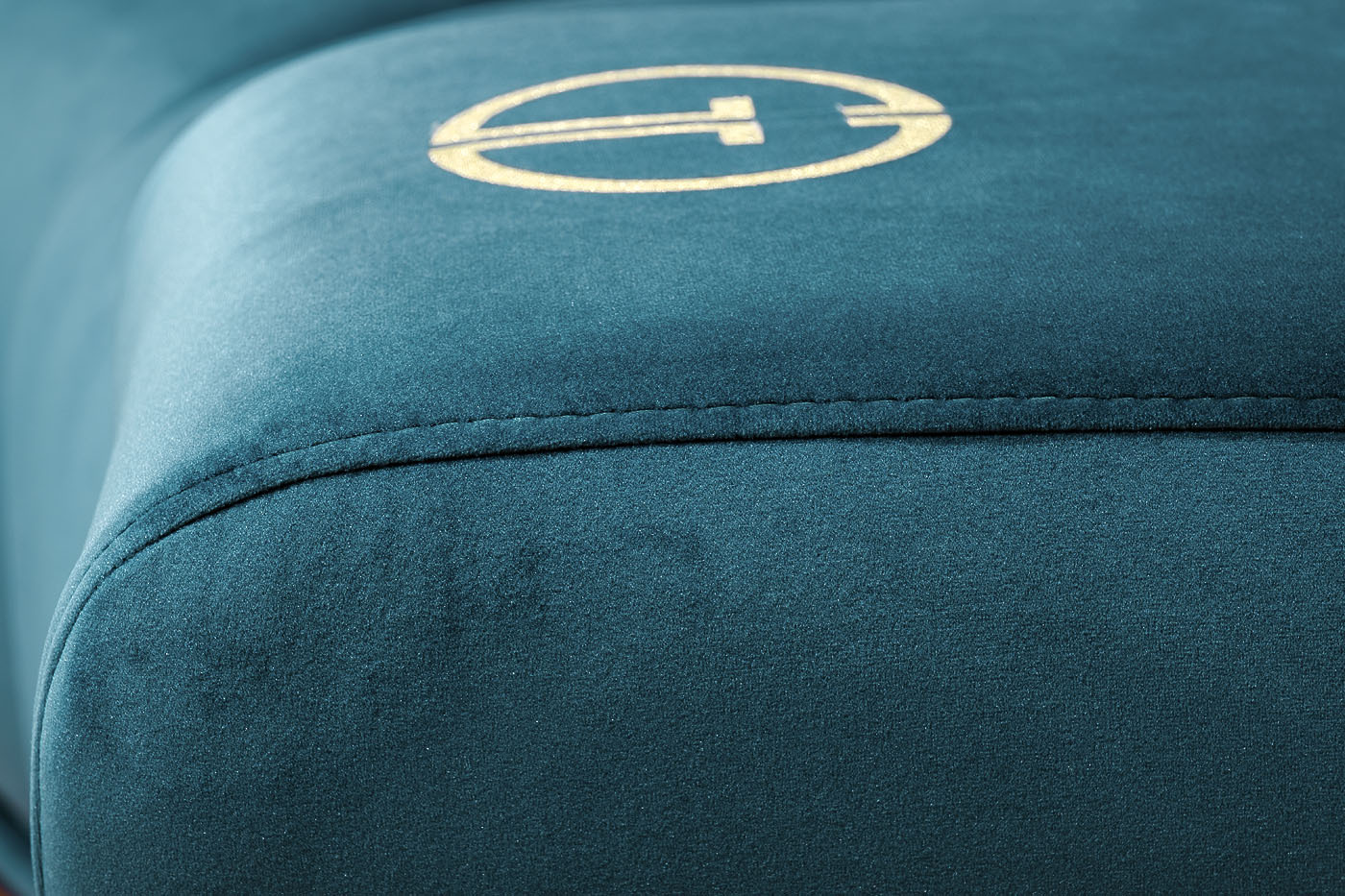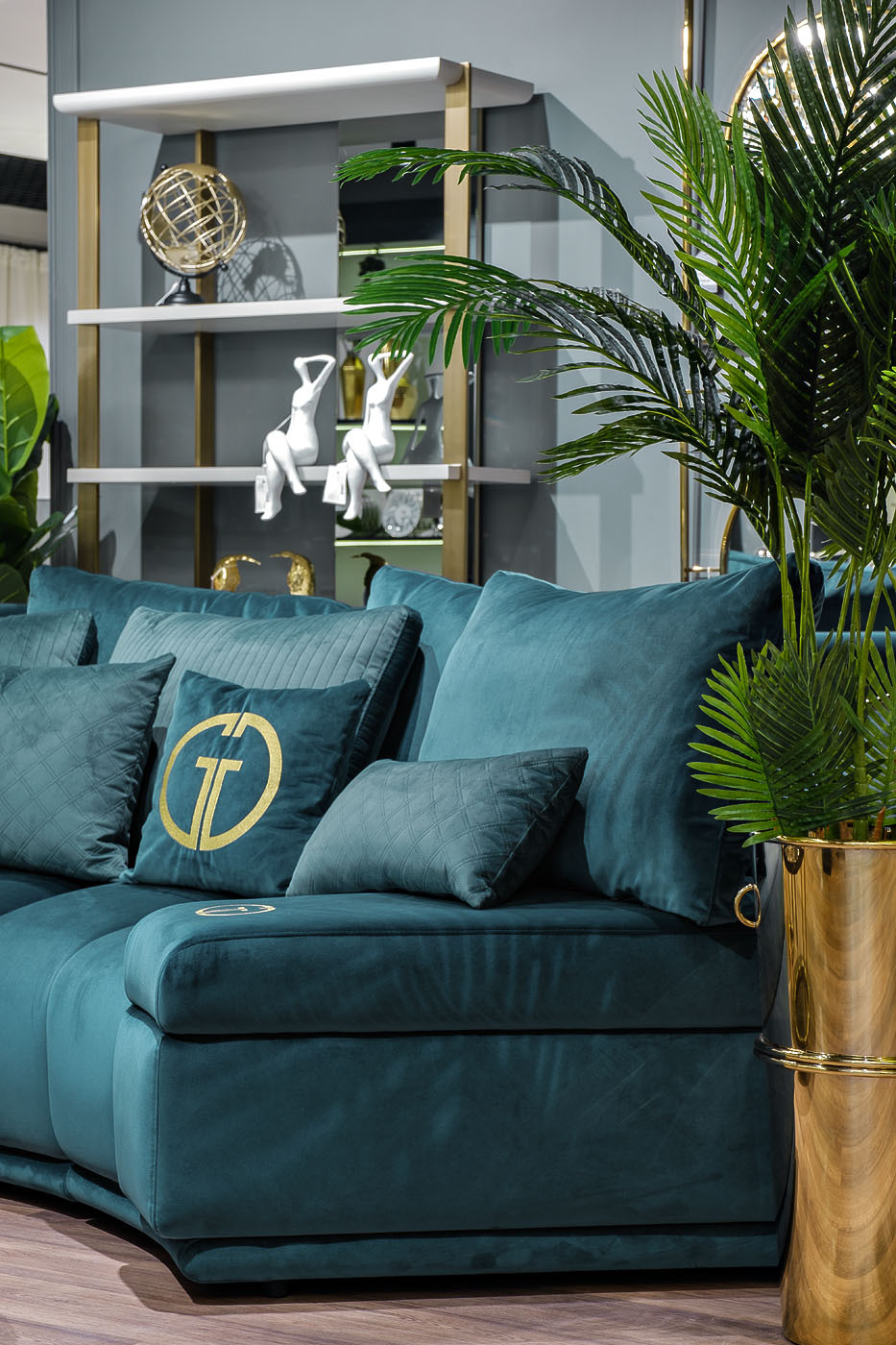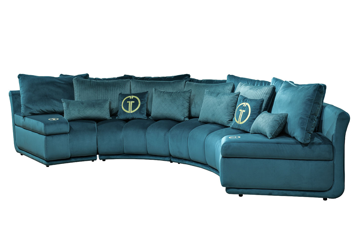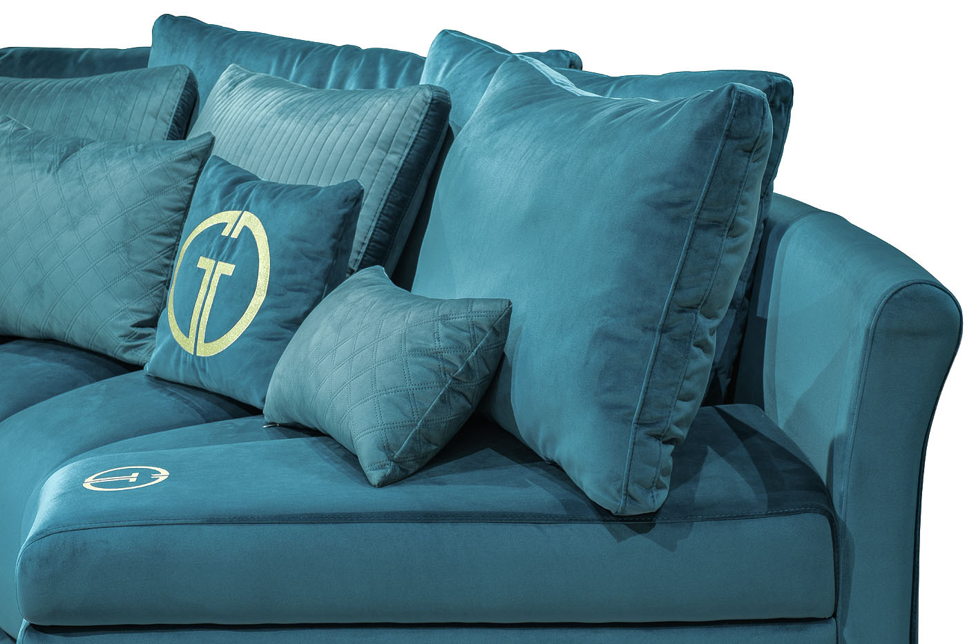 Комплект мебели №5 диван Coliseum модульный. В состав комплекта входит: модуль нейтральный R3 - 2шт в ткани Paddington 20; модуль левый с подлокотником RL - 1шт в ткани Paddington 20; модуль правый с подлокотником RR - 1шт в ткани Paddington 20; подушки спинки №1 107*61см - 7шт в ткани Paddington 20; подушки спинки №2 80*55см - 4шт в ткани Триумф Лайн 12; декоративные подушки №3 62*46см- 2шт в ткани Триумф Квадро 12; декоративные подушки №4 62*32см - 2шт в ткани Paddington 20; декоративные подушки 45*45см с вышивкой - 2шт Paddington 20. На подлокотниках модулей RR и RL вышивка GD эмблема золотыми нитками. Модульный диван COLISEUM должен обязательно завершаться модулем с подлокотниками.Основная ткань комплекта- Paddington 20 бирюза Габариты модульного дивана:длина - 460см; глубина - 203см,высота сиденья- 84см, глубина сиденья- 68см.