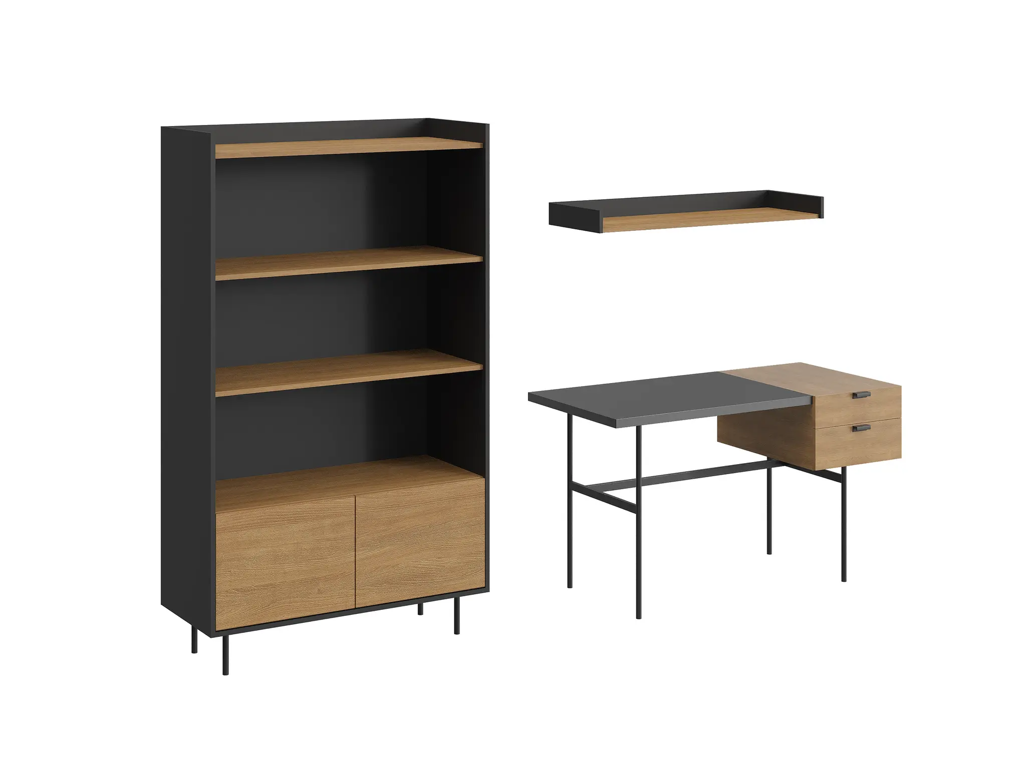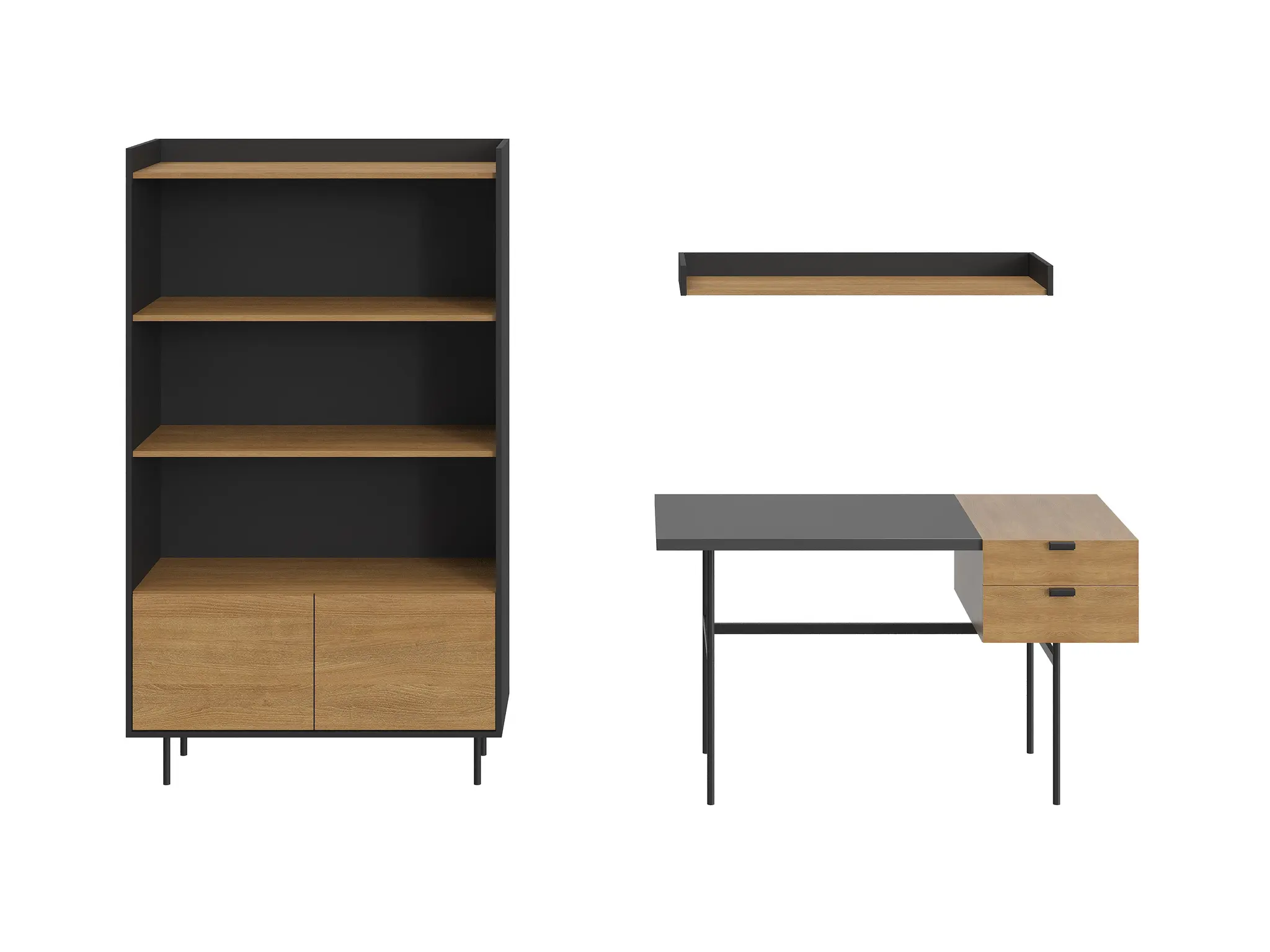 Нижнее и третье снизу отделения разделены вертикальными перегородками. Нижнее отделение закрывают две двери. Материалы ЛДСтП толщиной 16 мм. Опоры – металлические, окрашенные черной эмалью, высотой 160 мм, диаметром 20 мм, с пластиковыми подпятниками. Система открывания дверей - Push-to-Open («нажал-открыл»). Соединительная фурнитура – Hettich. Стеллаж рекомендуется крепить к стене для защиты от опрокидывания (крепежи входят в комплект).